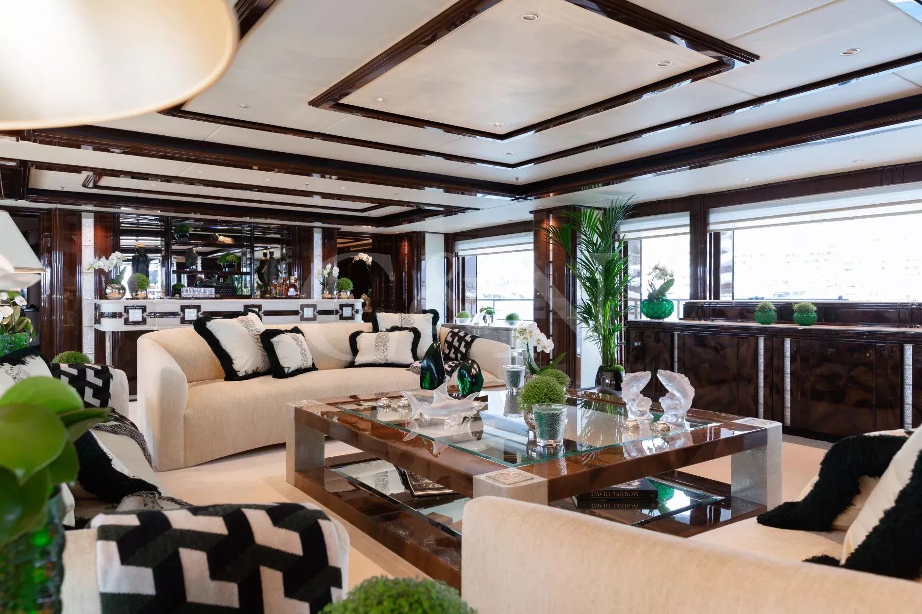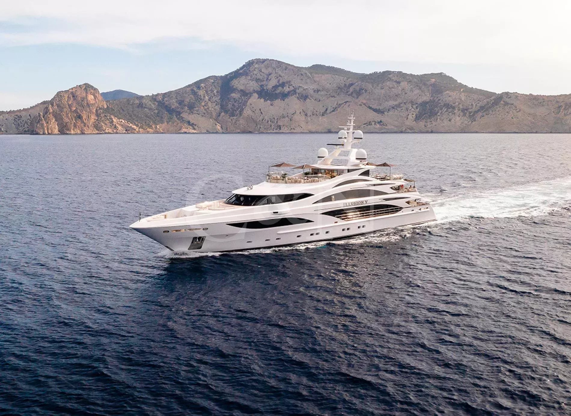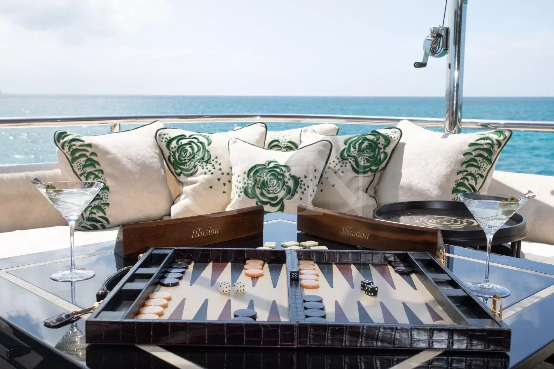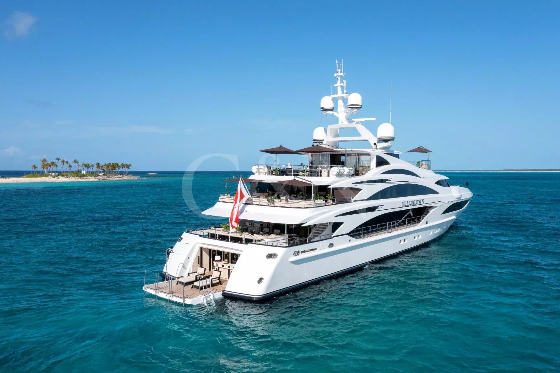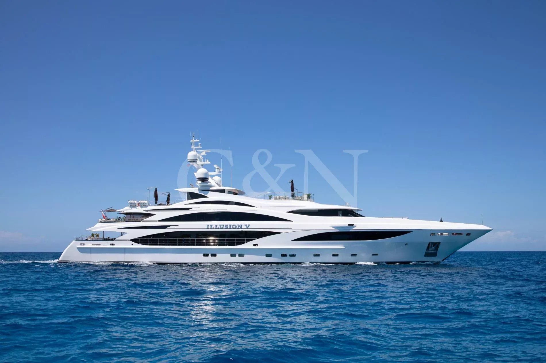 Illusion V is elegant and contemporary, a masterpiece from the celebrated design duo Green and Mingarelli and designed to represent the epitome of elegance. Her contemporary interior incorporates exotic materials such as walnut, onyx, Lalique crystal, parchment and silks, all of which create an inviting backdrop to the stunning vistas viewed from the windows.Built by the famous Italian shipyard, Benetti, and launched in 2014, this 58m superyacht is a truly magnificent charter vessel, with many desirable lifestyle features, such as her top deck Jacuzzi which is surrounded by cushioned sunpads.Illusion V can accommodate up to 12 guests across her six suites. The expansive master cabin has its own private cinema room, and there is a full-beam VIP suite, as well as a further four fantastically-appointed guest suites.Illusion V offers an abundance of dining, entertainment and relaxation areas, all capable of delivering a different ambience for social needs. She also has a full bar and beach area on her lower deck and utilises the latest technology in stability and noise reduction.In all areas, Illusion V's spaces have been carefully planned for optimum privacy and comfort. The sundeck is perfectly set up for at-sea entertaining and plays host to a large Jacuzzi, free-standing sun loungers, a bar and a BBQ.With such a long list of artfully crafted features, as well as an incomparable selection of water toys comprising a jetsurf board, snuba and scuba gear, fishing equipment and inflatables, there is no arguing that Illusion V offers the finest in barefoot luxury. Not for charter to US residents while in US waters.