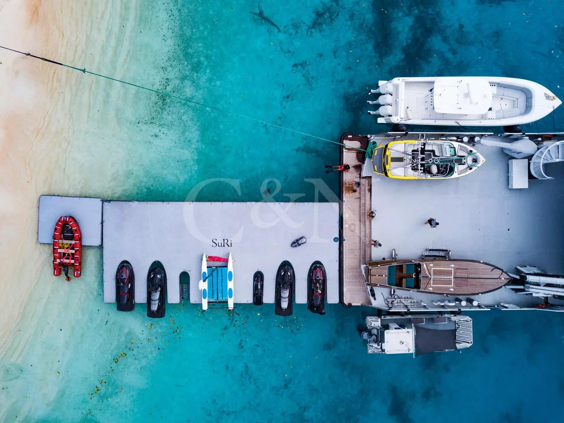 SuRi is arguably the world’s most adventurous charter yacht. This 63.4m marvel boasts go-anywhere, do-anything ability with globe-trotting confidence, having completed multiple circumnavigations.When it comes to superyacht toy collections, SuRi has it all. There are tenders, toys, inflatables, and more at your disposal. SuRi is served by no less than six tenders, including a landing craft Munson Packman, a wakeboard boat, and a centre-console Intrepid. The toy selection comprises every old favourite and new innovation imaginable, with SeaBobs, water skis, scuba diving equipment, various jet skis, kayaks, and surfboards. There are kite surf instructors and dive masters amongst the crew, all keen to guide you as needed and ensure everyone can access the water safely.A major feature of SuRi’s adventurous ability is her helicopter hangar and heli pad. Fly in and fly out as your schedule requires, and take the opportunity for a little extended sightseeing because who says a charter holiday has to mean you’re bound to the boat?! SuRi’s Onboard amenities and experiences champion health and wellbeing. Indulge in massage therapies, centre yourself with yoga and meditation sessions, work your muscles in the dedicated gym and sooth them in the steam room or on-deck Jacuzzi. A beach club provides a gorgeous lounge space at the water’s edge, or get comfy in the incredible underwater viewing room for a window beneath the waves.A charter aboard SuRi could see you tracing the coastline by chopper after breakfast and trekking through the jungle before lunch. Swim with dolphins, scuba dive to the deep blue depths, and speed from the sun deck into the sea via the inflatable slide. From the deck, you have a front-row seat to the sunset – cocktails and canapés will be served in the glass house, and you can dine on deck under the stars. Round off the week with a private performance from a band, flown in specially for the occasion, and dance the night away on the heli pad.SuRi is ideal for mixed groups of friends and multi-generational family use. There is accommodation for 12 guests in seven spacious cabins, with four VIP suites and two cabins convertible between twin and double arrangement. The full-beam master suite has a king-size bed, his-and-hers ensuites with a statement bathtub and steam shower, and the suite benefits from an adjacent private lounge and study. Each of the guest cabins has an enormous picture window for unobstructed views and is equipped with a full ensuite bathroom. For those who wish to travel with personal staff or supernumeraries, additional cabins are available.The interior styling aboard SuRi is sophisticated and chic, with an understated luxury found in each finite attention to detail. Comfort is king and each space is unique – the observation lounge places the emphasis on the view with enormous panels of glazing. The sky lounge seeks to bring a homely, beach house vibe with deep-cushioned sofas, and the glass house ensures you can embrace the elements in all conditions.Meals can be enjoyed al fresco on the sun deck or served as an evening banquet at the formal dining table. SuRi has an award-winning chef who’s on hand for every occasion – even the beach barbeques are a flavourful feast!SuRi’s experienced and longstanding crew pride themselves on delivering an unforgettable charter experience, helping their guests discover some of the world’s most beautiful destinations and adventuring beyond the norm. SuRi is not simply a charter yacht; she is a gateway to the incredible.