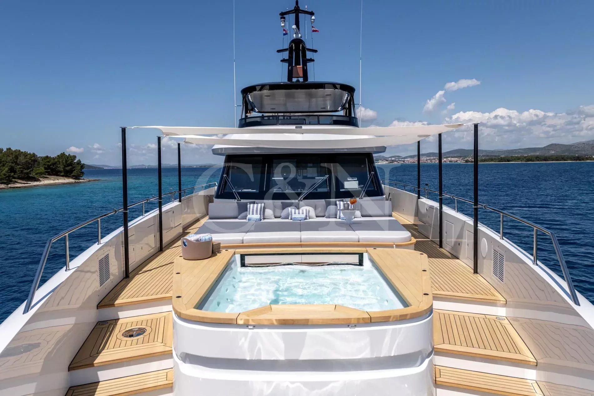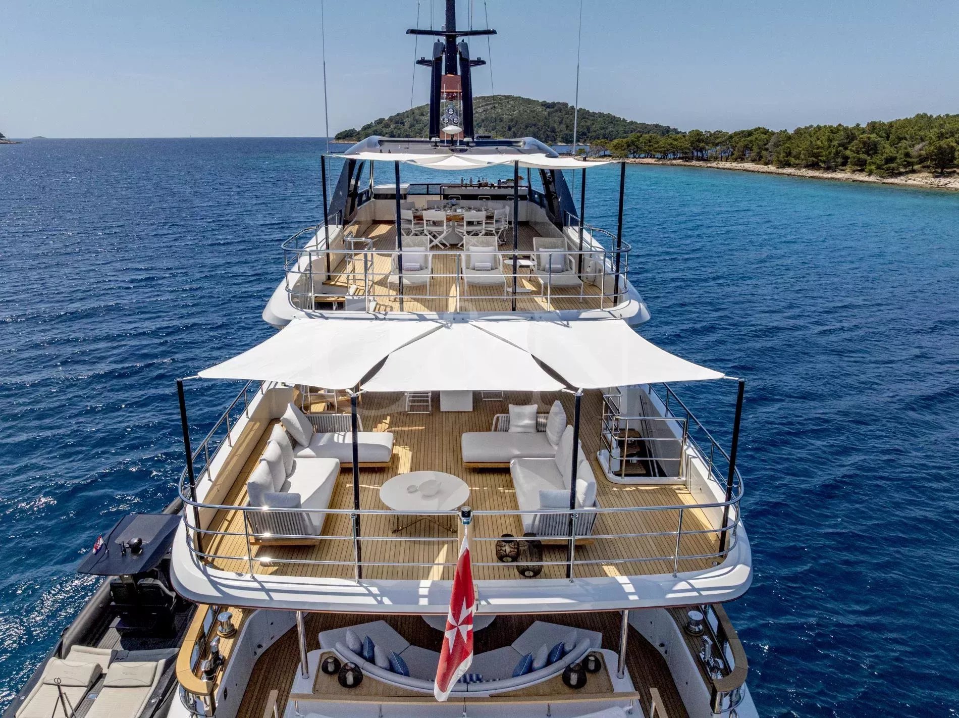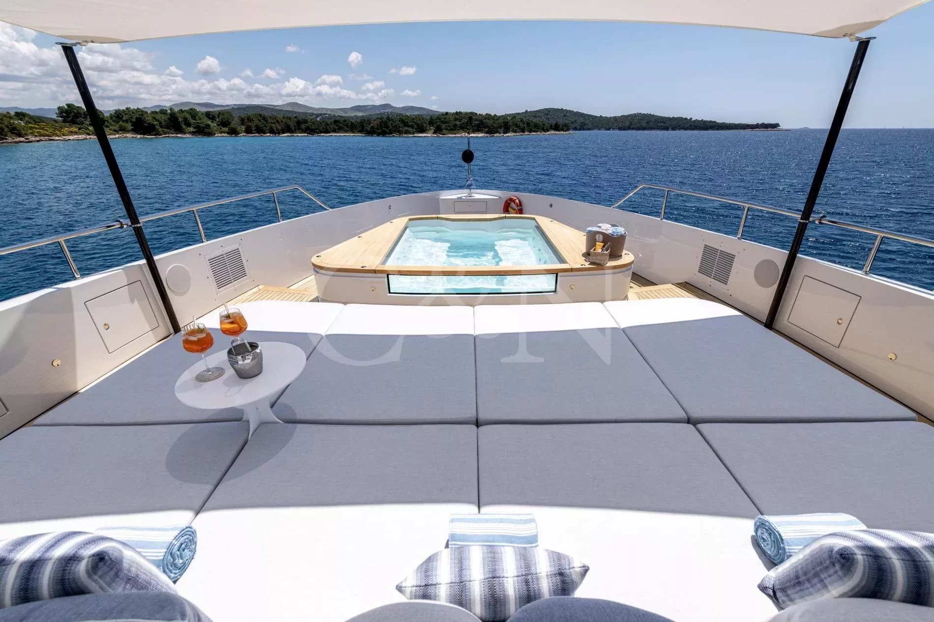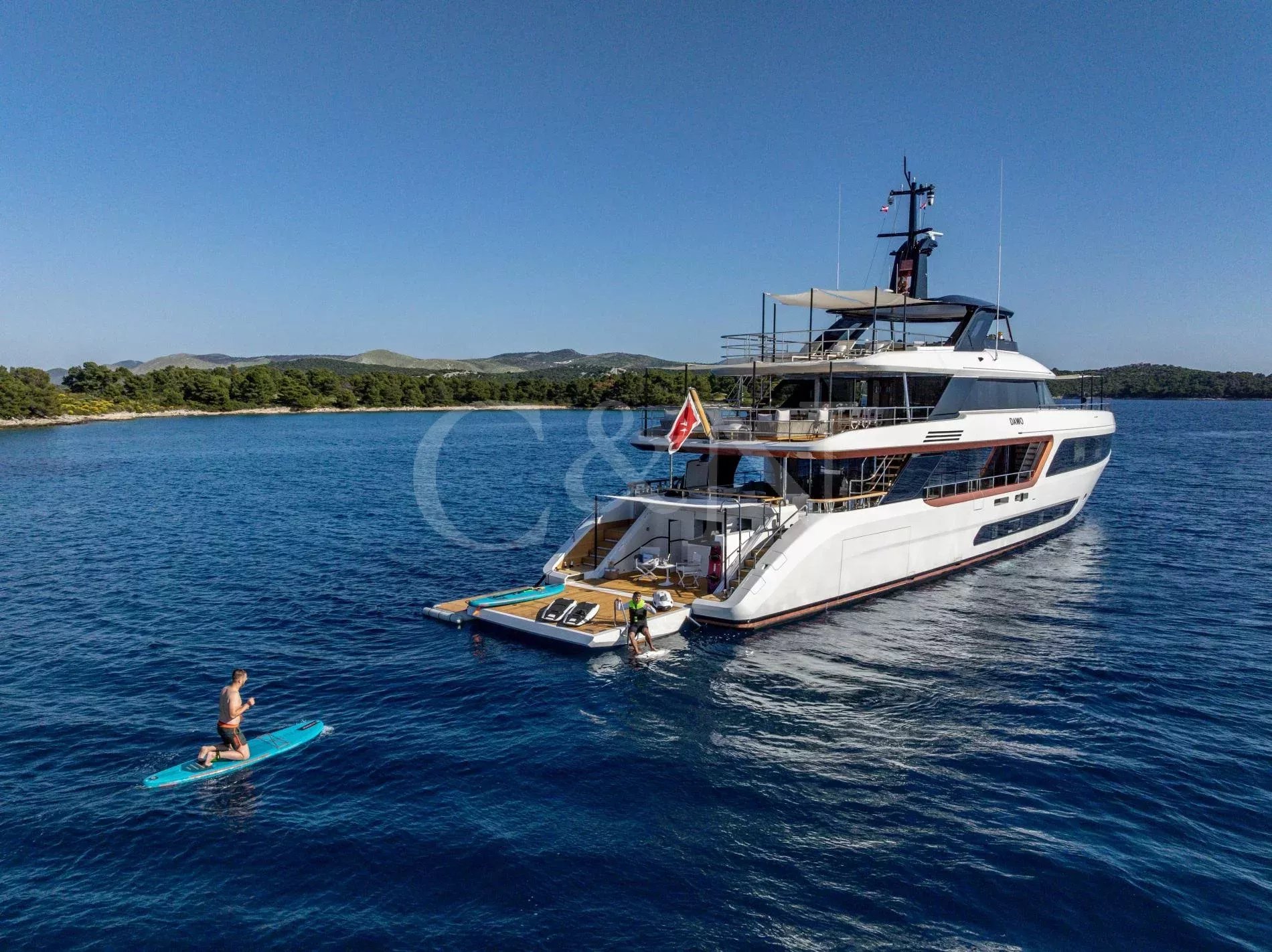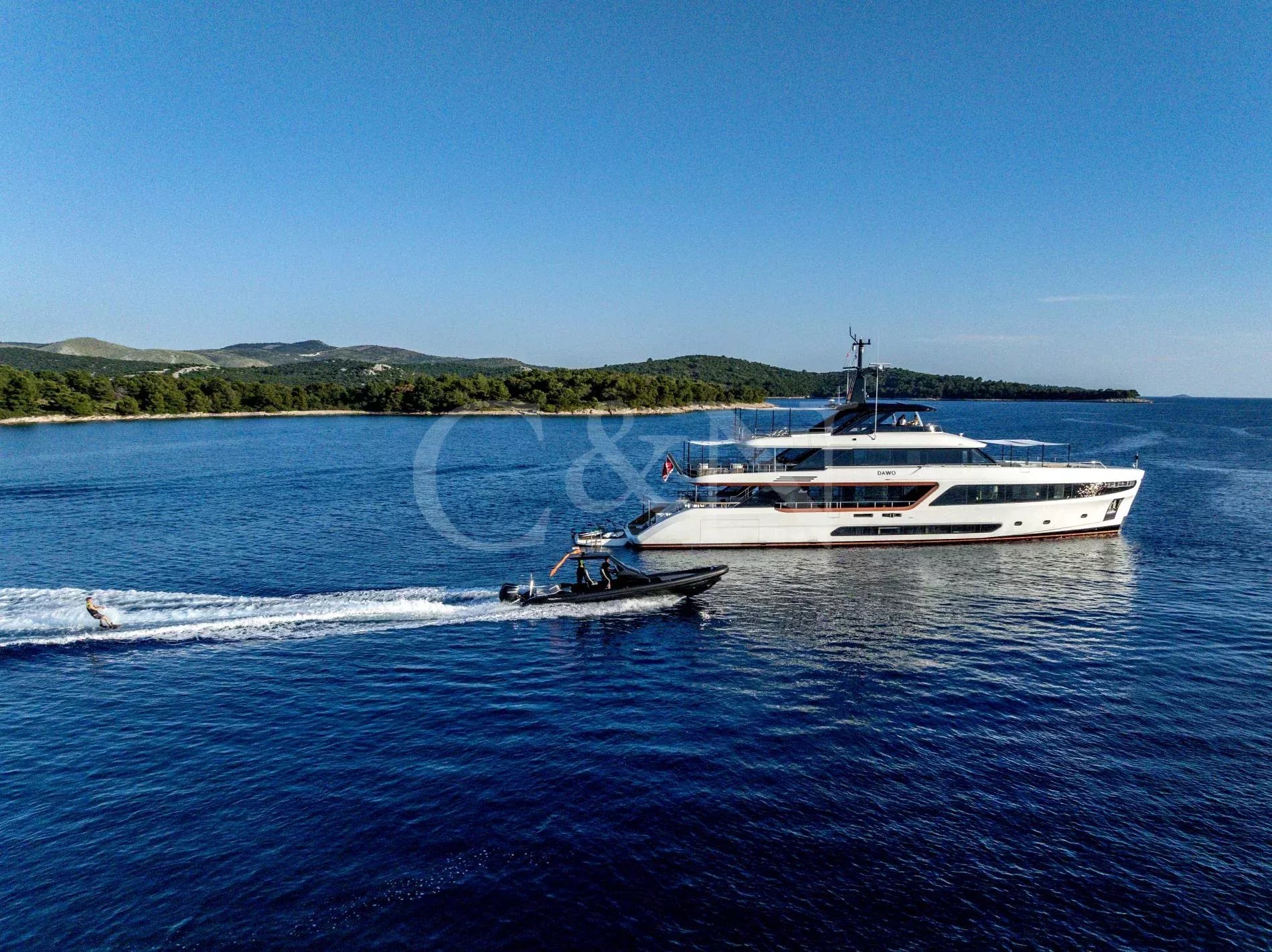 DAWO is the latest 37m Motopanfilo model from Benetti and is brand new to the charter fleet. DAWO's eye-catching and dynamic exterior looks are sure to turn heads and within, her interior offers a spacious and beautifully designed haven for relaxing, socialising, and spending quality time with family and friends.DAWO has accommodation for 11 guests in five ensuite cabins and operates with a crew of seven. The master suite is located on the main deck and benefits from his-and-hers bathrooms adjoined by a walk-through shower. The guest cabins on the lower deck comprise two VIP suites, one cabin convertible between twin and double arrangement, and twin cabin with additional Pullman bunk.The light and open main saloon is flanked by floor-to-ceiling panels of glass on both the port and starboard sides, allowing an incredible influx of natural light and visual connection with one’s surroundings. This space is open plan to the interior dining area and sliding glass doors provide direct access to the aft deck and exterior lounge space.The yacht’s design plays on Benetti’s iconic 1960s Motopanfilo model. This reimagined version celebrates this iconic look and Benetti’s heritage, and blends it with modern superyacht style. The interior décor extensively features Loro Piana fabrics with a contemporary elegance and there’s a subtle nod to a nautical colour scheme.A second skylounge saloon resides on the upper deck. To aft, is an impressive alfresco dining table that enjoys the shade of the deck above whilst ensuring you dine with a view. The setup lends itself beautifully to pre or post dinner cocktails in the lounge, all with uninterrupted, elevated views.DAWO's inviting foredeck whirlpool can be enjoyed by day or night and sits adjacent to a huge bank of cushioned sun pads with optional canopy shade. The crowning jewel of DAWO's deck spaces, is surely her sun deck where there are more sun pads, an alfresco dining table for long, lazy lunches, and a bar counter to serve up sundowner cocktails.DAWO's fold-down stern transom creates a huge terrace at the water’s edge, permitting easy access to and from the water and further lounge space. It’s big enough to swing a golf club!DAWO has a top speed of 17 knots and cruises comfortably at 12.5 knots.