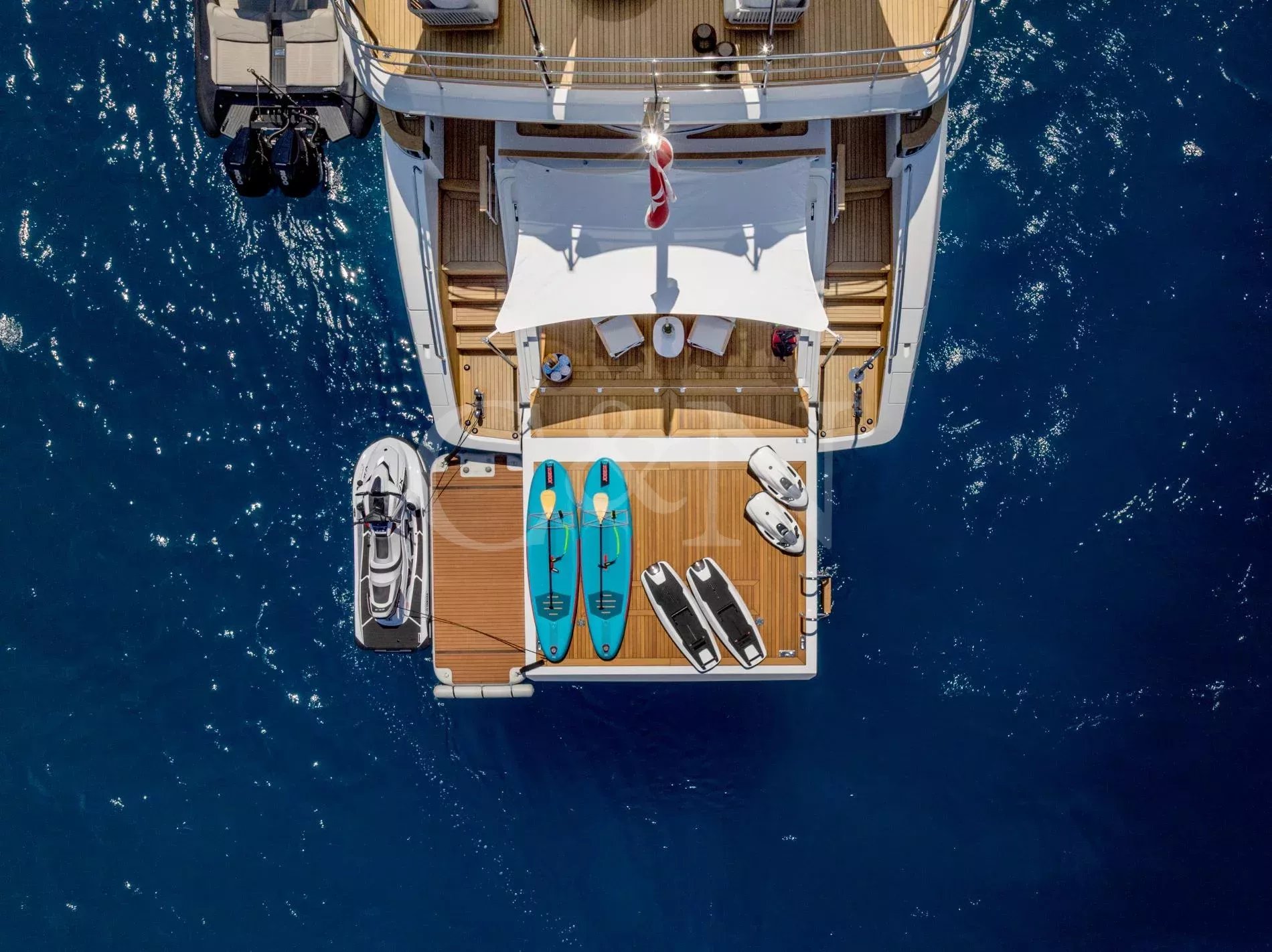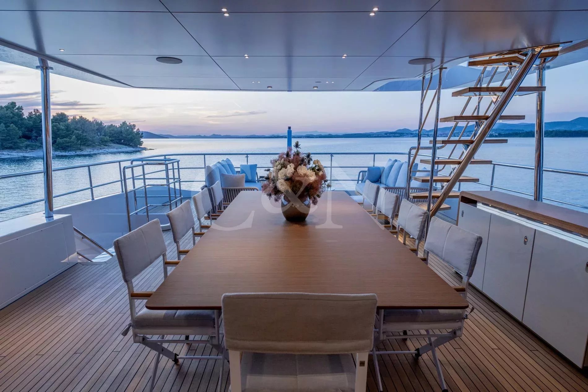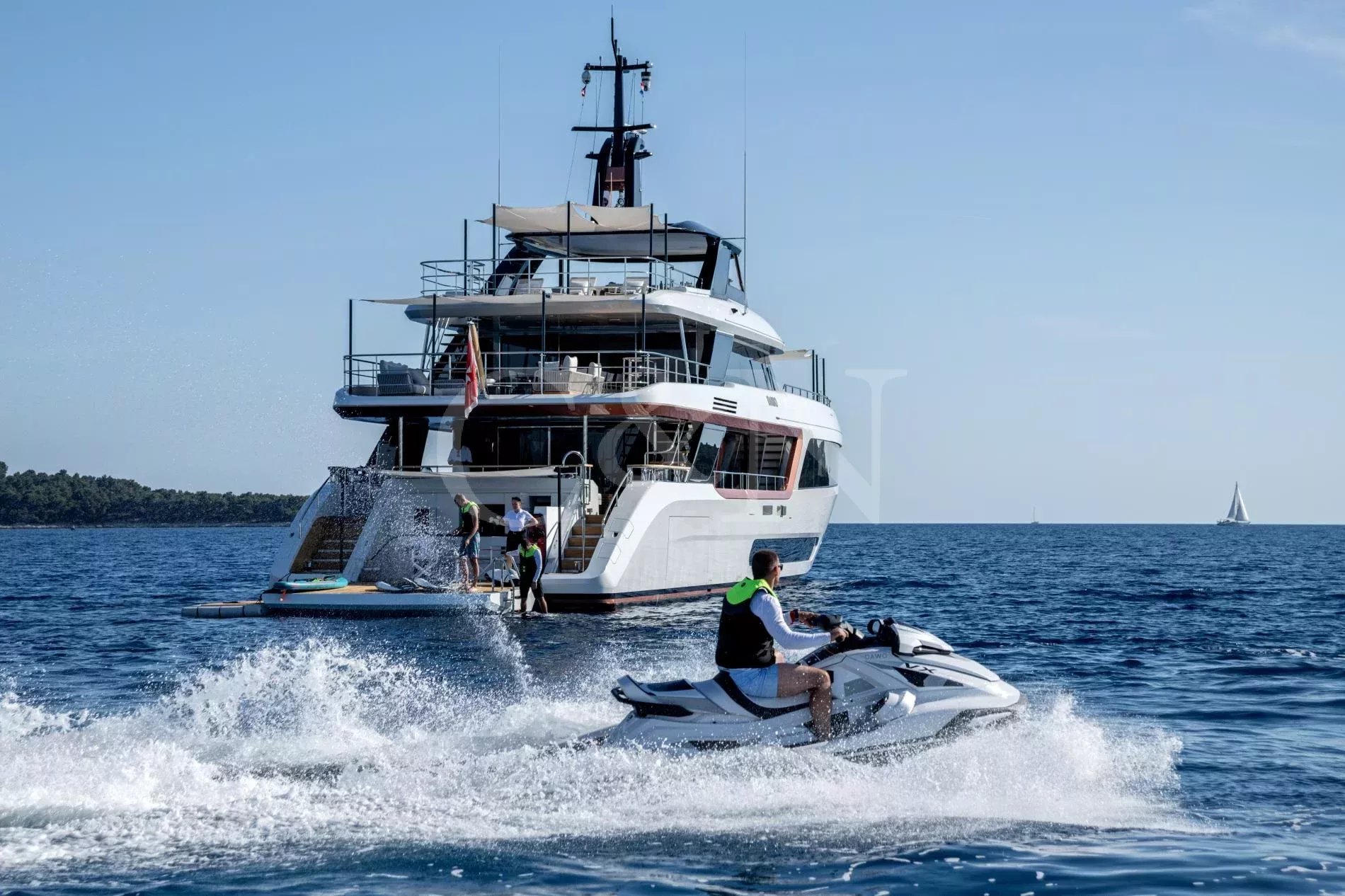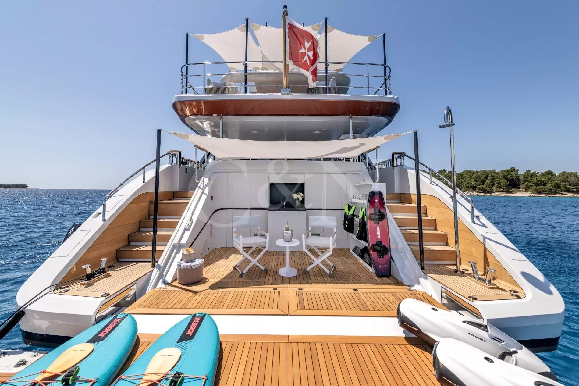 DAWO is the latest 37m Motopanfilo model from Benetti and is brand new to the charter fleet. DAWO's eye-catching and dynamic exterior looks are sure to turn heads and within, her interior offers a spacious and beautifully designed haven for relaxing, socialising, and spending quality time with family and friends.DAWO has accommodation for 11 guests in five ensuite cabins and operates with a crew of seven. The master suite is located on the main deck and benefits from his-and-hers bathrooms adjoined by a walk-through shower. The guest cabins on the lower deck comprise two VIP suites, one cabin convertible between twin and double arrangement, and twin cabin with additional Pullman bunk.The light and open main saloon is flanked by floor-to-ceiling panels of glass on both the port and starboard sides, allowing an incredible influx of natural light and visual connection with one’s surroundings. This space is open plan to the interior dining area and sliding glass doors provide direct access to the aft deck and exterior lounge space.The yacht’s design plays on Benetti’s iconic 1960s Motopanfilo model. This reimagined version celebrates this iconic look and Benetti’s heritage, and blends it with modern superyacht style. The interior décor extensively features Loro Piana fabrics with a contemporary elegance and there’s a subtle nod to a nautical colour scheme.A second skylounge saloon resides on the upper deck. To aft, is an impressive alfresco dining table that enjoys the shade of the deck above whilst ensuring you dine with a view. The setup lends itself beautifully to pre or post dinner cocktails in the lounge, all with uninterrupted, elevated views.DAWO's inviting foredeck whirlpool can be enjoyed by day or night and sits adjacent to a huge bank of cushioned sun pads with optional canopy shade. The crowning jewel of DAWO's deck spaces, is surely her sun deck where there are more sun pads, an alfresco dining table for long, lazy lunches, and a bar counter to serve up sundowner cocktails.DAWO's fold-down stern transom creates a huge terrace at the water’s edge, permitting easy access to and from the water and further lounge space. It’s big enough to swing a golf club!DAWO has a top speed of 17 knots and cruises comfortably at 12.5 knots.