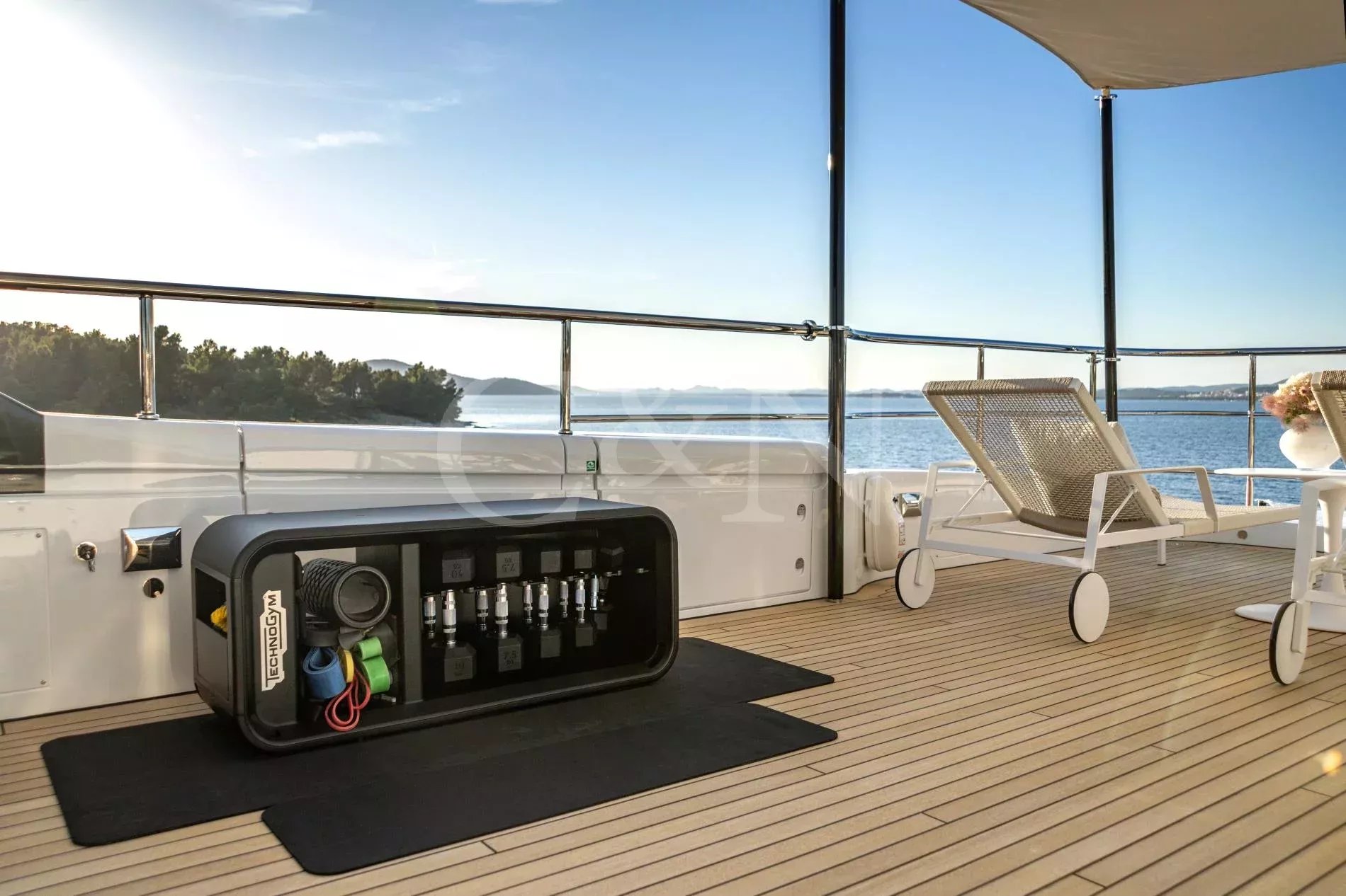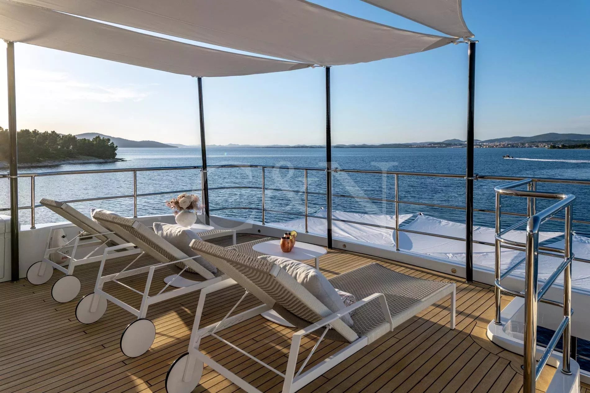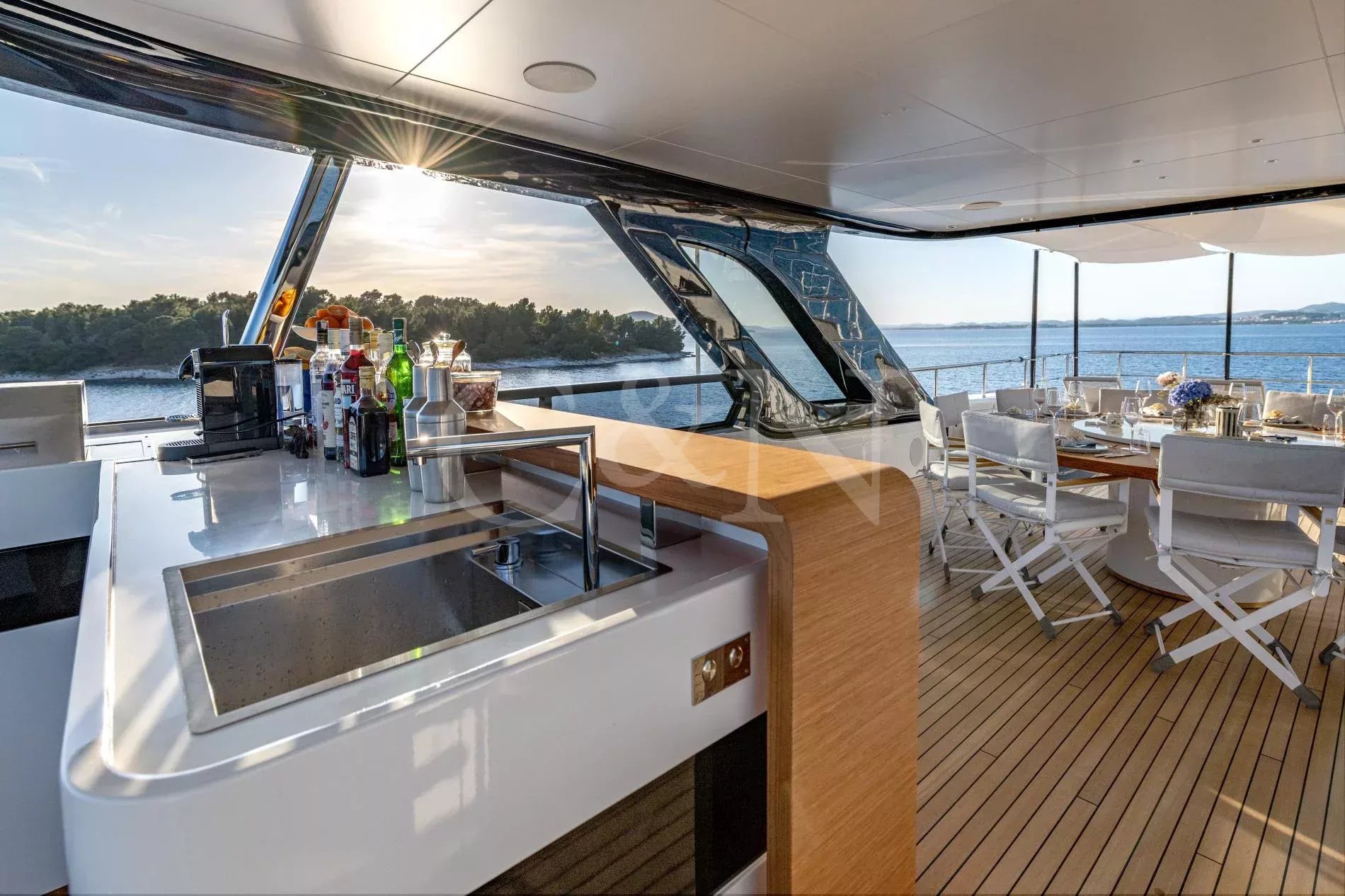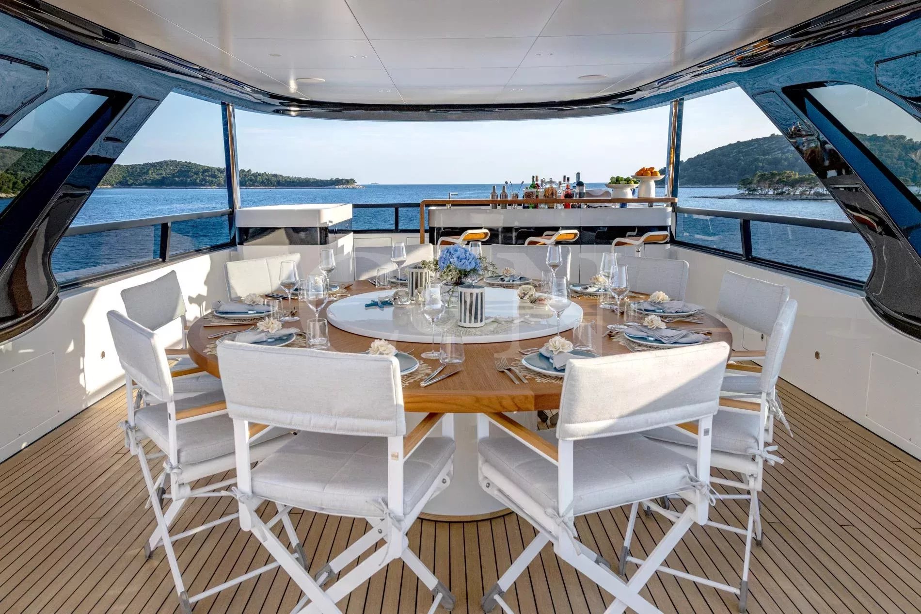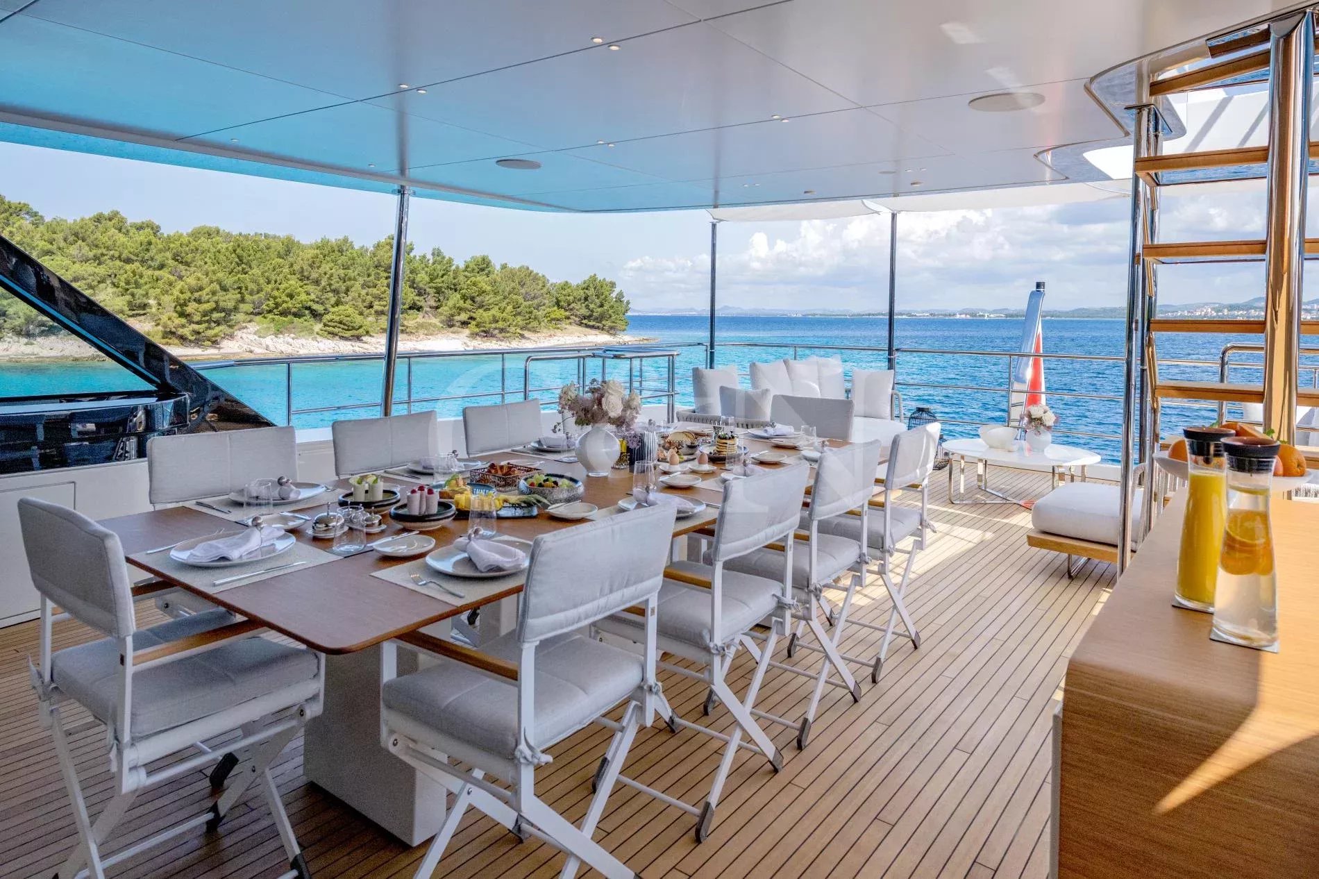 DAWO is the latest 37m Motopanfilo model from Benetti and is brand new to the charter fleet. DAWO's eye-catching and dynamic exterior looks are sure to turn heads and within, her interior offers a spacious and beautifully designed haven for relaxing, socialising, and spending quality time with family and friends.DAWO has accommodation for 11 guests in five ensuite cabins and operates with a crew of seven. The master suite is located on the main deck and benefits from his-and-hers bathrooms adjoined by a walk-through shower. The guest cabins on the lower deck comprise two VIP suites, one cabin convertible between twin and double arrangement, and twin cabin with additional Pullman bunk.The light and open main saloon is flanked by floor-to-ceiling panels of glass on both the port and starboard sides, allowing an incredible influx of natural light and visual connection with one’s surroundings. This space is open plan to the interior dining area and sliding glass doors provide direct access to the aft deck and exterior lounge space.The yacht’s design plays on Benetti’s iconic 1960s Motopanfilo model. This reimagined version celebrates this iconic look and Benetti’s heritage, and blends it with modern superyacht style. The interior décor extensively features Loro Piana fabrics with a contemporary elegance and there’s a subtle nod to a nautical colour scheme.A second skylounge saloon resides on the upper deck. To aft, is an impressive alfresco dining table that enjoys the shade of the deck above whilst ensuring you dine with a view. The setup lends itself beautifully to pre or post dinner cocktails in the lounge, all with uninterrupted, elevated views.DAWO's inviting foredeck whirlpool can be enjoyed by day or night and sits adjacent to a huge bank of cushioned sun pads with optional canopy shade. The crowning jewel of DAWO's deck spaces, is surely her sun deck where there are more sun pads, an alfresco dining table for long, lazy lunches, and a bar counter to serve up sundowner cocktails.DAWO's fold-down stern transom creates a huge terrace at the water’s edge, permitting easy access to and from the water and further lounge space. It’s big enough to swing a golf club!DAWO has a top speed of 17 knots and cruises comfortably at 12.5 knots.