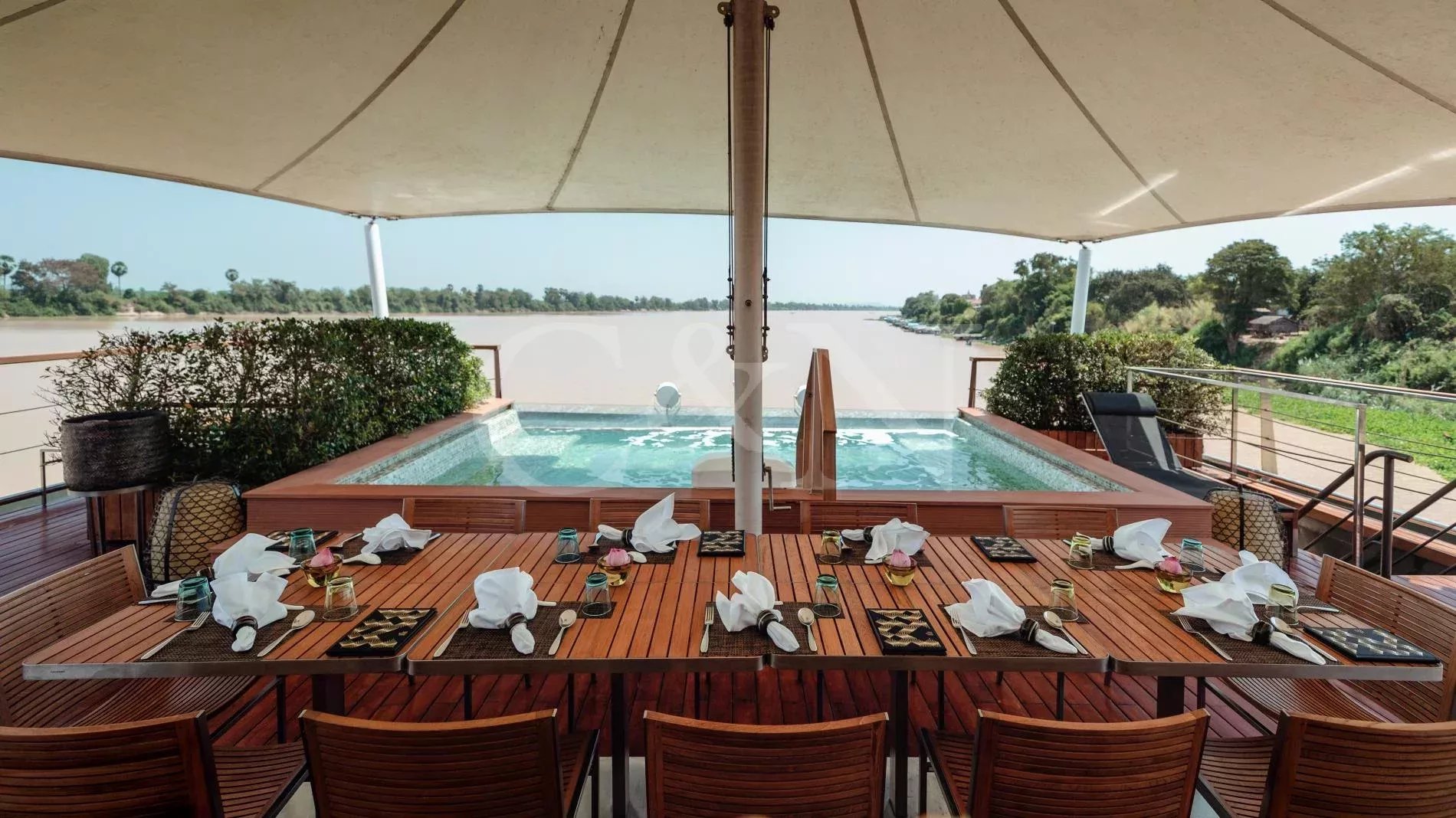 Guests can also find a boutique shop on board selling Cambodian and Vietnamese handicrafts, indoor and outdoor cinema facilities, games room, gym and a forward-facing infinity pool with cabanas on the top deck.