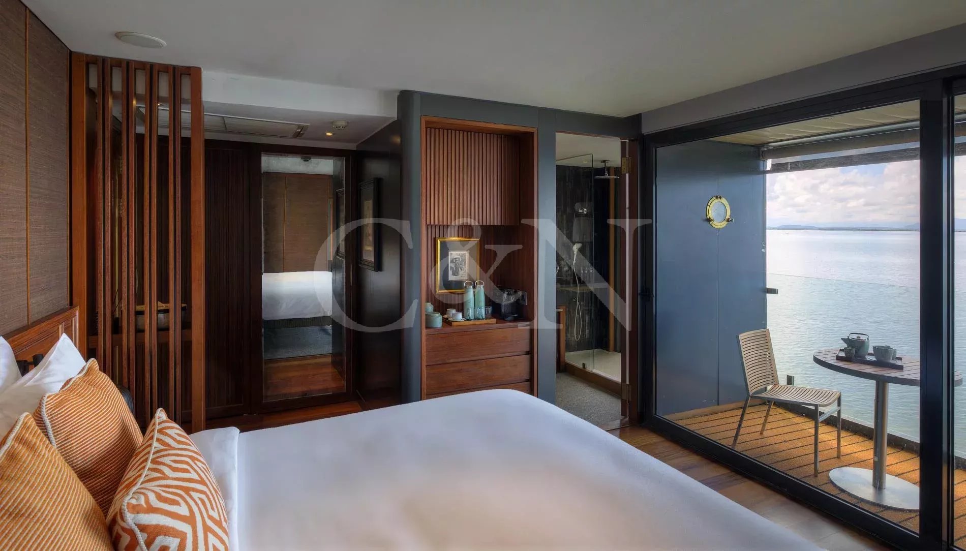 Aqua Mekong's 20 guest suites are all outward-facing with floor-to-ceiling panoramic windows, giving every cabin a front-row view of this world-famous river. Each suite has either an outside balcony or an interior daybed, so guests can enjoy the river at eye level from the privacy of their suite. Some suites can also be interconnected to create one larger suite for family use or the additional suite can be configured as a private lounge.