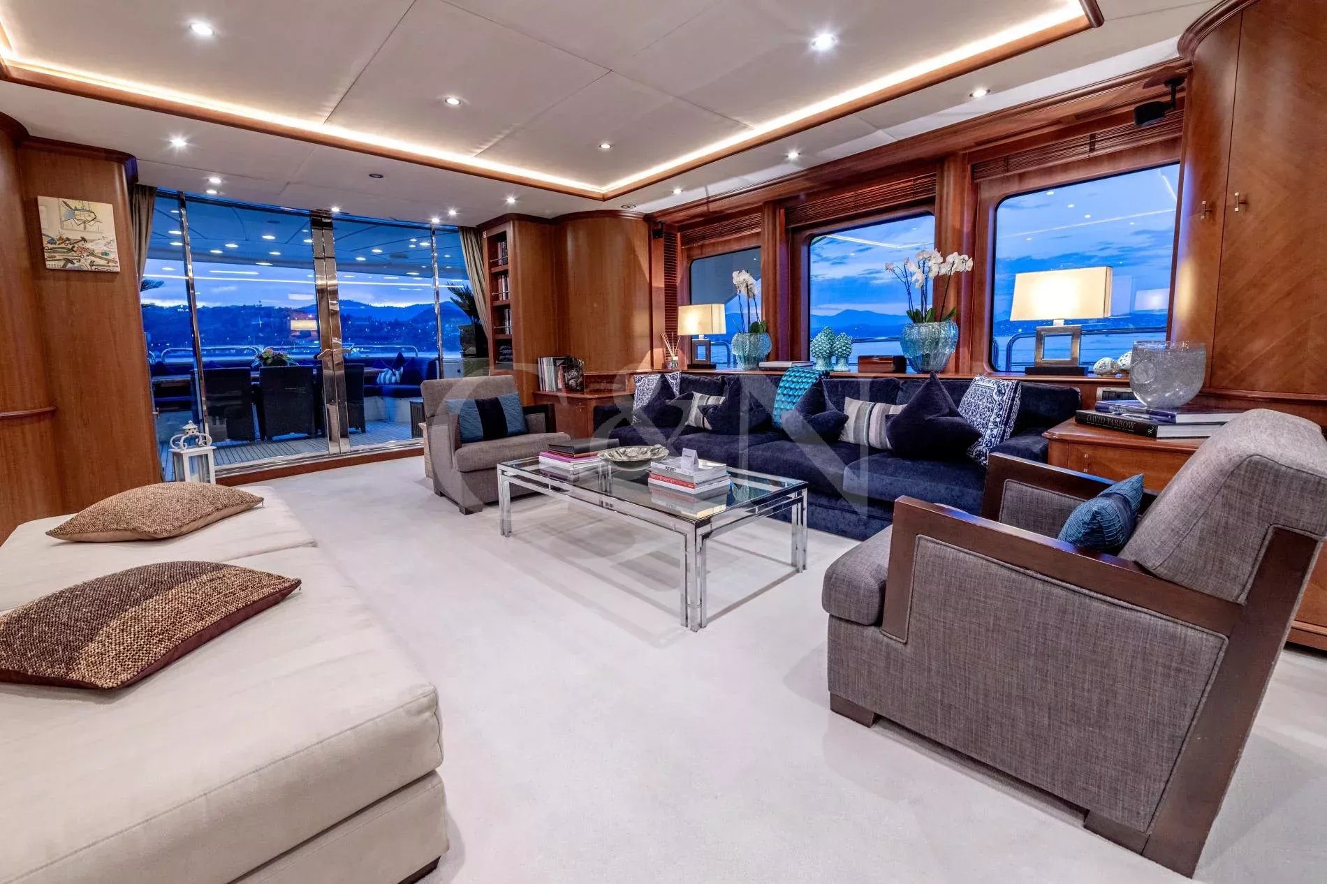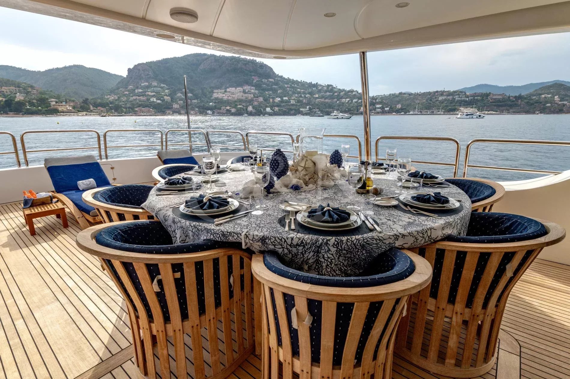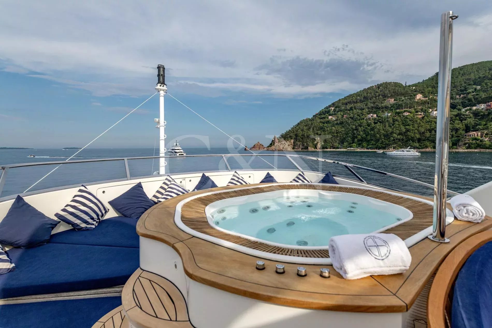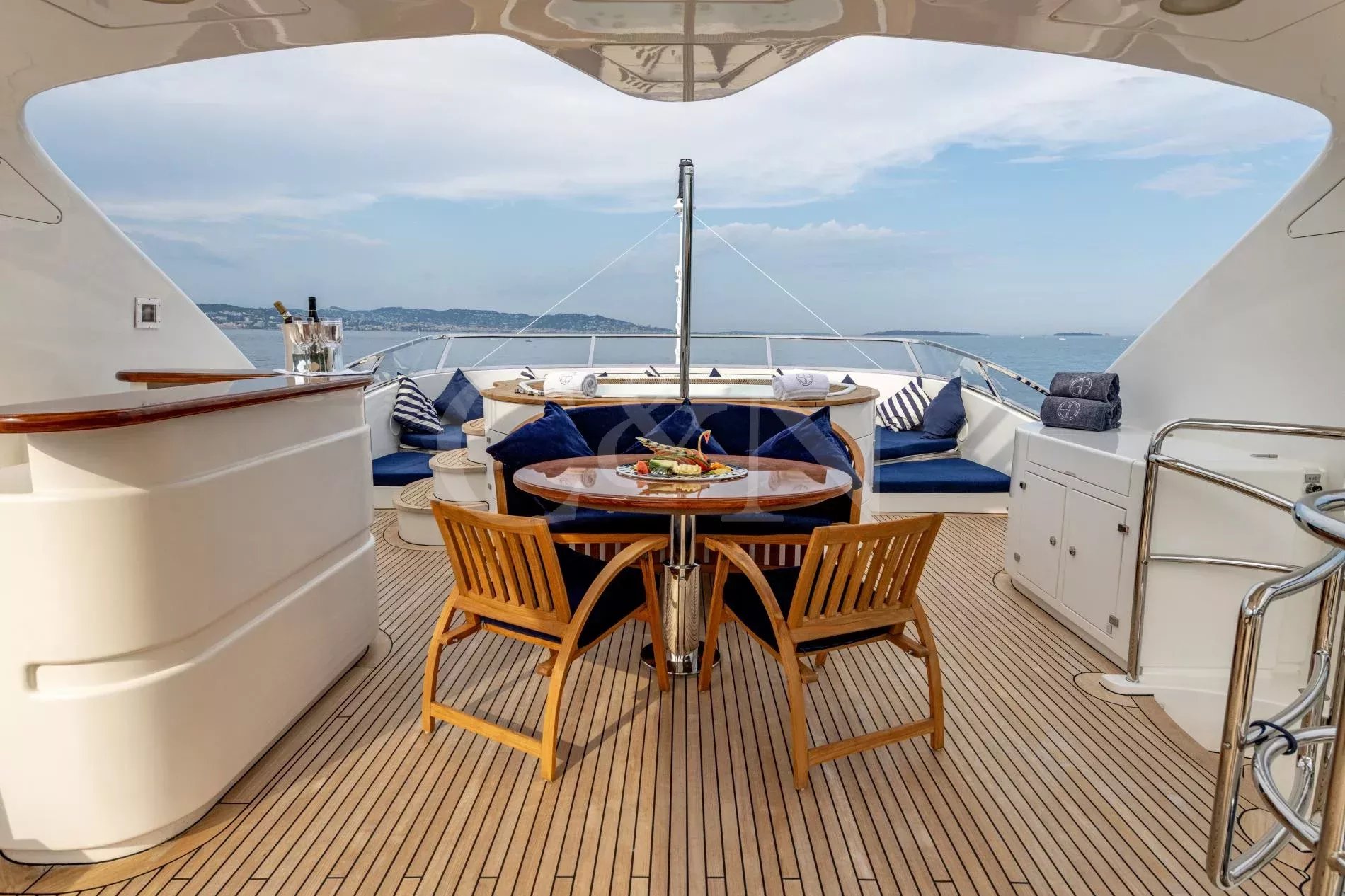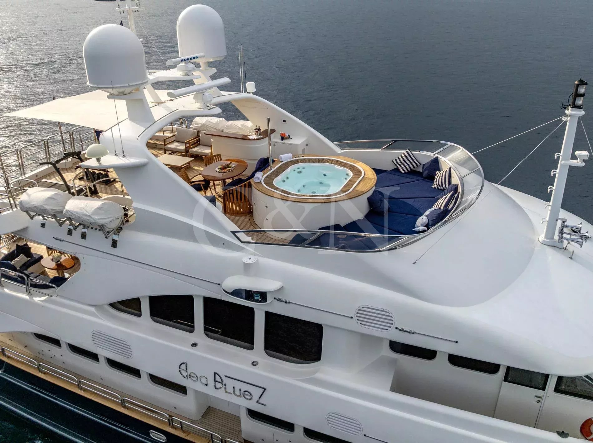 Sea BlueZ is a 36.58-metre Benetti motor yacht offering timeless elegance, unrivalled comfort, and extraordinary spaces. With her spacious design and impeccable pedigree, Sea BlueZ feels as grand as a 50-metre vessel and boasts many features typically found on larger yachts, such as a sundeck Jacuzzi, multiple bars and extensive gym equipment. Whether seeking relaxation or indulging in water adventures, Sea BlueZ promises an unforgettable charter experience.Sea BlueZ boasts a beautifully designed interior that effortlessly combines sophistication and comfort. The main salon invites relaxation with its stylish bar area and dining table for 10 guests.For quieter moments, the upper salon features a second bar, a board game table, and a refined library. Every corner of Sea BlueZ offers a warm and inviting atmosphere, perfect for socialising, dining, or unwinding in style.The exterior of Sea BlueZ is designed to inspire relaxation and adventure. With three spacious decks, guests can bask in the sun, take in the scenery, or entertain in elegant alfresco spaces. The sundeck is a standout feature, offering a Jacuzzi surrounded by plush sunbeds and 360° panoramic views.For fitness lovers, gym equipment on the sundeck allows you to stay active while enjoying the beauty of the open sea. Alfresco dining areas on the main and upper decks provide perfect settings for meals under the sun or stars.Sea BlueZ welcomes up to 10 guests in five luxurious cabins, each thoughtfully designed for comfort and privacy. The master suite, located on the main deck, features a spacious ensuite bathroom and a walk-in wardrobe.On the lower deck, two VIP cabins and two twin cabins offer refined comfort for family and friends. Each cabin includes its own ensuite bathroom, ensuring every guest experiences the ultimate in relaxation and convenience.From thrilling water toys to elegant comforts, Sea BlueZ is fully equipped to entertain guests of all ages.11m Scorpion Tender: Stylish and powerful, accommodating up to 10 guests and 2 crew.Water Toys: 2 Seabobs2 Inflatable SUPs1 PaddleboardWaterskis (adults and children)1 WakeboardSnorkelling equipmentInflatable toys (donuts, bananas, small wing)Onshore Exploration: 3 foldable bikes for discovering local destinations.
