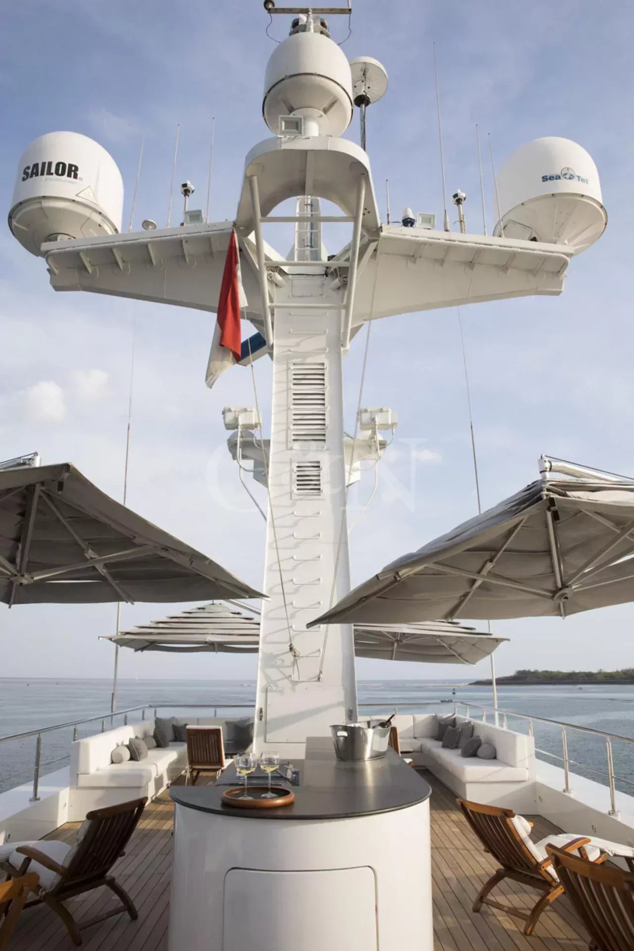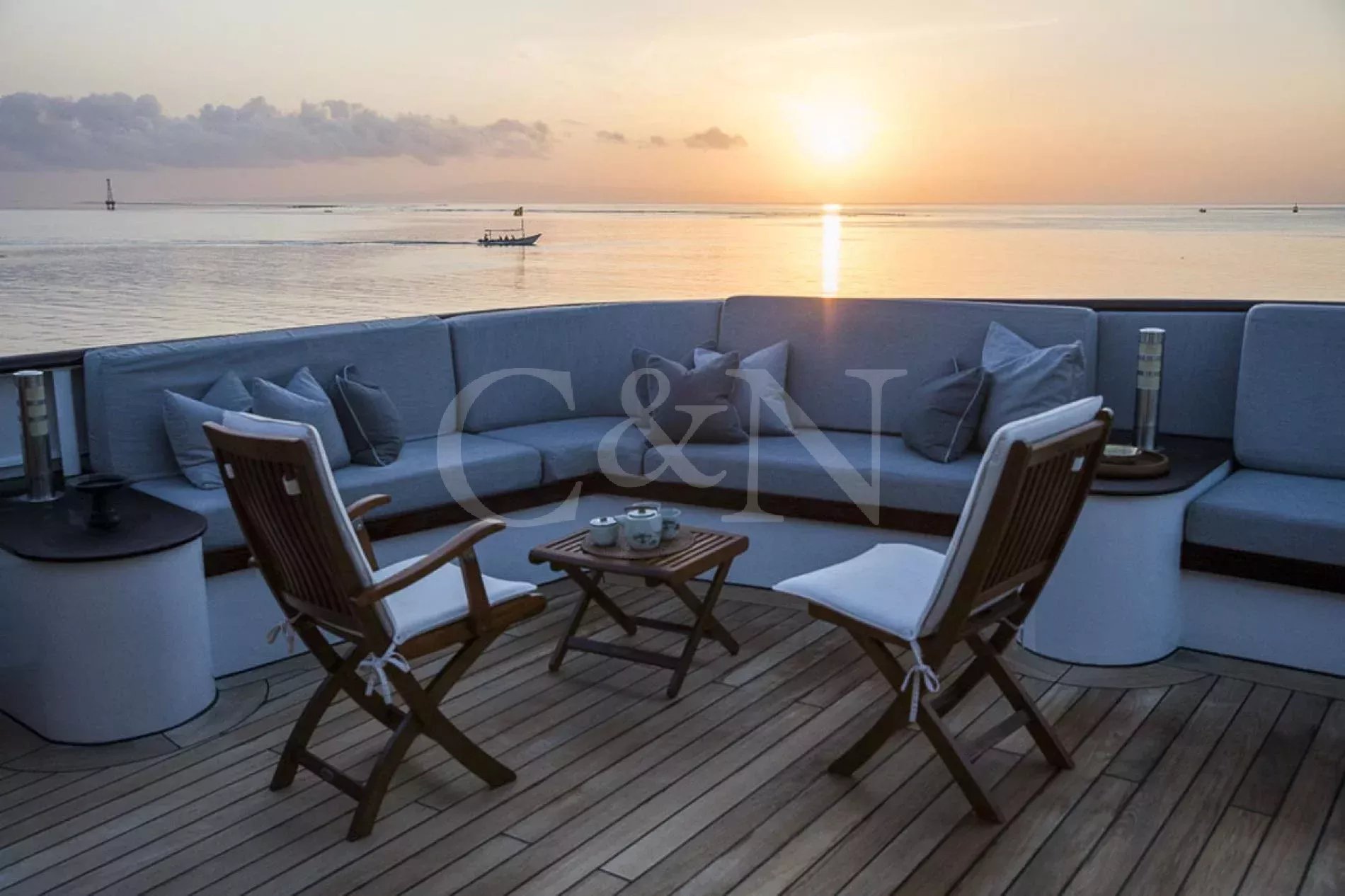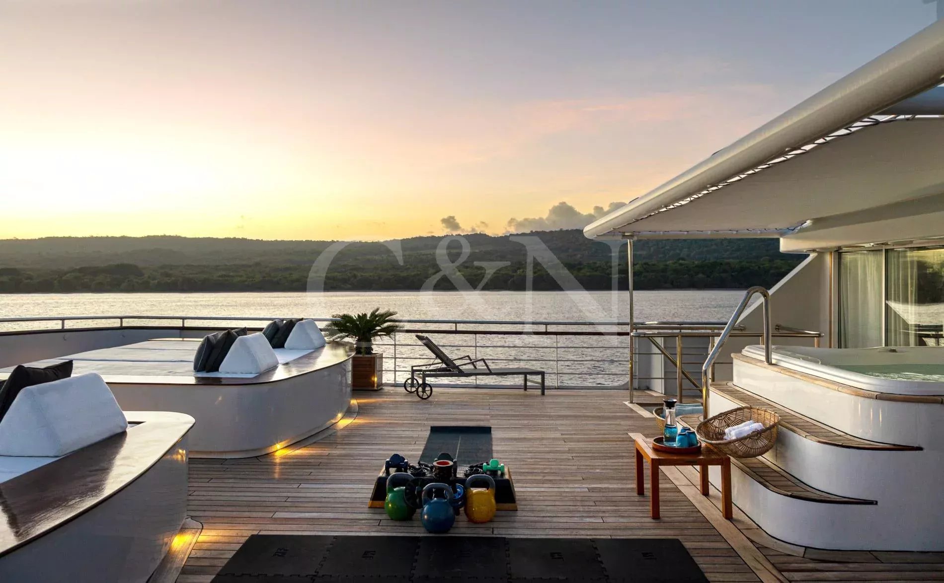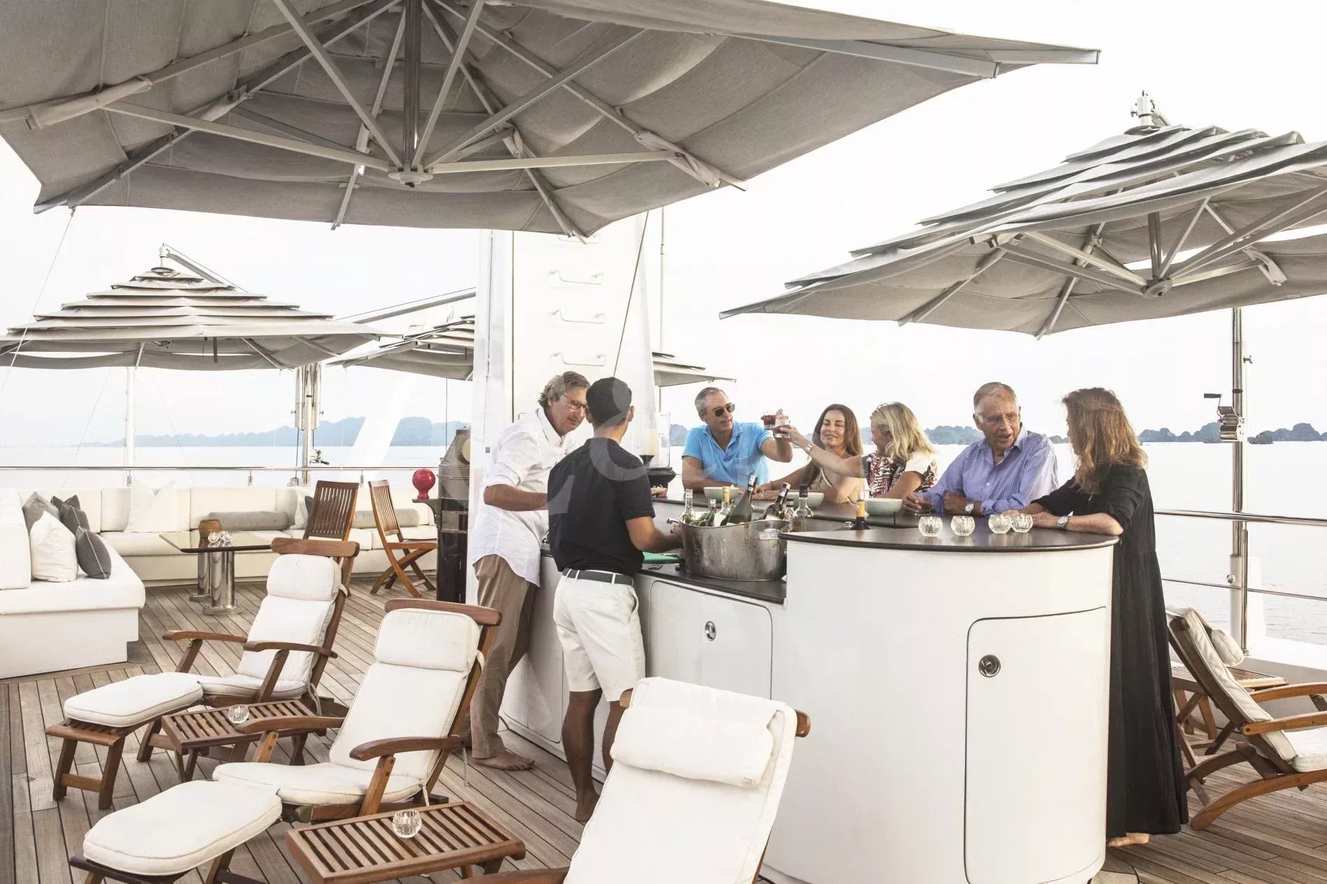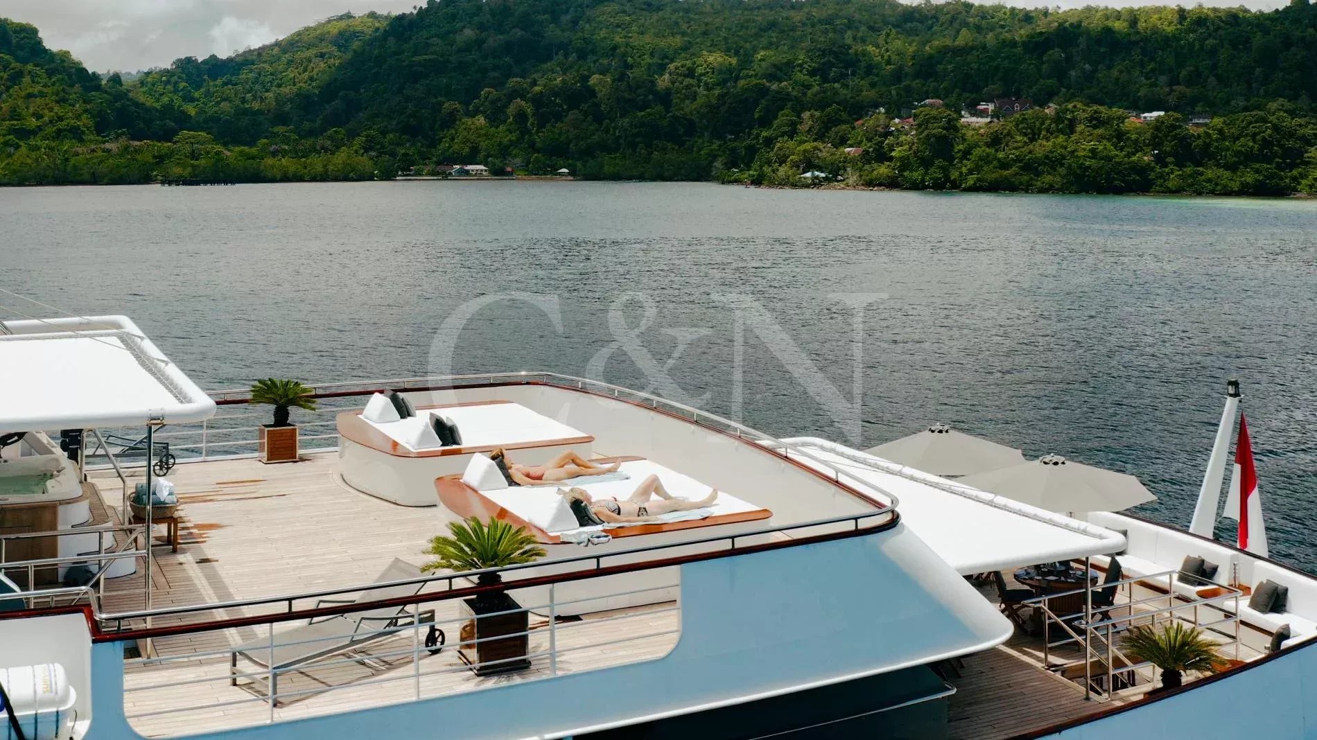 The sundeck offers spectacular 360-degree views wherever you sail in the picturesque Indonesian region. Equipped with a barbecue, outdoor seating with umbrellas and wraparound lounge sofas, this is the perfect location for sunrise yoga, an evening grill party or night-time stargazing.