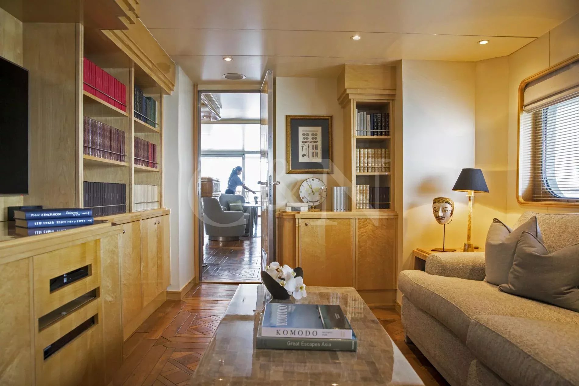 Spreading across five decks, Aqua Blu perfects the concept of a modern explorer yacht with inviting and generously-sized indoor and outdoor spaces. Aqua Blu’s main saloon is perfect to relax and socialise at or for use as one large open entertaining space. The library and television room are situated on the upper deck, completed with the sky lounge bar which opens up to a sheltered veranda through automatic glass doors.