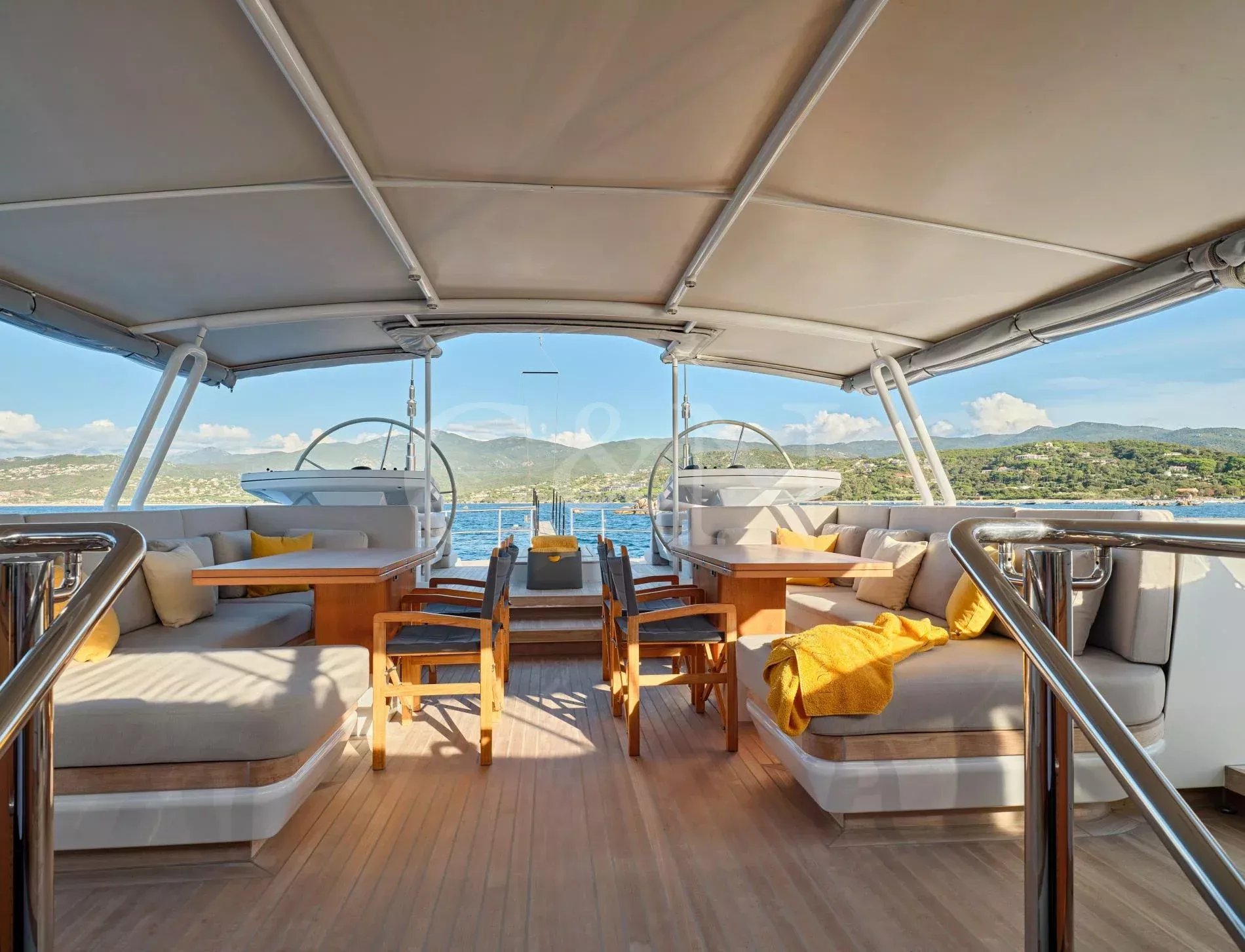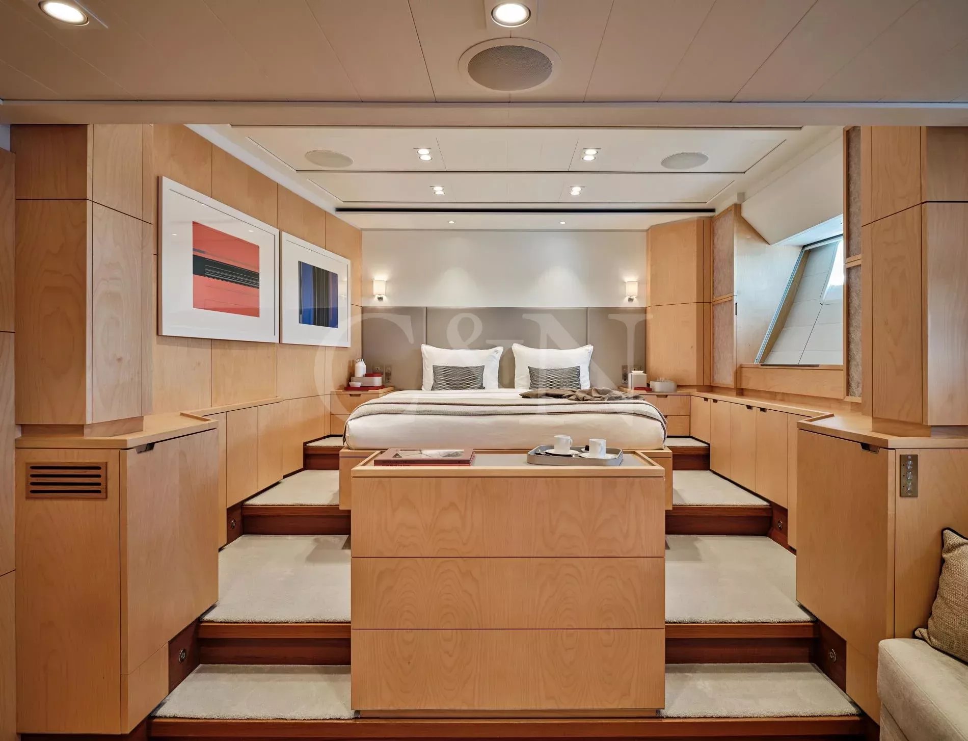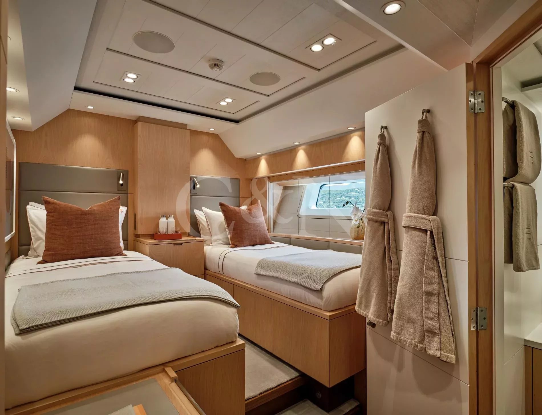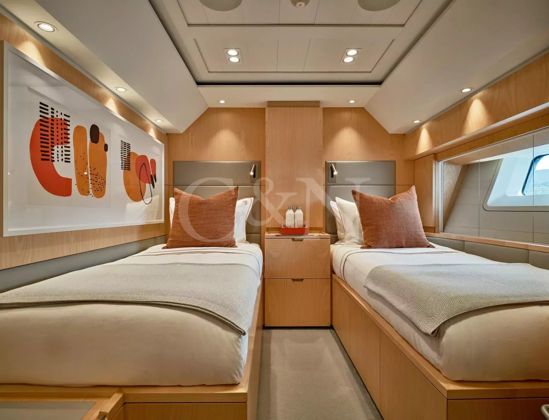 This recent refit has enhanced the guest experience with a new cockpit area, updated saloon and refreshed en suites. The owner’s cabin, split-level and located aft, offers a private study, a separate dressing room and a walk-in closet, providing a quiet, serene oasis in which to escape. Guillemot has four further cabins, two doubles and two twins, which can sleep ten guests comfortably.