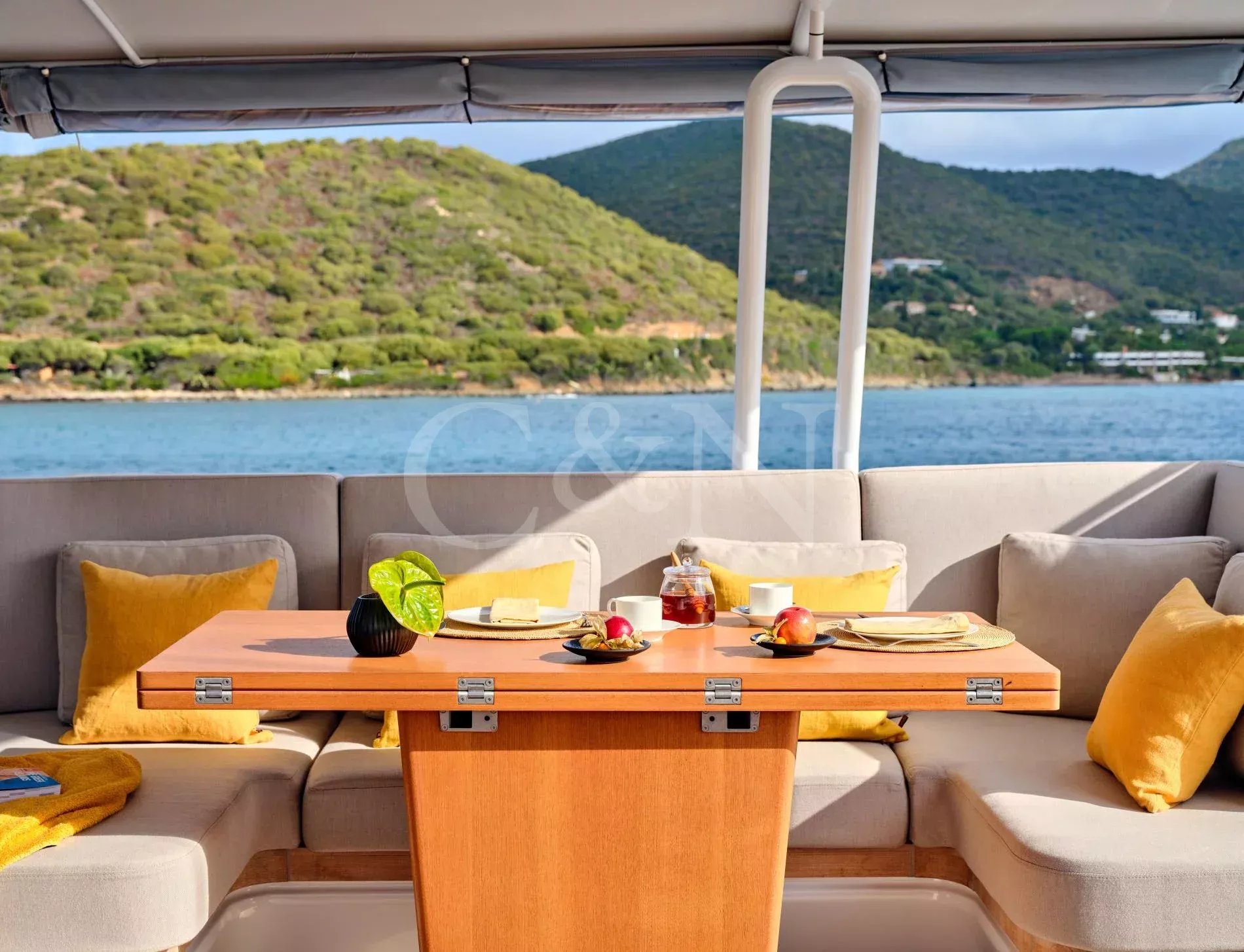 The yacht is well-suited for diving and water sports enthusiasts. Featuring a large, dedicated diving and bathing platform, as well as all the latest water toys, including a variety of options for younger guests, Guillemot is perfectly suited for families of all ages. Her tender, a Smuggler Strata 650, boasts a large canopy, a freshwater shower, a ski pole, and Bluetooth stereo.