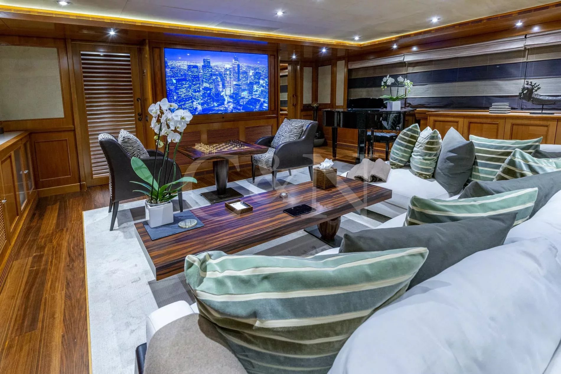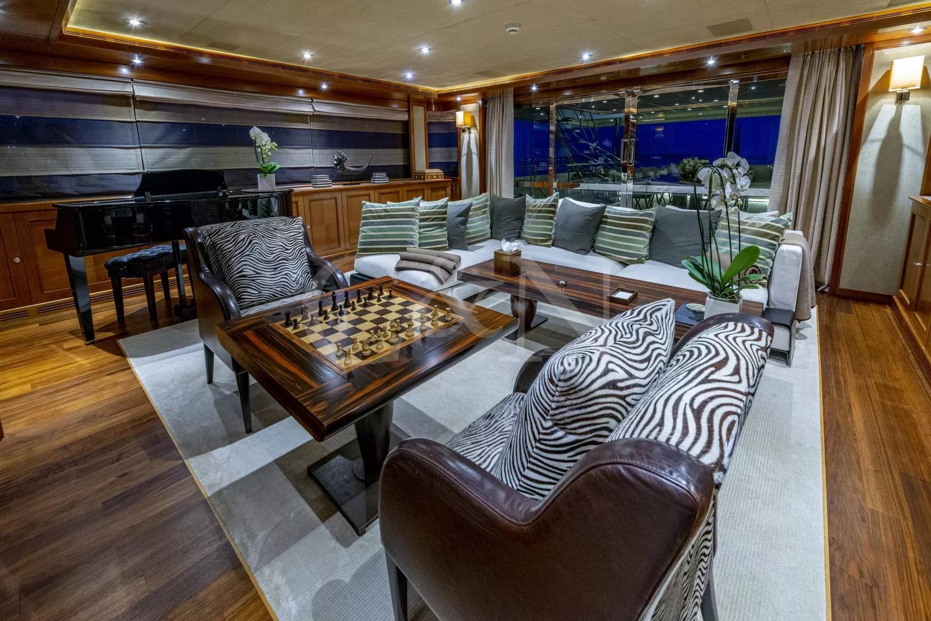 The spacious saloon on the main deck, with ample comfortable seating and a formal dining area, is the hub of the interior and the perfect respite from the sun. There is also a bridge deck saloon where guests can enjoy a movie on the large screen or challenge family and friends to a game of chess or backgammon on the handcrafted wooden games table.