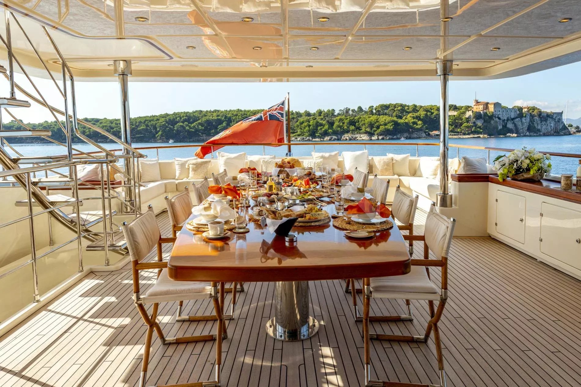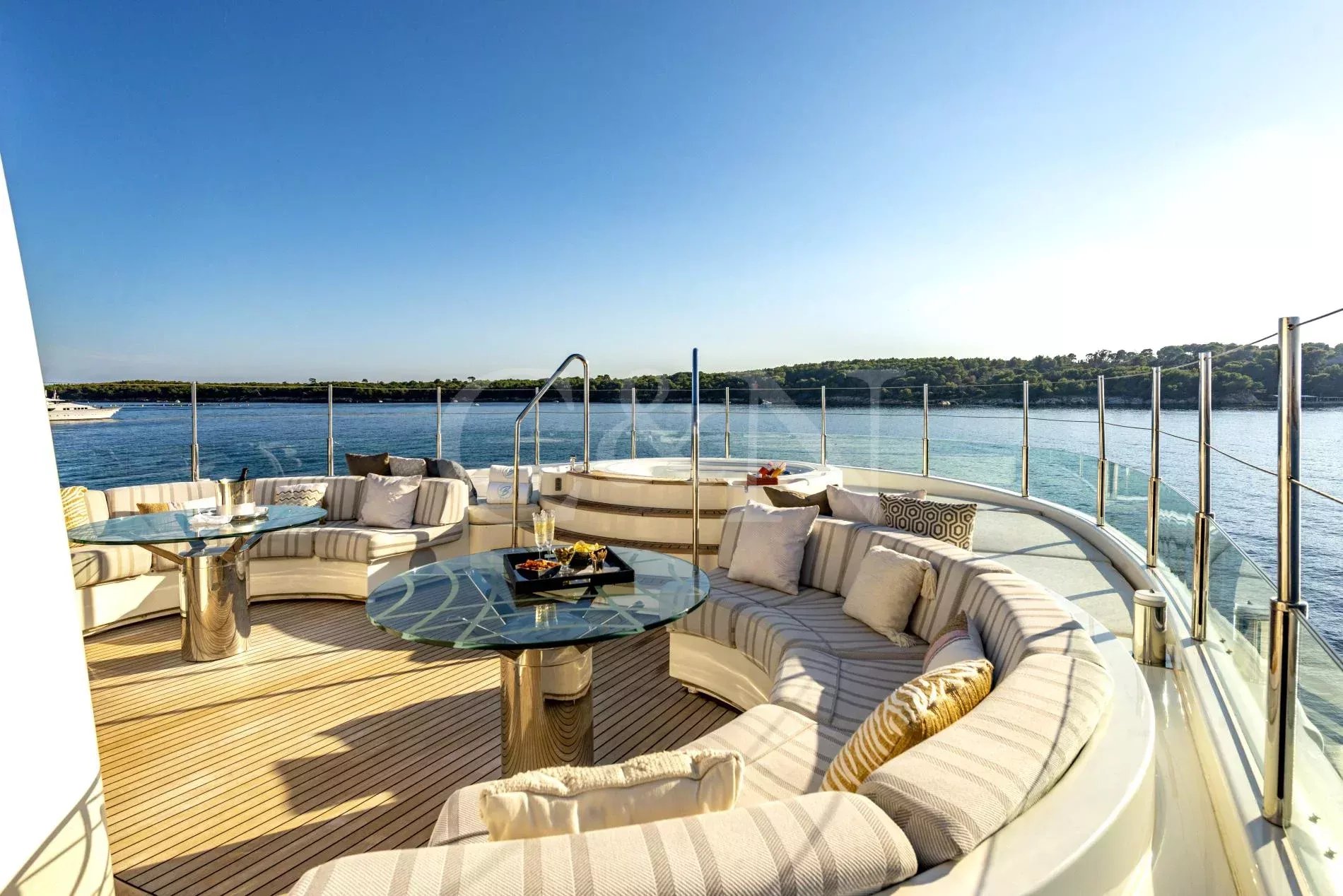 When it comes to al fresco dining, her spacious bridge deck offers a wonderful space for entertaining and is the perfect viewing platform for events or hosting parties. Up top, her sundeck is likely where guests will spend most of their time. Packed with amenities, guests can soak up the sun on the sun loungers, sip cocktails at the open bar, or relax in the Jacuzzi surrounded by sunpads.