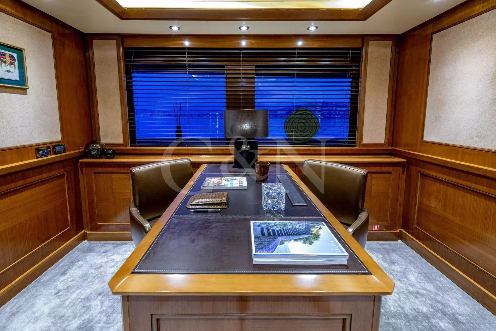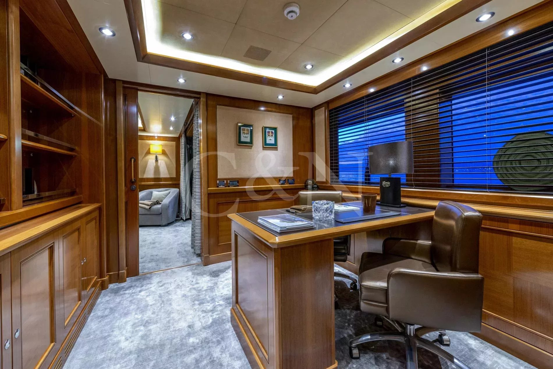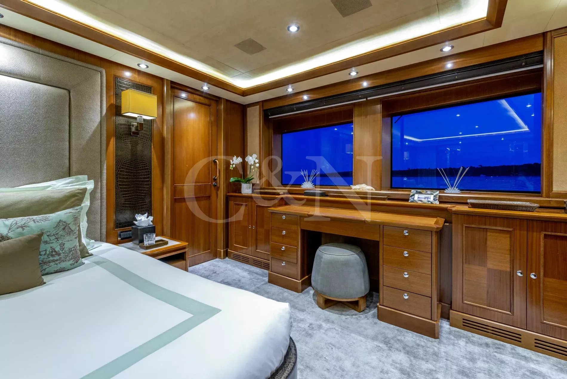 She can comfortably accommodate up to 11 guests across five well-appointed cabins, comprising a lavish master suite on the main deck, completed with a large open office area, walk-in wardrobe and a private enclosed balcony, providing the perfect spot to enjoy a morning coffee or romantic sunset in complete privacy.