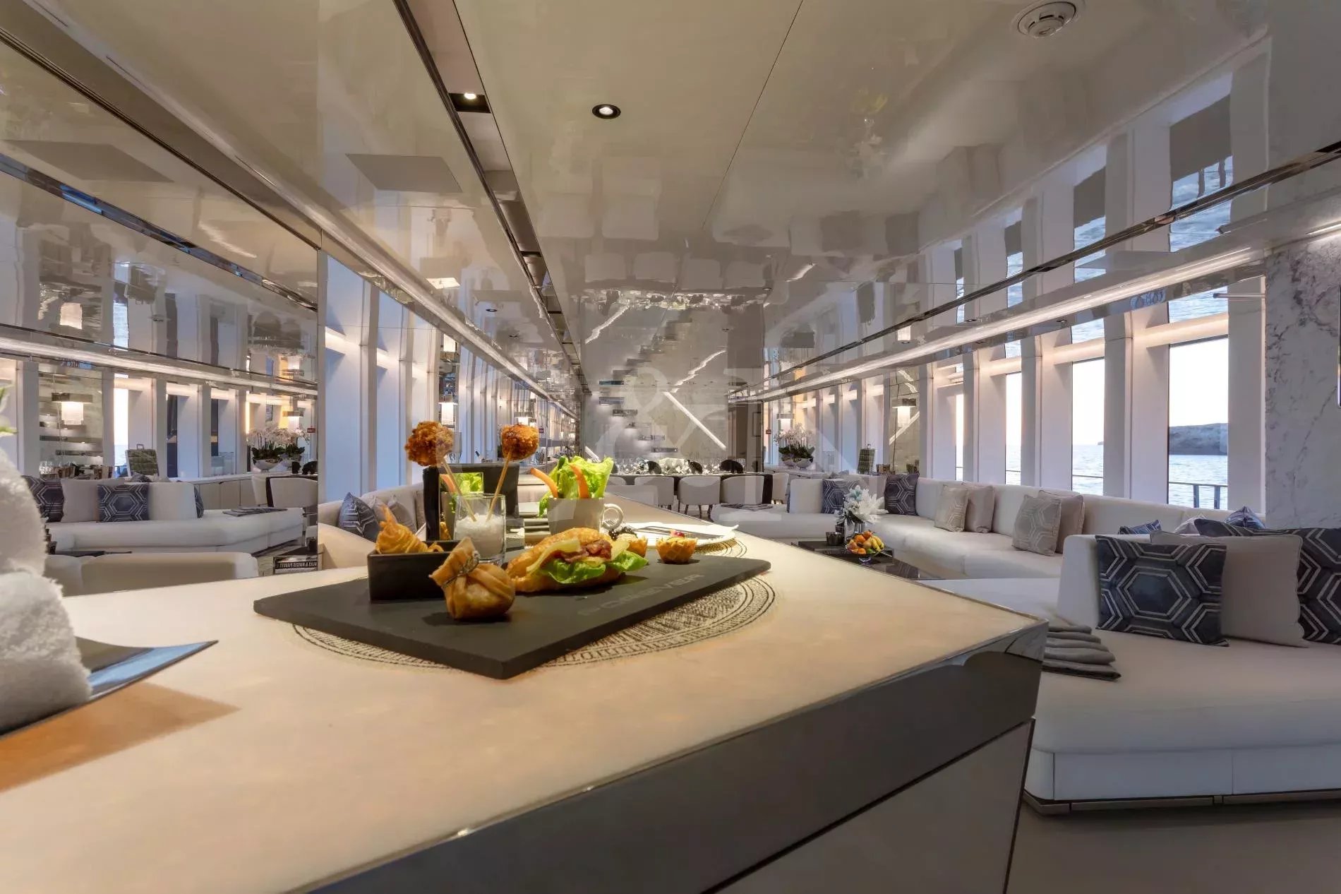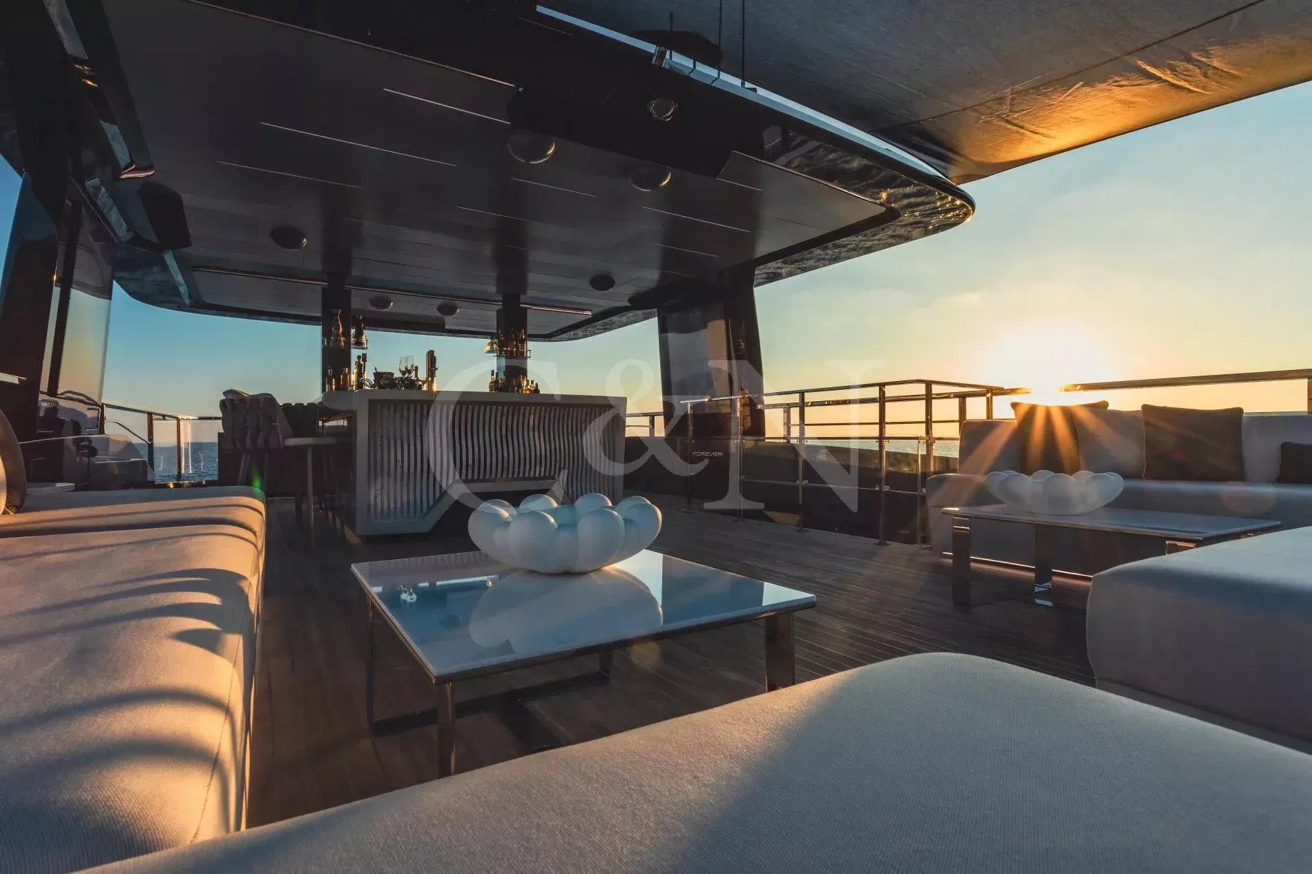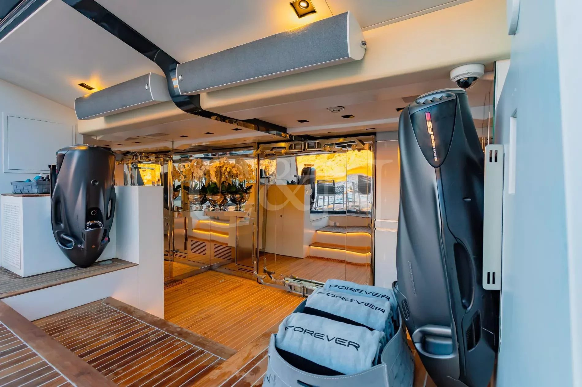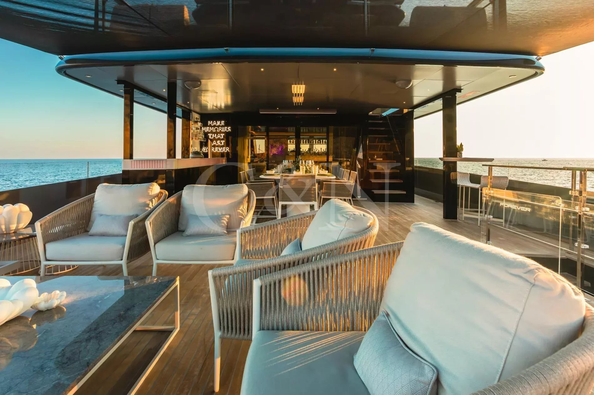 Forever is a 44.81m tri-deck luxury motor yacht built by Logica Yachts. This sleek and stylish motor yacht has a striking aesthetic and a dynamic profile with a stylish use of glass and a dark grey hull. Forever is in immaculate condition; she underwent an interior refit in 2018 as well as an exterior refit with additional modifications in 2022/2023, which included an extension to the upper deck, a new flybridge, and a repaint of the superstructure.Forever is an excellent yacht for entertaining guests and boasts many lifestyle amenities and large yacht features, including an impressive 5.5-metre foredeck pool with Jacuzzi and jet system, spacious decks with optional shade and multiple areas for al fresco dining, and a flybridge with statement bar counter. She is also home to state of the art lightning and music equipment, a beach club with gym equipment and adjacent steam room. Forever has immense charter compatibility and guarantees modern luxury at every turn.Forever’s spectacular modern interior adopts a Miami beach style, with brushed marble and Loro Piana lined walls throughout. Her interior tones are characterised by greys, whites and creams, with pops of fun decor and patterns giving her a cool yet vibrant ambience.On her main deck, Forever’s large open-plan main salon is reminiscent of a penthouse apartment. The space features a spacious and sumptuous seating area which flows through to a formal interior dining setup. The main salon is characterised by the extensive use of glass and a high-gloss deckhead. Her main deck also features the capacious master cabin, which boasts an en suite bathtub, a forward facing bed and large windows offering ocean views.Forever’s upper deck features a stylish skylounge ideal for relaxation and taking in the beautiful surroundings, complete with large windows and a backlit sit-up bar. Forever can accommodate 12 guests across six cabins, with the Owner’s suite located on the main deck boasting an en suite bathtub and forward facing bed, with large windows offering ocean views.Separate quarters are provided for up to ten crew.Forever boasts expansive deck spaces dotted with spectacular large yacht features. The perfect entertainment platform, the motor yacht boasts many lifestyle amenities. Forever sports partially new teak decks across her exterior.The main deck aft features a comfortable seating and casual dining space. On the upper deck, guests can enjoy the formal al fresco dining area and seating arrangement that offers immaculate ocean views. Forever’s sundeck is also a highlight, with designated relaxation and social areas and a statement bar counter.Forever’s foredeck is home to an impressive 5.5m pool with Jacuzzi and jet system, perfect for taking a dip while underway or relaxing in the sun.Forever is accompanied by a 45ft Wally chaseboat, and has ample stowage space for a wide selection of water toys and a midships tender garage. She has a trans-Atlantic range and at-anchor stabilisers. This Logica 147 is a standout superyacht with enormous charter appeal.