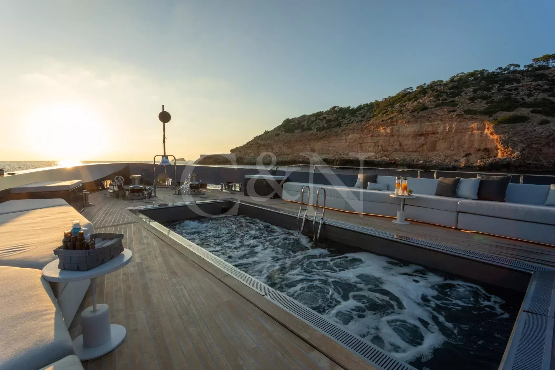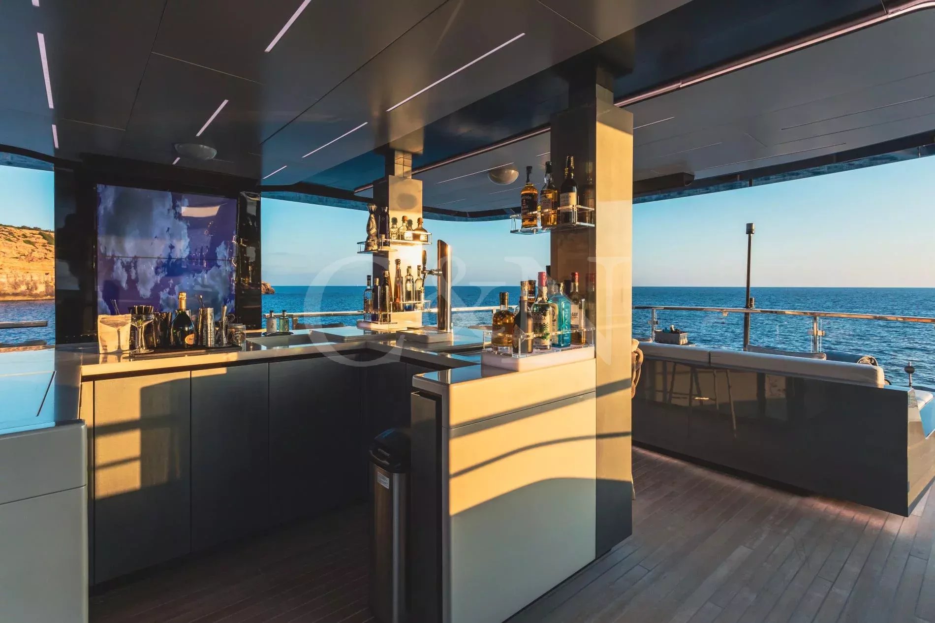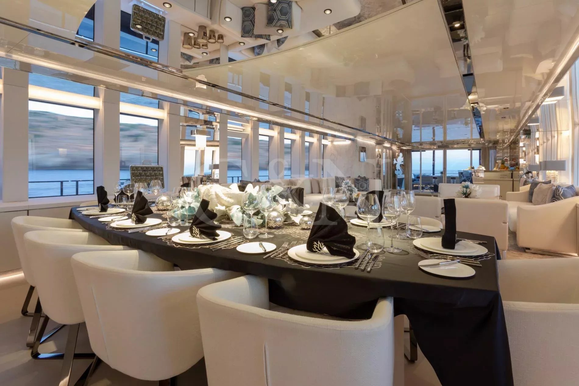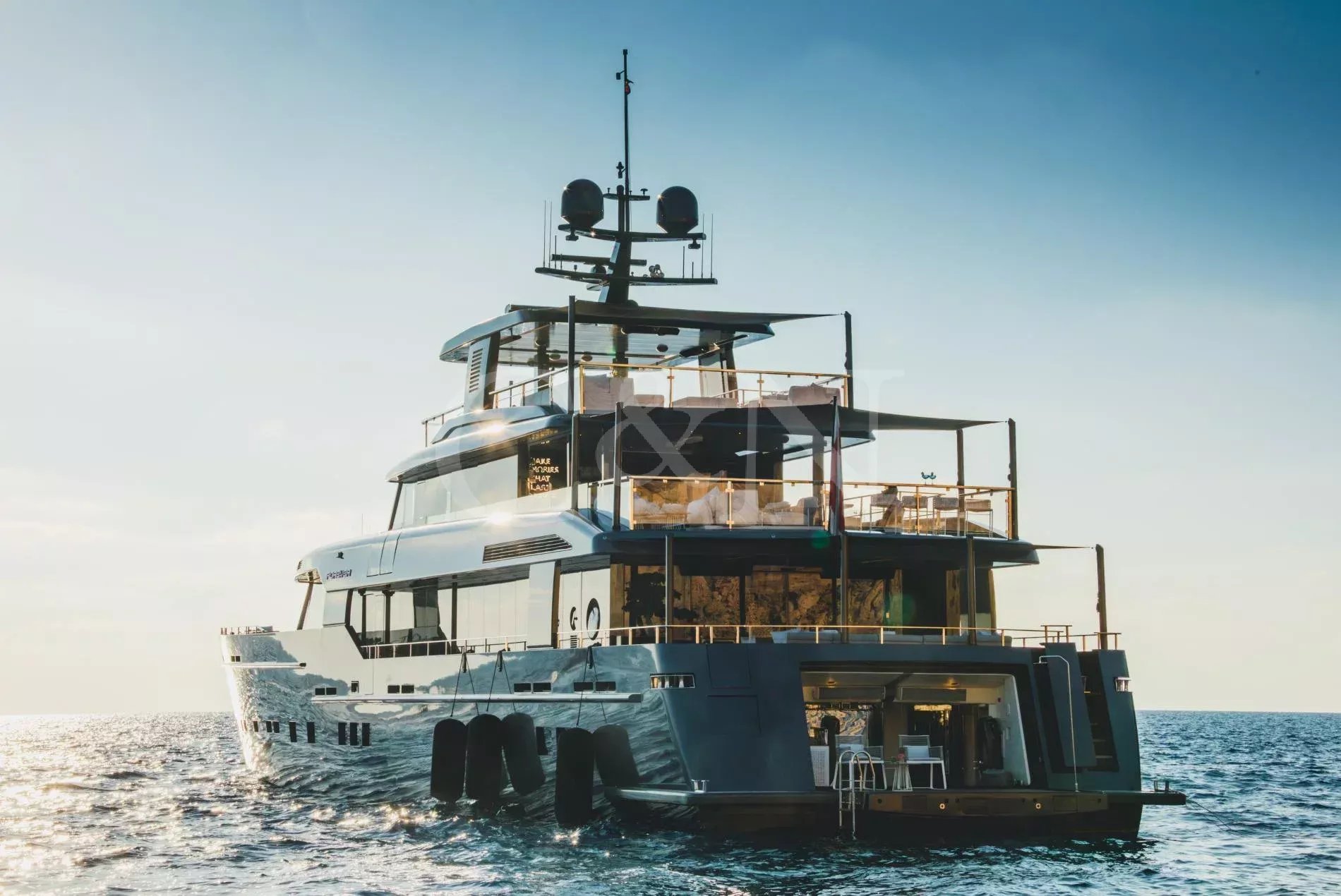 Forever is a 44.81m tri-deck luxury motor yacht built by Logica Yachts. This sleek and stylish motor yacht has a striking aesthetic and a dynamic profile with a stylish use of glass and a dark grey hull. Forever is in immaculate condition; she underwent an interior refit in 2018 as well as an exterior refit with additional modifications in 2022/2023, which included an extension to the upper deck, a new flybridge, and a repaint of the superstructure.Forever is an excellent yacht for entertaining guests and boasts many lifestyle amenities and large yacht features, including an impressive 5.5-metre foredeck pool with Jacuzzi and jet system, spacious decks with optional shade and multiple areas for al fresco dining, and a flybridge with statement bar counter. She is also home to state of the art lightning and music equipment, a beach club with gym equipment and adjacent steam room. Forever has immense charter compatibility and guarantees modern luxury at every turn.Forever’s spectacular modern interior adopts a Miami beach style, with brushed marble and Loro Piana lined walls throughout. Her interior tones are characterised by greys, whites and creams, with pops of fun decor and patterns giving her a cool yet vibrant ambience.On her main deck, Forever’s large open-plan main salon is reminiscent of a penthouse apartment. The space features a spacious and sumptuous seating area which flows through to a formal interior dining setup. The main salon is characterised by the extensive use of glass and a high-gloss deckhead. Her main deck also features the capacious master cabin, which boasts an en suite bathtub, a forward facing bed and large windows offering ocean views.Forever’s upper deck features a stylish skylounge ideal for relaxation and taking in the beautiful surroundings, complete with large windows and a backlit sit-up bar. Forever can accommodate 12 guests across six cabins, with the Owner’s suite located on the main deck boasting an en suite bathtub and forward facing bed, with large windows offering ocean views.Separate quarters are provided for up to ten crew.Forever boasts expansive deck spaces dotted with spectacular large yacht features. The perfect entertainment platform, the motor yacht boasts many lifestyle amenities. Forever sports partially new teak decks across her exterior.The main deck aft features a comfortable seating and casual dining space. On the upper deck, guests can enjoy the formal al fresco dining area and seating arrangement that offers immaculate ocean views. Forever’s sundeck is also a highlight, with designated relaxation and social areas and a statement bar counter.Forever’s foredeck is home to an impressive 5.5m pool with Jacuzzi and jet system, perfect for taking a dip while underway or relaxing in the sun.Forever is accompanied by a 45ft Wally chaseboat, and has ample stowage space for a wide selection of water toys and a midships tender garage. She has a trans-Atlantic range and at-anchor stabilisers. This Logica 147 is a standout superyacht with enormous charter appeal.