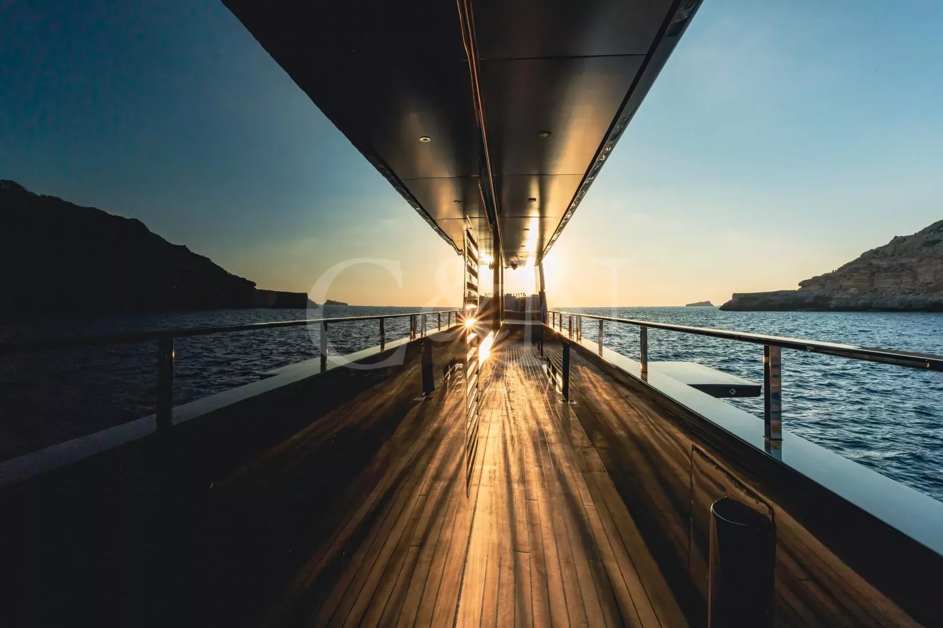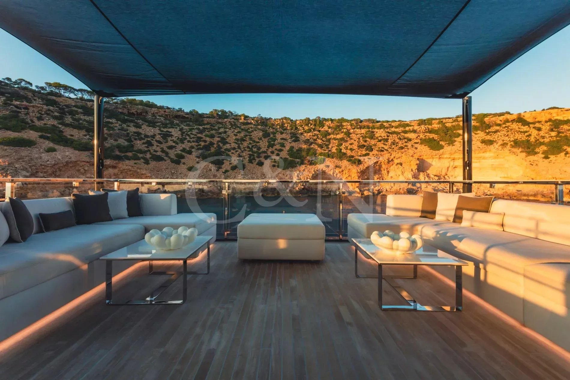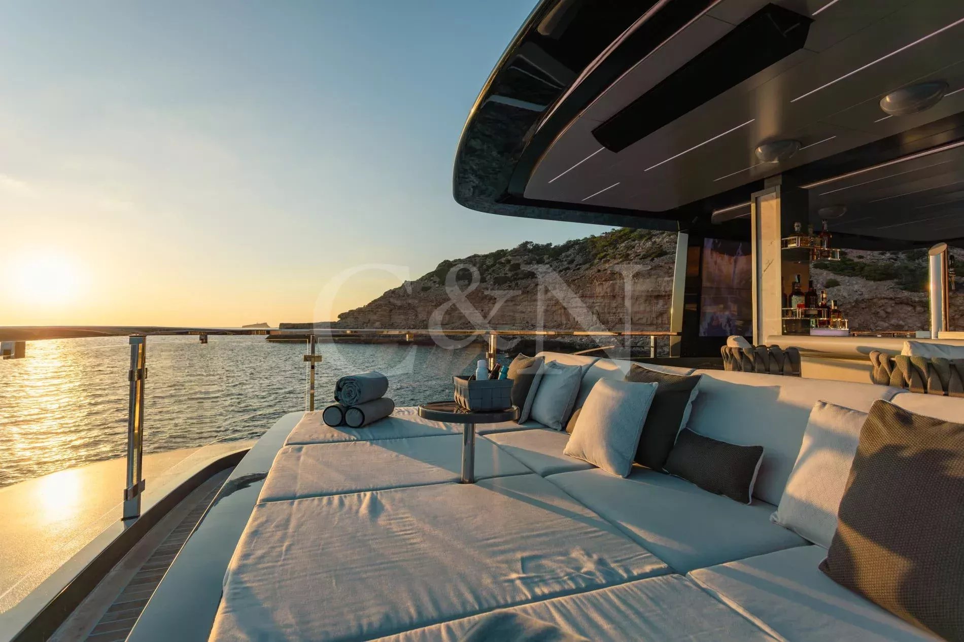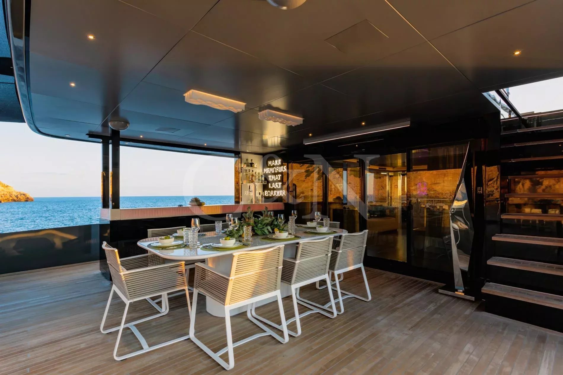 Forever is a 44.81m tri-deck luxury motor yacht built by Logica Yachts. This sleek and stylish motor yacht has a striking aesthetic and a dynamic profile with a stylish use of glass and a dark grey hull. Forever is in immaculate condition; she underwent an interior refit in 2018 as well as an exterior refit with additional modifications in 2022/2023, which included an extension to the upper deck, a new flybridge, and a repaint of the superstructure.Forever is an excellent yacht for entertaining guests and boasts many lifestyle amenities and large yacht features, including an impressive 5.5-metre foredeck pool with Jacuzzi and jet system, spacious decks with optional shade and multiple areas for al fresco dining, and a flybridge with statement bar counter. She is also home to state of the art lightning and music equipment, a beach club with gym equipment and adjacent steam room. Forever has immense charter compatibility and guarantees modern luxury at every turn.Forever’s spectacular modern interior adopts a Miami beach style, with brushed marble and Loro Piana lined walls throughout. Her interior tones are characterised by greys, whites and creams, with pops of fun decor and patterns giving her a cool yet vibrant ambience.On her main deck, Forever’s large open-plan main salon is reminiscent of a penthouse apartment. The space features a spacious and sumptuous seating area which flows through to a formal interior dining setup. The main salon is characterised by the extensive use of glass and a high-gloss deckhead. Her main deck also features the capacious master cabin, which boasts an en suite bathtub, a forward facing bed and large windows offering ocean views.Forever’s upper deck features a stylish skylounge ideal for relaxation and taking in the beautiful surroundings, complete with large windows and a backlit sit-up bar. Forever can accommodate 12 guests across six cabins, with the Owner’s suite located on the main deck boasting an en suite bathtub and forward facing bed, with large windows offering ocean views.Separate quarters are provided for up to ten crew.Forever boasts expansive deck spaces dotted with spectacular large yacht features. The perfect entertainment platform, the motor yacht boasts many lifestyle amenities. Forever sports partially new teak decks across her exterior.The main deck aft features a comfortable seating and casual dining space. On the upper deck, guests can enjoy the formal al fresco dining area and seating arrangement that offers immaculate ocean views. Forever’s sundeck is also a highlight, with designated relaxation and social areas and a statement bar counter.Forever’s foredeck is home to an impressive 5.5m pool with Jacuzzi and jet system, perfect for taking a dip while underway or relaxing in the sun.Forever is accompanied by a 45ft Wally chaseboat, and has ample stowage space for a wide selection of water toys and a midships tender garage. She has a trans-Atlantic range and at-anchor stabilisers. This Logica 147 is a standout superyacht with enormous charter appeal.