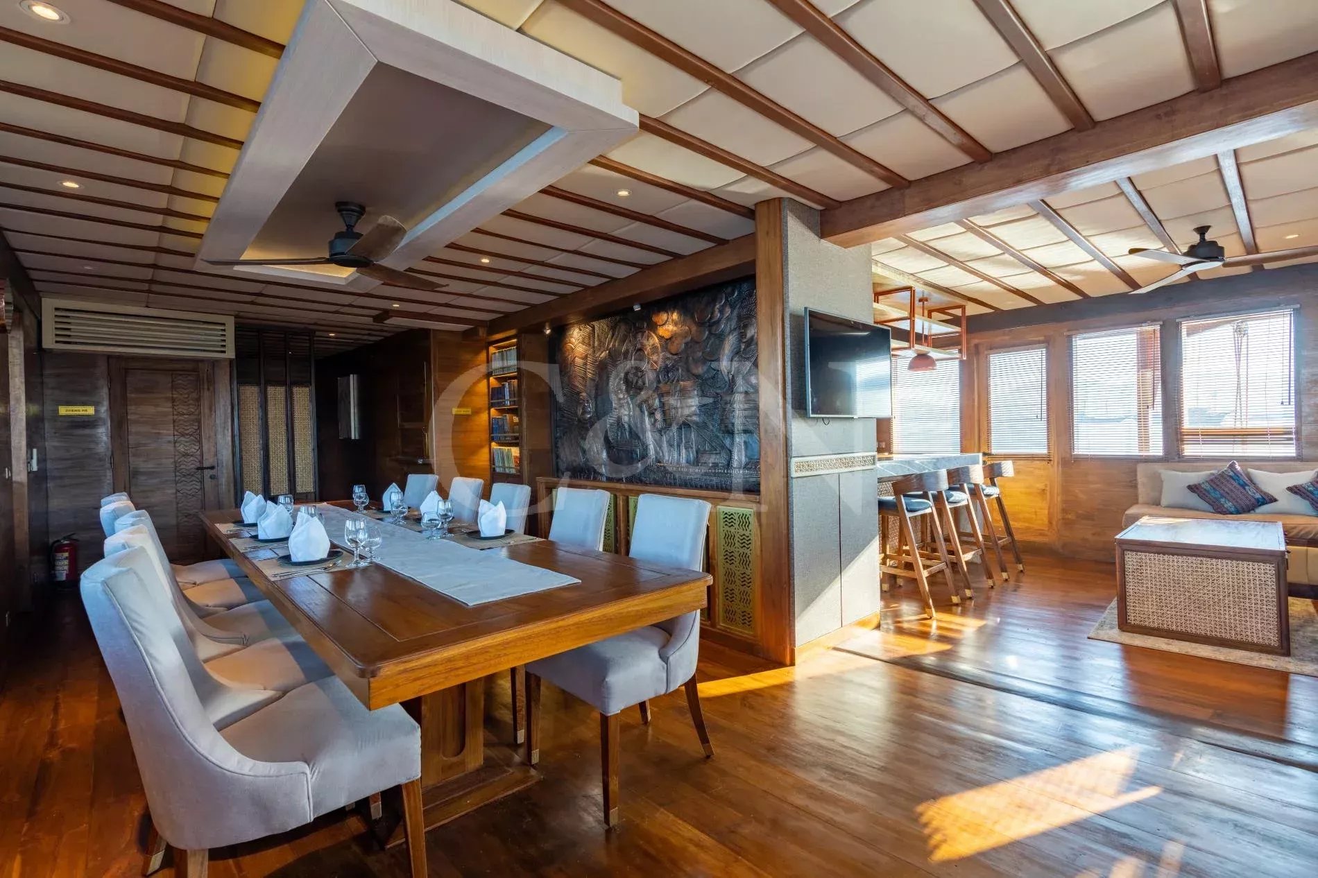 Guest spaces include the impressive Gajah Mada lounge and dining room on the main deck, which features beautiful copper bas-reliefs depicting historic maritime scenes. There is a spacious sun deck with 360-degree views, and an alfresco dining area for lazy lunches and late-night dinners. The interior décor is typically Indonesian and complemented by touches of modern luxury and design.