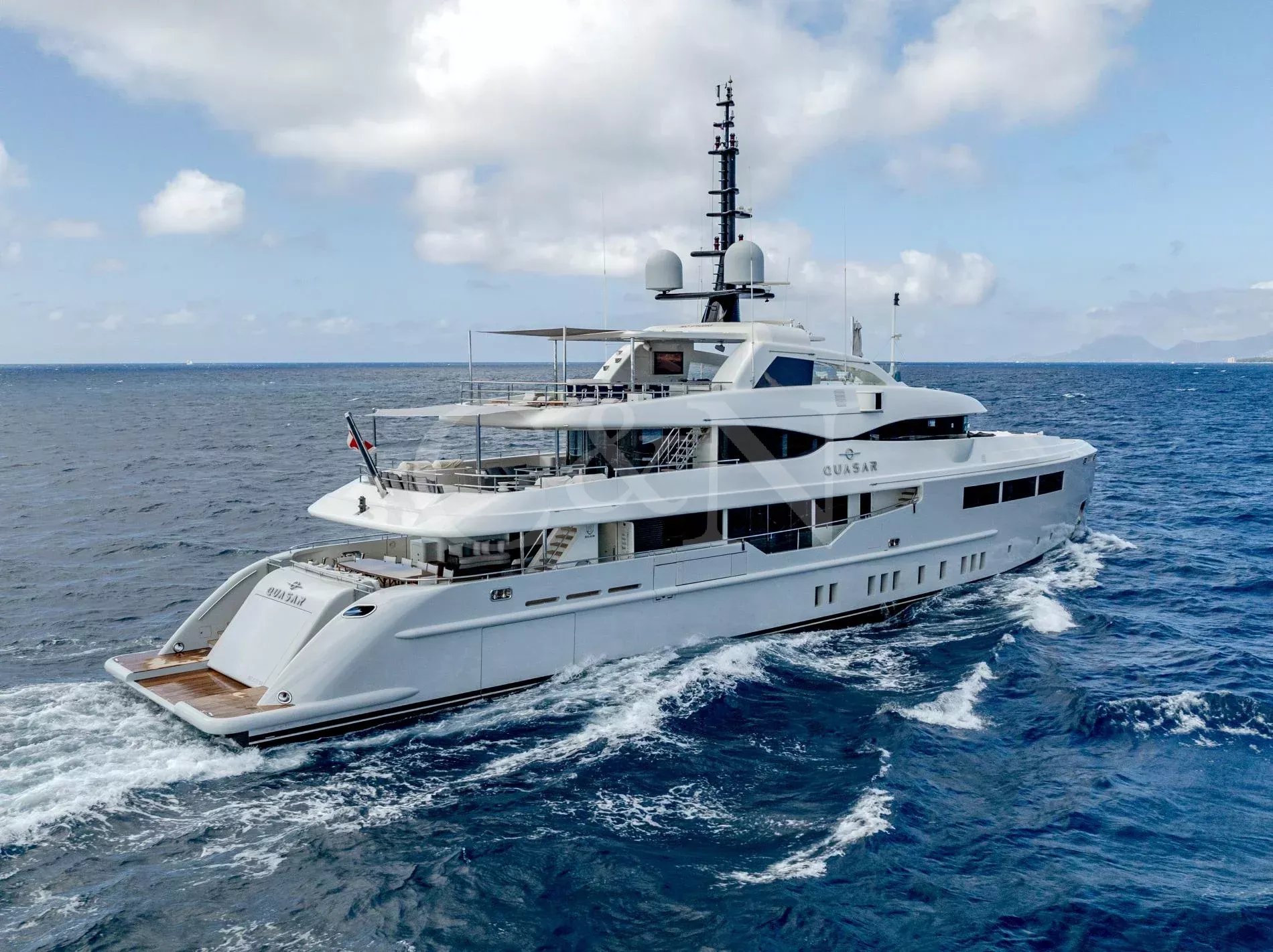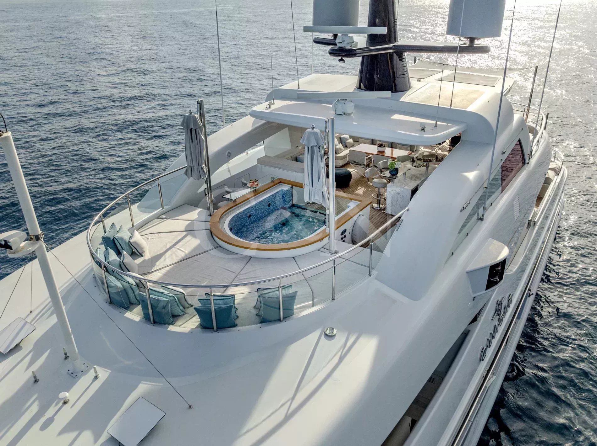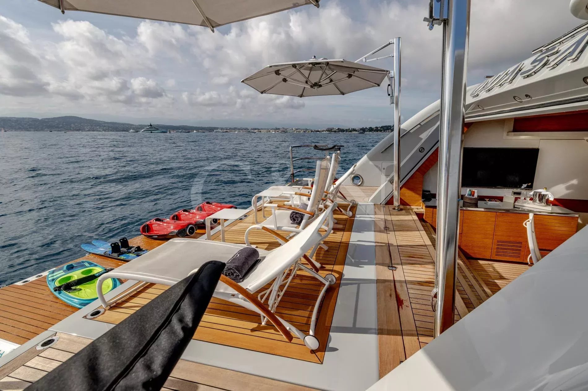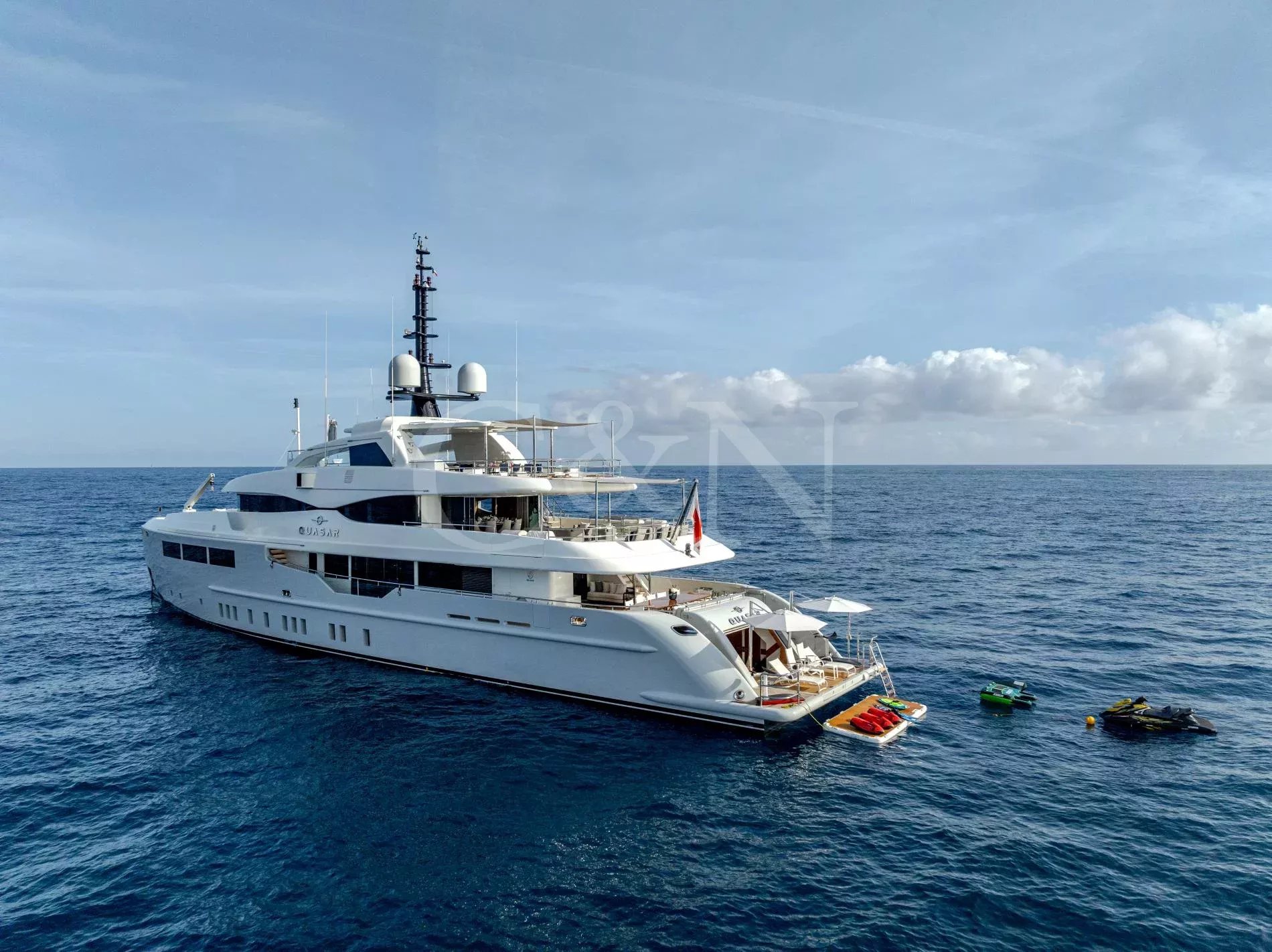Quasar is a 46.8m Bilgin Yachts superyacht, brand new to the charter market. Quasar was launched in 2016 and specifically designed for multiple family use with flexible accommodation and fantastic entertainment features.Quasar’s innovative layout comprises two master suites. The first suite is on the main deck and benefits from a private office. The second suite is on the lower deck, and this full beam cabin also enjoys a private lounge. In total, Quasar has accommodation for up to 12 guests in 6 cabins.The main deck hosts a comfortable lounge with cinema screen for relaxing, whilst the upper saloon is more of an entertainment space with a seamless connection to the aft deck and outdoor dining area. The aft deck furnishings are modular and can be rearranged to suit – the crew can arrange the deck as a dedicated lounge area for younger guests. With unobstructed view from fore to aft, you can recline on a sunbed and still keep an eye on the large TV in the saloon.The sundeck is the ultimate socialising space with a top-spec entertainment system. A glass-fronted spa pool is situated forward, surrounded by sunbeds, while a shaded bar and lounge area is located amidships with an al fresco dining table and sun loungers aft.There is a well-appointed beach club aboard this luxury tri-deck motor yacht and Quasar carries a great selection of water toys.