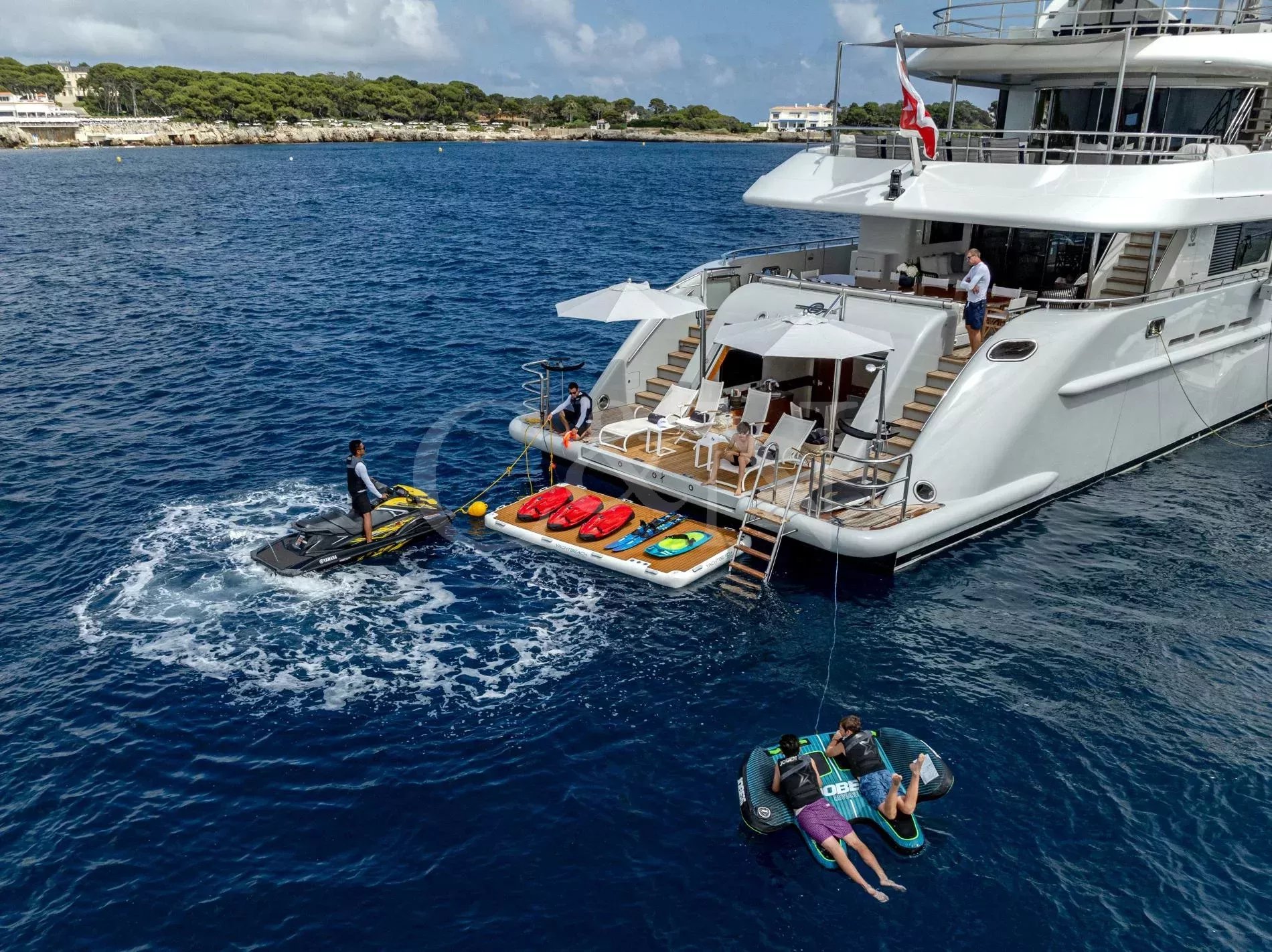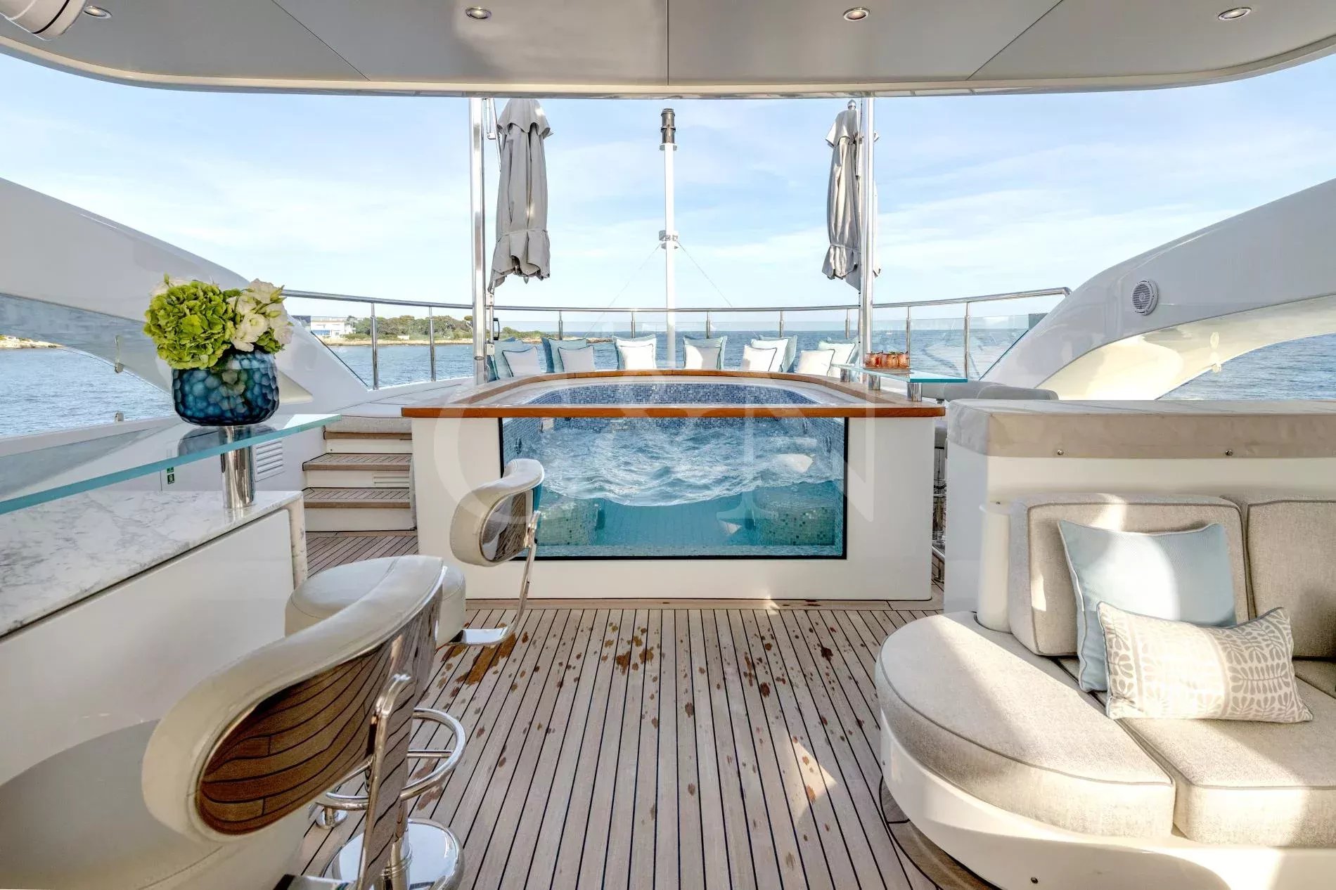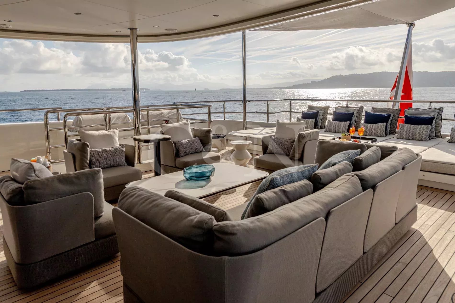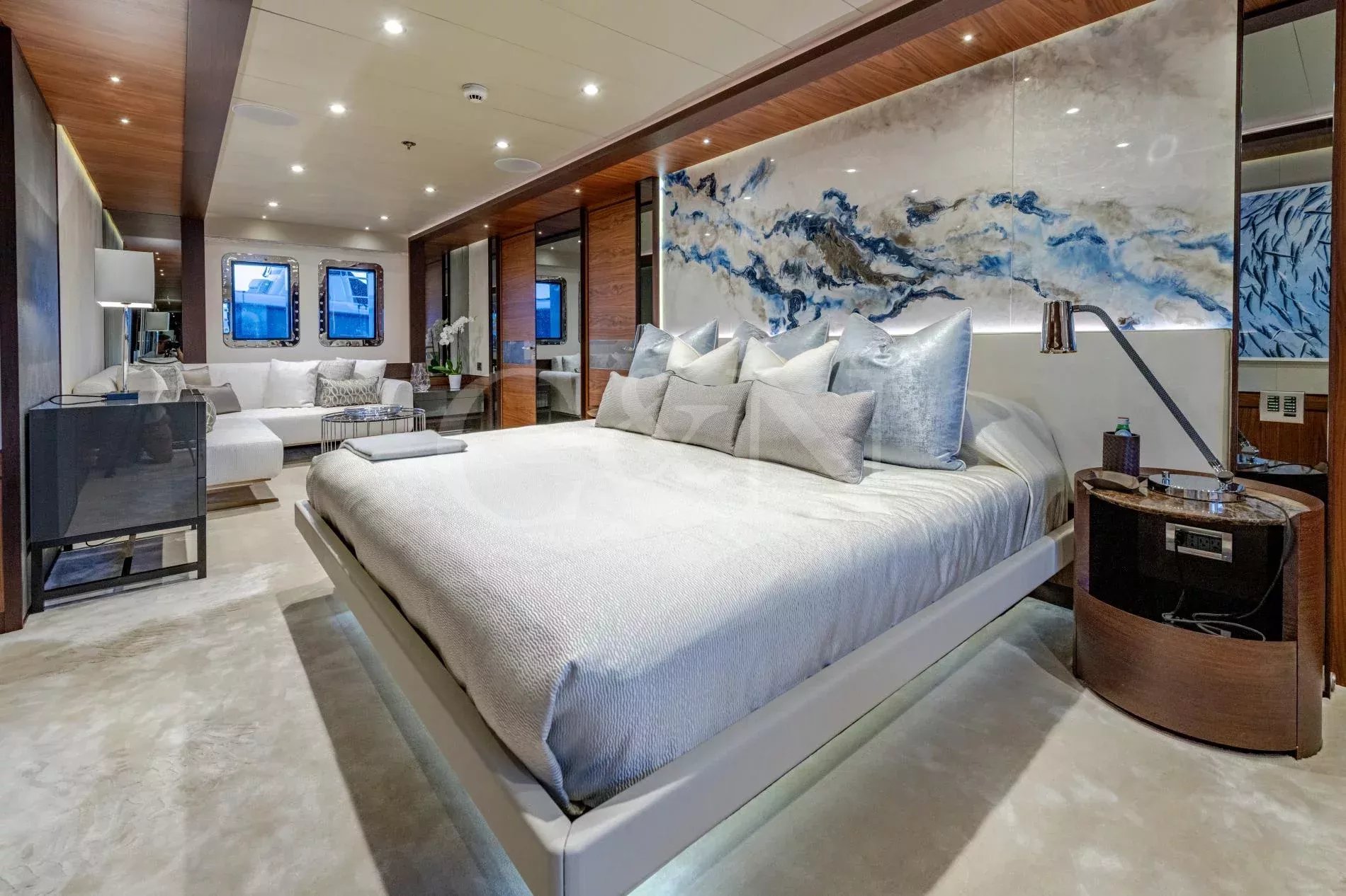 Quasar is a 46.8m Bilgin Yachts superyacht, brand new to the charter market. Quasar was launched in 2016 and specifically designed for multiple family use with flexible accommodation and fantastic entertainment features.Quasar’s innovative layout comprises two master suites. The first suite is on the main deck and benefits from a private office. The second suite is on the lower deck, and this full beam cabin also enjoys a private lounge. In total, Quasar has accommodation for up to 12 guests in 6 cabins.The main deck hosts a comfortable lounge with cinema screen for relaxing, whilst the upper saloon is more of an entertainment space with a seamless connection to the aft deck and outdoor dining area. The aft deck furnishings are modular and can be rearranged to suit – the crew can arrange the deck as a dedicated lounge area for younger guests. With unobstructed view from fore to aft, you can recline on a sunbed and still keep an eye on the large TV in the saloon.The sundeck is the ultimate socialising space with a top-spec entertainment system. A glass-fronted spa pool is situated forward, surrounded by sunbeds, while a shaded bar and lounge area is located amidships with an al fresco dining table and sun loungers aft.There is a well-appointed beach club aboard this luxury tri-deck motor yacht and Quasar carries a great selection of water toys.