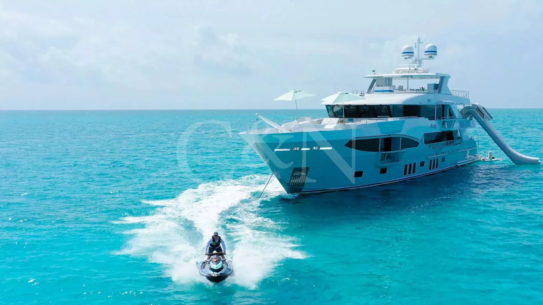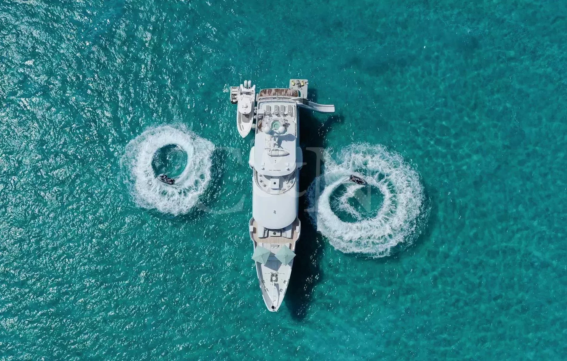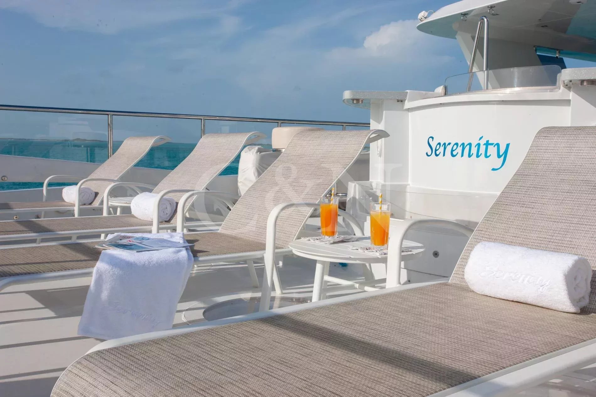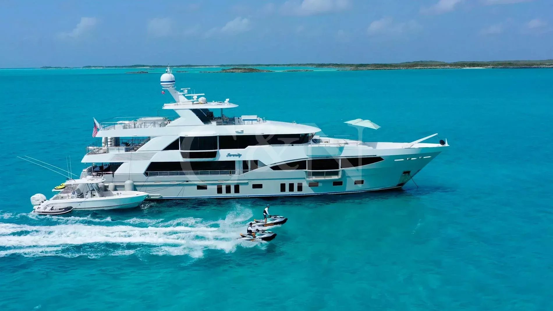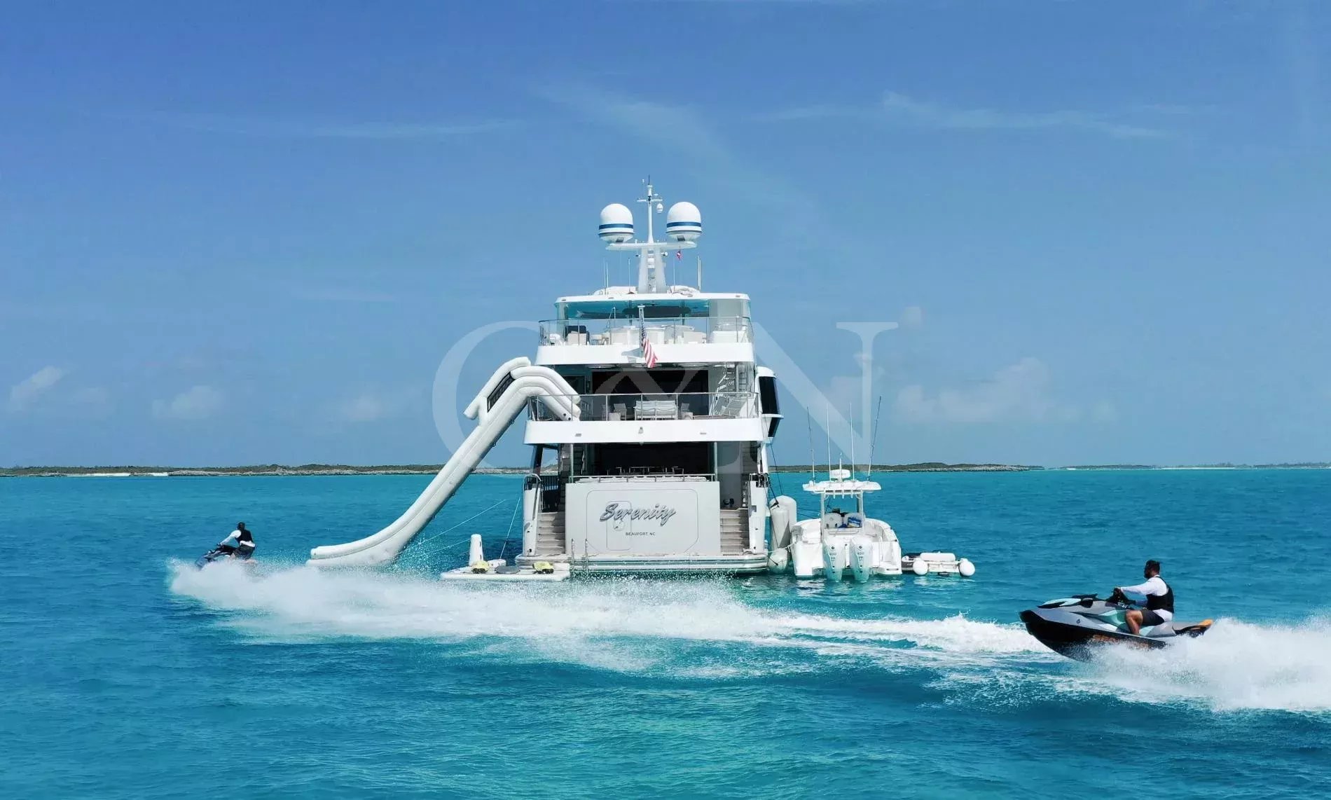 Step aboard Serenity for a luxurious charter experience that prioritizes on-the-water fun and quality time with family and friends. Serenity is a 40.54m motor yacht equipped with all the amenities for a fantastic superyacht vacation.Serenity has accommodation for 12 guests in a cabin arrangement that comprises five doubles and one which is convertible between twin or double setup. The master suite resides on the main deck and benefits from his-and-hers ensuites as well as two private balconies, and there’s a generously sized VIP suite on the upper deck. All cabins have independent climate control and an audiovisual entertainment system.Sporting new interior furnishings and artwork following a 2023 refit, Serenity’s interior offers versatile spaces for relaxing and socialising with ambient lighting able to set any tone. The main saloon is open plan to the formal dining table, and doors lead to an inviting aft deck with statement bar counter. Ascending to the deck above, a second skylounge features a large L-shape sofa, coffee table and cocktail bar. On the sun deck, a Jacuzzi with waterfall feature takes pride of place and the space aft of this can be flooded and turned into a safe splash pool for young children. The sun deck also plays host to another bar counter and a dining area, which is situated beneath the fixed roof shade.Further sunbathing space is found on the bow, where an expanse of cushioned sun pads awaits.Serenity carries a huge array of water toys and accessories, and the selection offers something to entertain guests of all ages. There are Sea Doos and Sea Scooters, two SeaBobs, kayaks, snorkelling sets, wakeboards and body boards, various towable inflatables, fishing tackle, and a waterslide.A 34ft Custom Edge Water tender facilitates high-speed transfers between superyacht and shore, and day-long excursions along the coast. Other onboard amenities include high-speed Starlink internet, a selection of exercise equipment, and even a putting green.At Serenity’s stern, the swim platform incorporates a hydraulic section that can be raised to form a diving platform or lowered into the water for easier access to the ocean as required.Serenity has a 17-knot top speed and cruises comfortably at 12 knots. Serenity operates with a crew of seven.