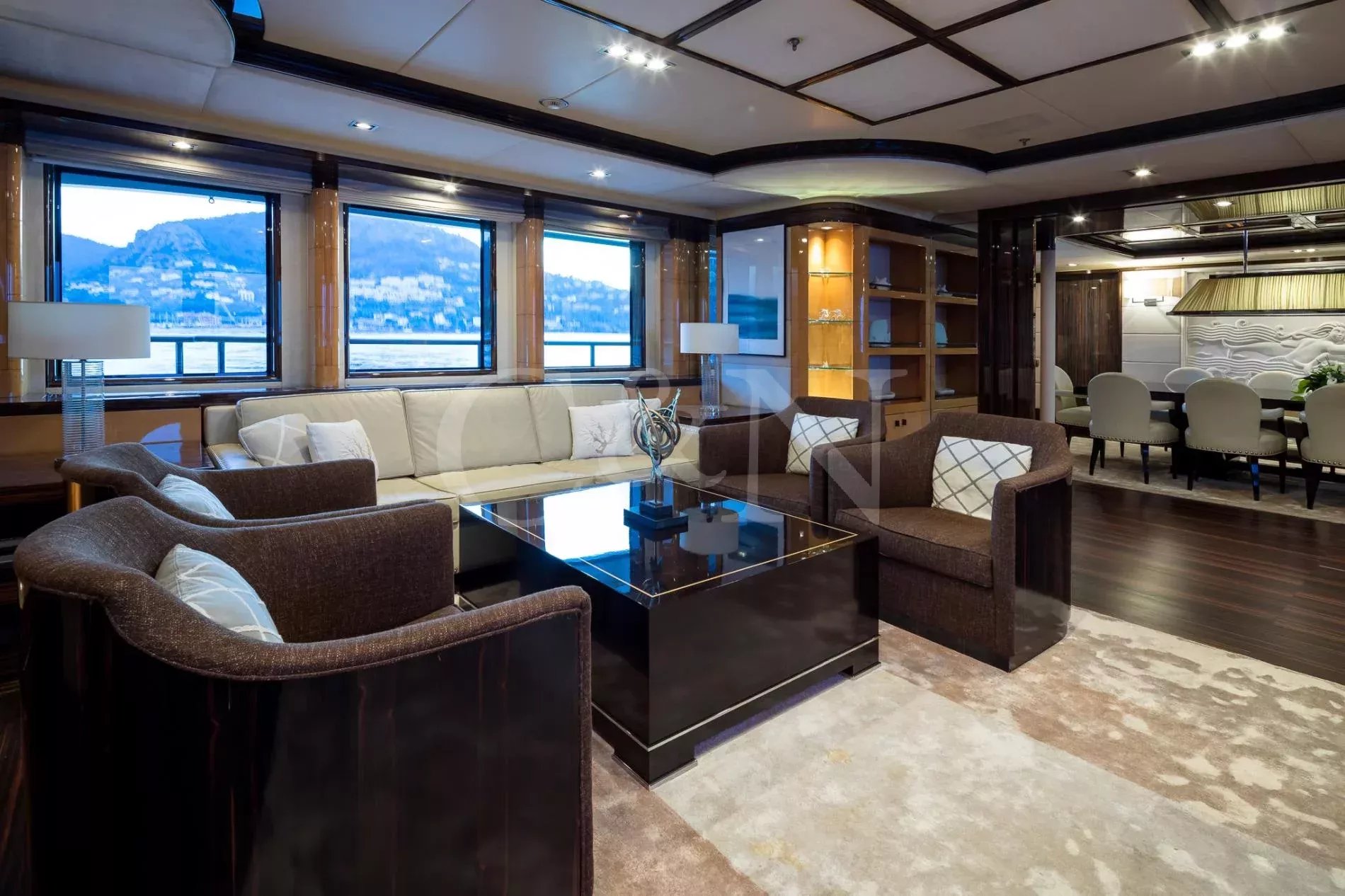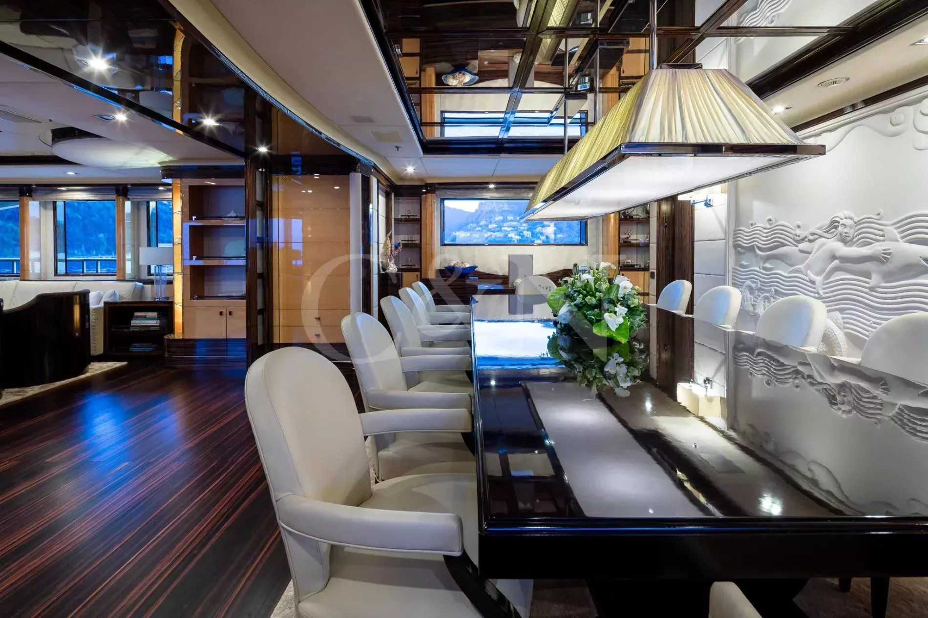 Vision is a beautiful example of a 60-metre Benetti, shaped to suit every mood and moment —spacious where it counts, social when it matters, and private when you want it to be. Every element, from the split-level master suite to her expansive sun deck, has been fine-tuned to invite deep relaxation or celebration. With a warm and attentive crew, she delivers the kind of charter experience that runs seamlessly in the background, letting the setting, and the company, take centre stage.Vision's interiors are rich and elegant, shaped by the deft hand of Parisian designer Pierre-Yves Rochon. Celebrated for his work with the Waldorf Astoria, The Savoy and Four Seasons, he brings his hospitality nous to the water, creating an atmosphere that feels instantly inviting. The main salon layers high-gloss Macassar ebony with figured Tanganyika frisé and polished mahogany, all softened by silk carpets underfoot. A sculptural plaster bas-relief of Amphitrite, Greek goddess of the sea, presides over the formal dining space and lends it a sense of grandeur. Nautical cues appear throughout the interior, from a curated collection of objets d’art to a dramatic three-storey mural of sirens and swirling seas that winds around the central stairwell and adds a touch of whimsy. Up on the bridge deck, the upper saloon shifts into a more relaxed gear. A naturally cool retreat, it features a polished black stone sit-up bar, with sofas and armchairs to enjoy a refreshing aperitif. Guests can unwind in comfort, sheltered from the afternoon sun and surrounded by sea views.Vision sleeps up to 12 guests in six beautifully appointed cabins that prioritise space, privacy, and calm. The standout is a split-level master suite that is more akin to a private residence than a typical stateroom, complete with a lounge area, office, and dual walk-in wardrobes. A sliding partition allows for flexible use of the space, while the bed is positioned beneath an oversized skylight that floods the room with natural light. The en suite bathroom is equally indulgent, with his-and-hers vanities, a freestanding tub, and a separate rainfall shower. A VIP suite on the upper deck can double as a dedicated spa and wellness space depending on the number of guests on board. On the lower, there are two generous double cabins and two twin cabins can convert to doubles, making VISON the perfect for large families or flexible groups. Each cabin is finished in a palette of warm woods, handselected marbles, and soft lighting.Vision's outdoor decks have been curated to deliver unforgettable moments from sunrise to starlight. An expansive sun deck is the ultimate social space with a raised Jacuzzi wrapped in glass to shelter from the elements, and a full bar just steps away. Aft, a versatile lounge with swivel daybeds shifts effortlessly into party mode after dark, thanks to a plug-and-play AV setup. For more relaxed occasions, the upper aft deck offers a change of pace. It invites alfresco dining beneath the shade, with a large table set for leisurely lunches or dinners at anchor. Built-in sofas hug the corners of the deck, paired with low coffee tables that form a series of quiet nooks.From adrenaline-fuelled mornings to sun-soaked afternoons, Vision comes fully loaded for every kind of guest adventure. A teak swim platform offers easy access to the sea via removable steps and includes a freshwater shower for rinsing off. A beach club is furnished with loose seating that can be reconfigured for lounging, sunbathing, or watching friends and family take the jet skis for a spin.