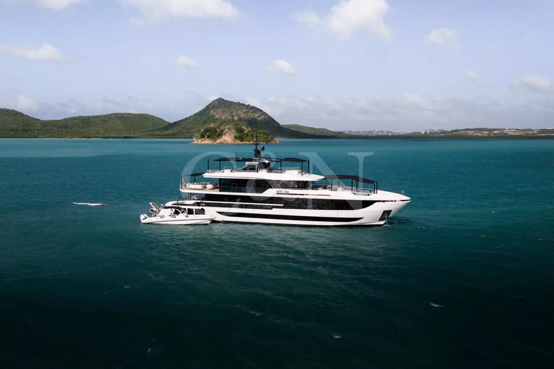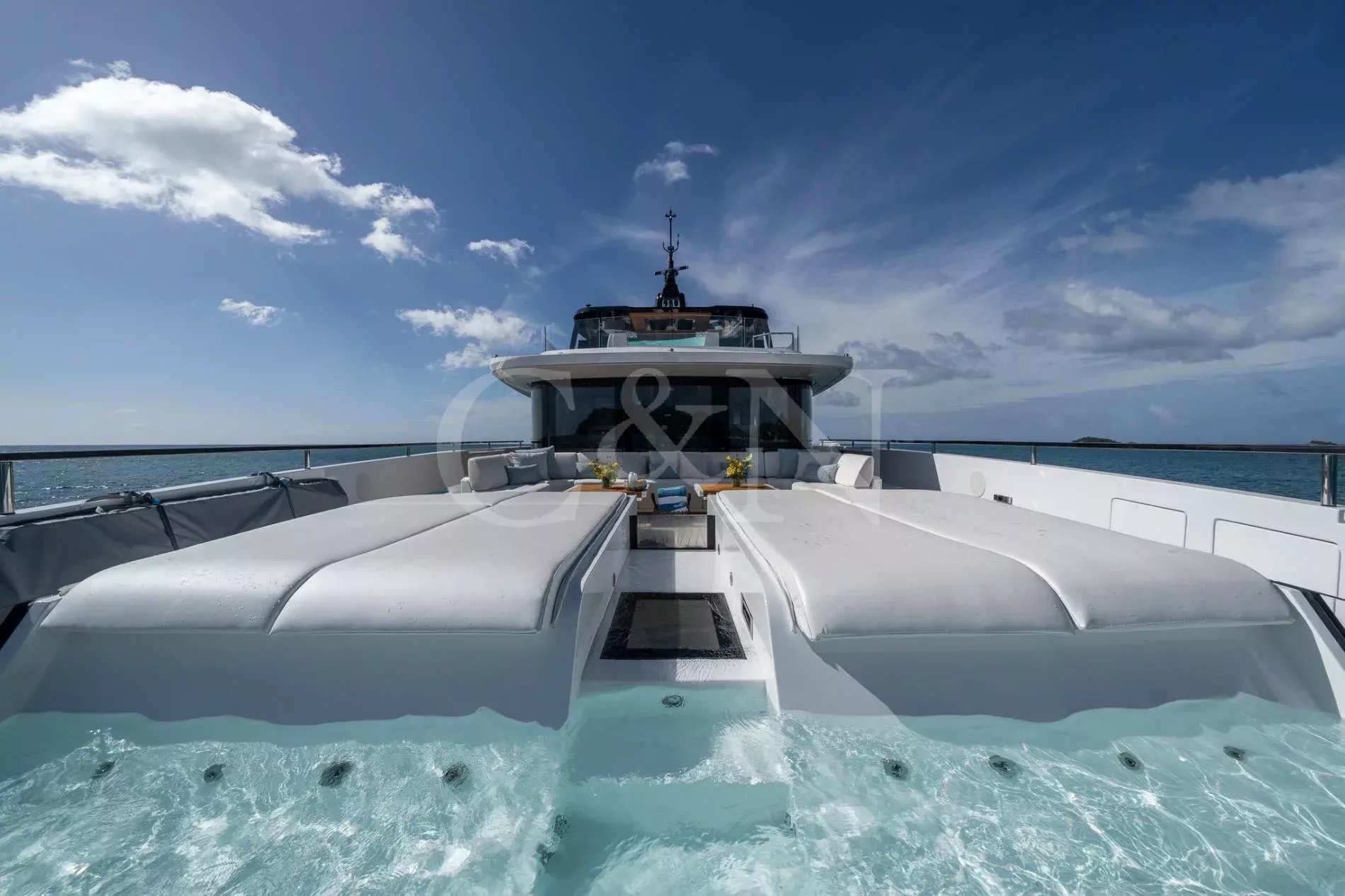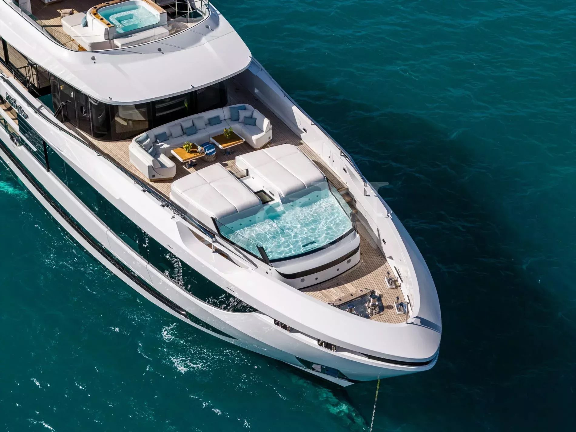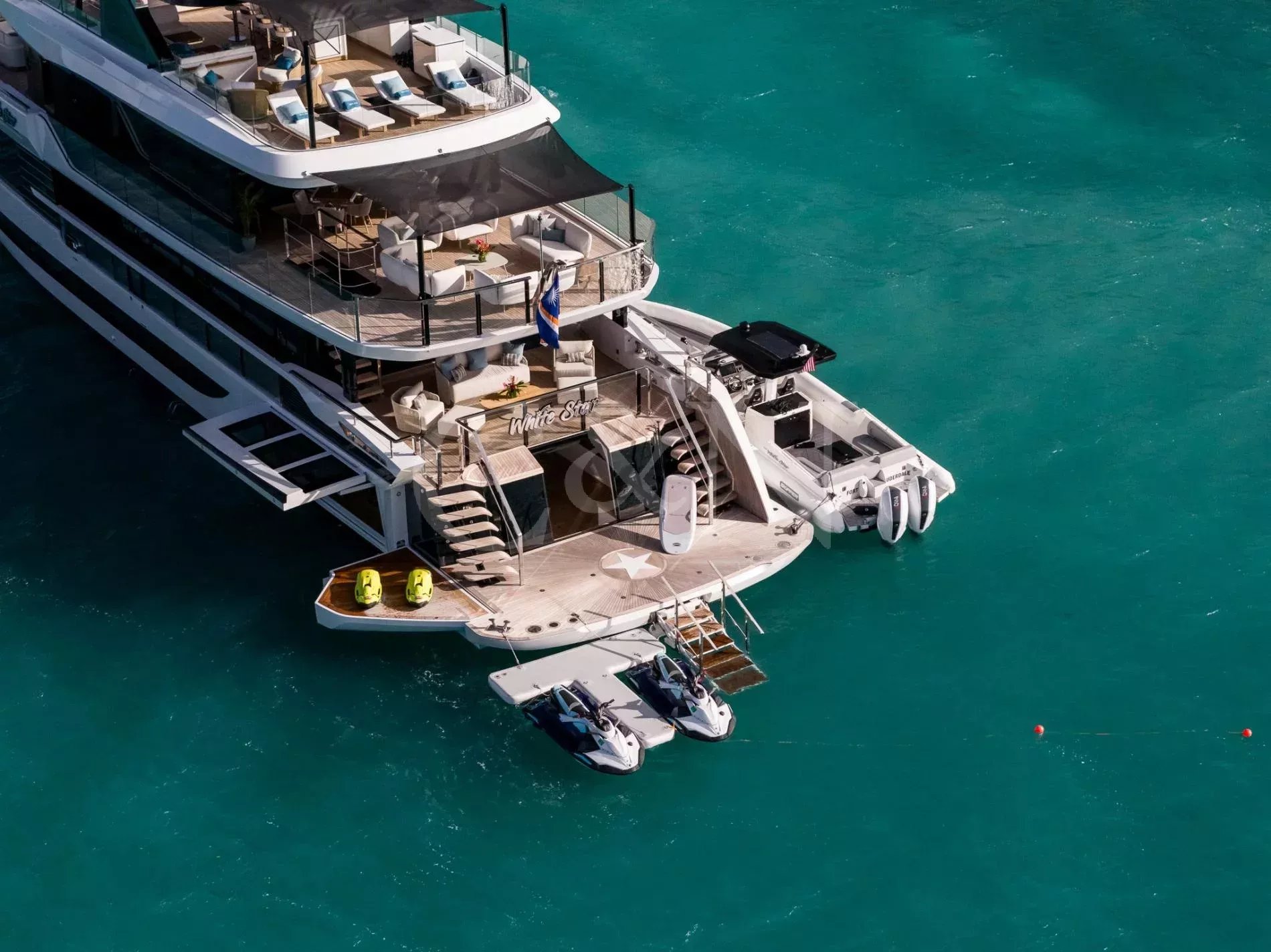 WHITE STAR makes her charter debut this season as one of Mangusta’s newest Oceano 39s. No detail has been spared in her design. A wide beam creates exceptional space across light-filled interiors and expansive decks, complete with a plunge pool, sixperson jacuzzi and flexible spaces designed to make the most of the sunshine year-round. She cruises with a 38ft Skipper tender in tow for days spent island hopping, while a dedicated beach club and a full suite of water toys bring fun on demand at anchor. An exceptional 7-to-10 crew-to-guest ratio ensures tailored service at every turn, whether the day calls for celebration, relaxation, or adventure on the water.The sundeck is home to a six-person Jacuzzi with wraparound seating, served by a full bar. Swivel lounge chairs, a slide-out Yeti cooler, 10-speaker sound system and BBQ make this the ultimate spot for relaxed afternoons or lively evenings. At the bow, a glass-fronted plunge pool with a curved shelf for lounging in the shallows is flanked by sun pads and hi-lo tables that transform from cocktail tables to dining. An awning can be set over the pool for shade. The bridge deck aft is a flexible space with an al fresco dining table that seats 10, which can be removed to make way for dance floor thanks to a custom DJ AV system. Below on the main deck aft, swivel chairs look straight out over the wake.In the main salon, a walkaround Calacatta marble bar with stools takes centre stage as a convivial spot for fresh juices or cocktails. Set on a high–low mechanism, its smart design allows it to transform from a sit-up bar to a formal dining table for ten in seconds. The space also has lounge seating, a concealed 65-inch surround sound TV, and sliding glass doors to the aft deck. On the bridge deck, a sky lounge is wrapped in triple glass sliders, opening on three sides to form a seamless indoor/outdoor space. An 80” surround sound TV, reclining seating, panoramic dining, and a walk-up bar make it as comfortable for movie nights as for afternoon cocktails. Throughout, brushed oak, natural stone, leather panelling, and muted fabrics create a serene atmosphere.The owner’s cabin is a sanctuary: a king-size bed, his-andhers bathrooms split by an oversized shower, ocean-view balcony with a glass floor, a private office, and extensive wardrobe space. Below deck, four guest cabins balance privacy with flexibility. Two VIP suites feature queen-size beds, desks, and rainfall showers. Two convertible cabins can be arranged as twins or queens, each with its own en-suite. Every space is finished to the highest standard, ensuring a restful retreat after days in the sun.For shore runs, a 38ft Skipper tender reaches speeds of up to 65mph, making island-hopping a breeze, whether heading to a favourite beach bar, a secluded sandbar for a picnic, or a snorkelling spot. She also has a custom teak-clad beach club with sofas, an 85-inch TV, day head, bar, and an extensive collection of water toys.
