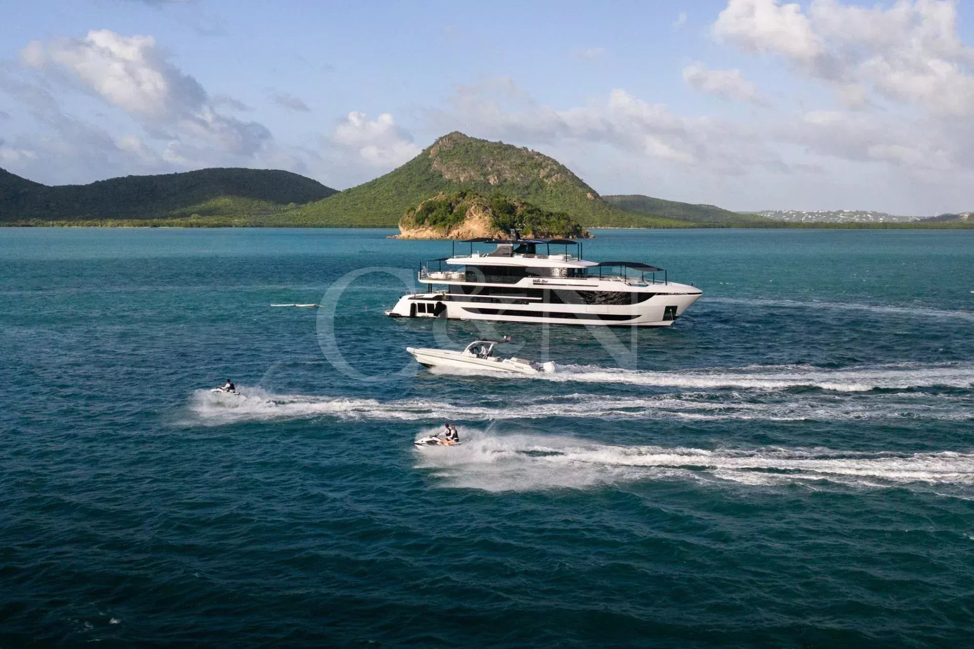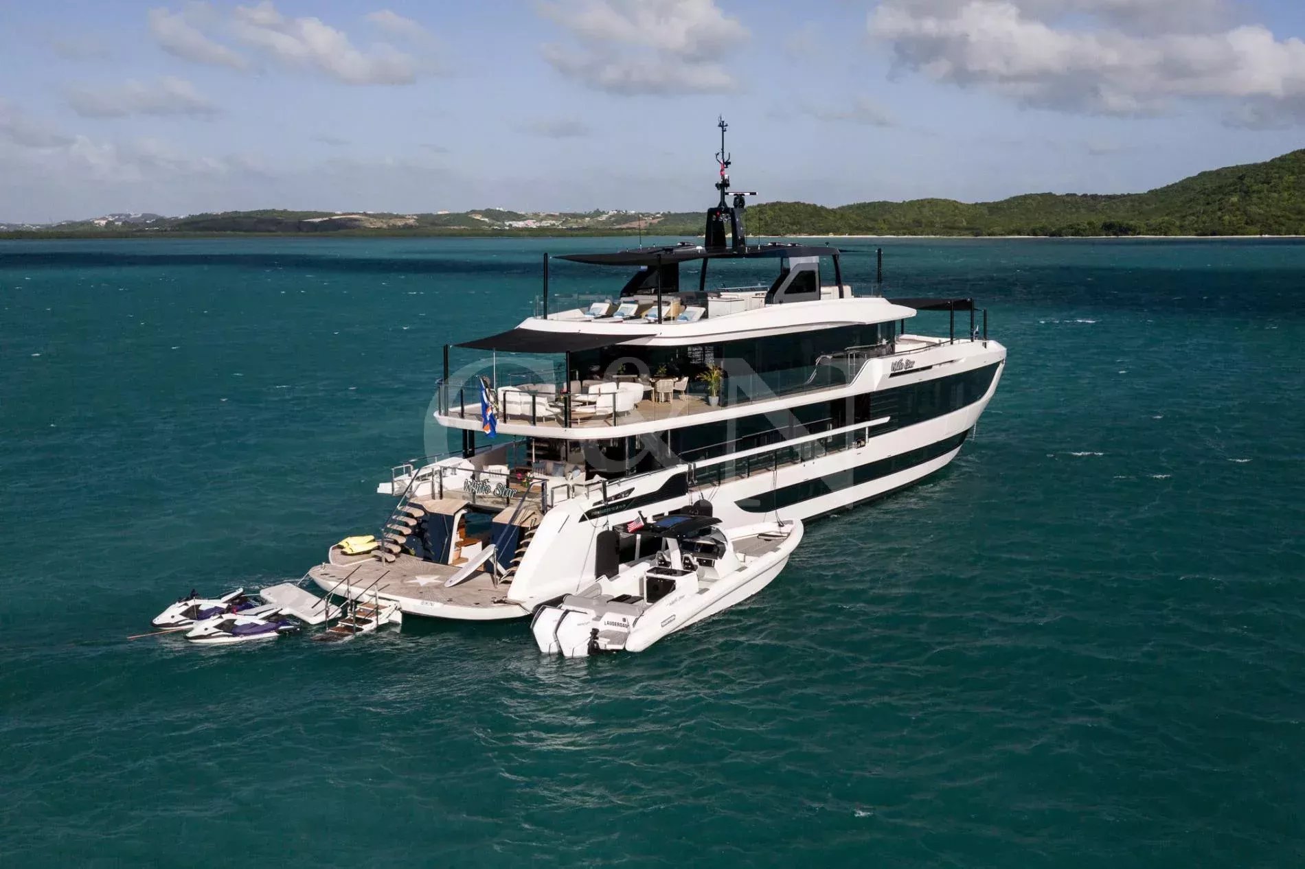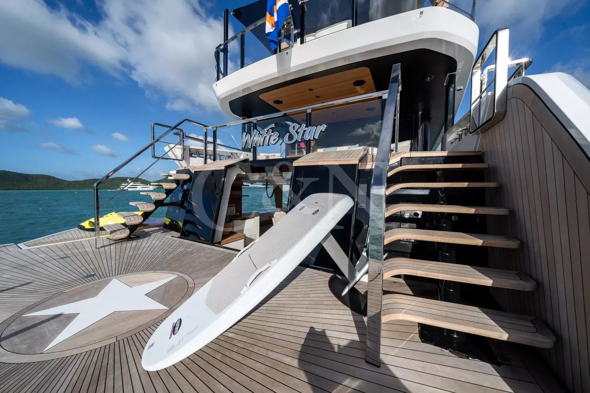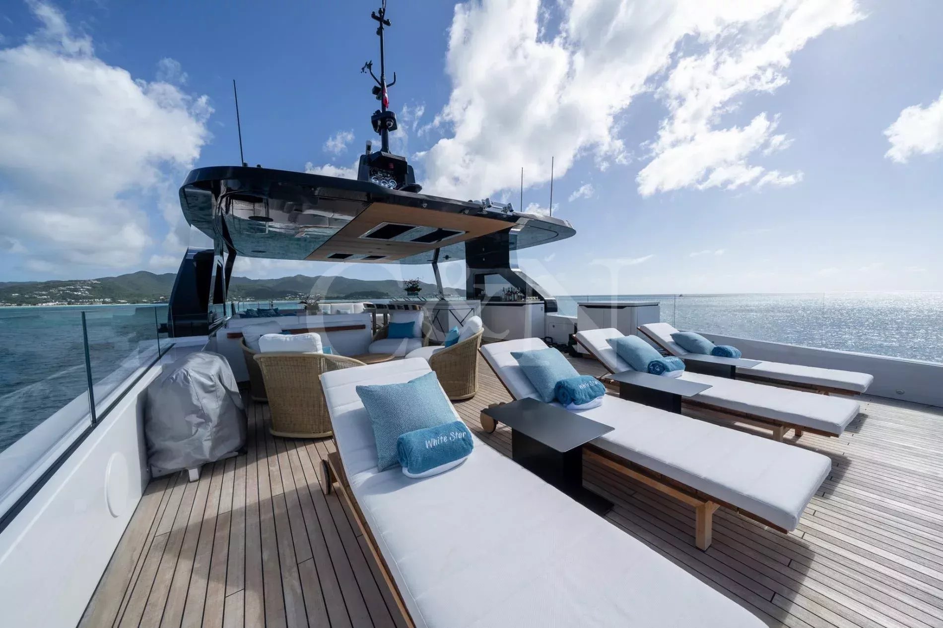 WHITE STAR makes her charter debut this season as one of Mangusta’s newest Oceano 39s. No detail has been spared in her design. A wide beam creates exceptional space across light-filled interiors and expansive decks, complete with a plunge pool, sixperson jacuzzi and flexible spaces designed to make the most of the sunshine year-round. She cruises with a 38ft Skipper tender in tow for days spent island hopping, while a dedicated beach club and a full suite of water toys bring fun on demand at anchor. An exceptional 7-to-10 crew-to-guest ratio ensures tailored service at every turn, whether the day calls for celebration, relaxation, or adventure on the water.The sundeck is home to a six-person Jacuzzi with wraparound seating, served by a full bar. Swivel lounge chairs, a slide-out Yeti cooler, 10-speaker sound system and BBQ make this the ultimate spot for relaxed afternoons or lively evenings. At the bow, a glass-fronted plunge pool with a curved shelf for lounging in the shallows is flanked by sun pads and hi-lo tables that transform from cocktail tables to dining. An awning can be set over the pool for shade. The bridge deck aft is a flexible space with an al fresco dining table that seats 10, which can be removed to make way for dance floor thanks to a custom DJ AV system. Below on the main deck aft, swivel chairs look straight out over the wake.In the main salon, a walkaround Calacatta marble bar with stools takes centre stage as a convivial spot for fresh juices or cocktails. Set on a high–low mechanism, its smart design allows it to transform from a sit-up bar to a formal dining table for ten in seconds. The space also has lounge seating, a concealed 65-inch surround sound TV, and sliding glass doors to the aft deck. On the bridge deck, a sky lounge is wrapped in triple glass sliders, opening on three sides to form a seamless indoor/outdoor space. An 80” surround sound TV, reclining seating, panoramic dining, and a walk-up bar make it as comfortable for movie nights as for afternoon cocktails. Throughout, brushed oak, natural stone, leather panelling, and muted fabrics create a serene atmosphere.The owner’s cabin is a sanctuary: a king-size bed, his-andhers bathrooms split by an oversized shower, ocean-view balcony with a glass floor, a private office, and extensive wardrobe space. Below deck, four guest cabins balance privacy with flexibility. Two VIP suites feature queen-size beds, desks, and rainfall showers. Two convertible cabins can be arranged as twins or queens, each with its own en-suite. Every space is finished to the highest standard, ensuring a restful retreat after days in the sun.For shore runs, a 38ft Skipper tender reaches speeds of up to 65mph, making island-hopping a breeze, whether heading to a favourite beach bar, a secluded sandbar for a picnic, or a snorkelling spot. She also has a custom teak-clad beach club with sofas, an 85-inch TV, day head, bar, and an extensive collection of water toys.