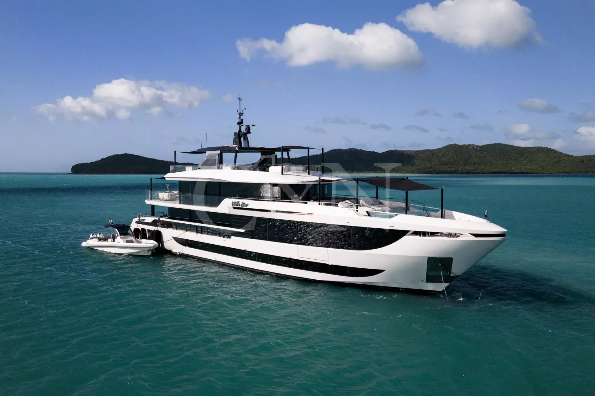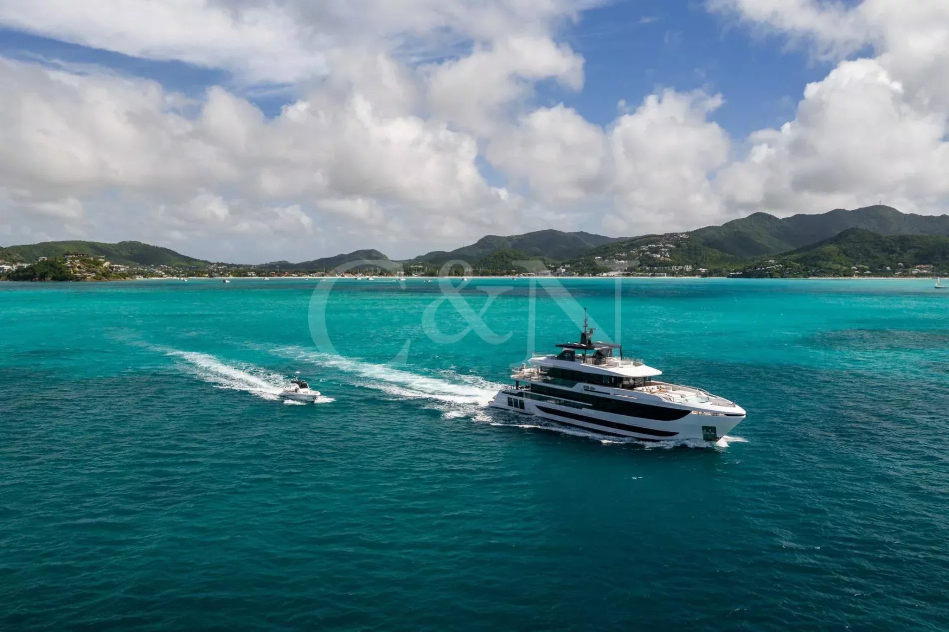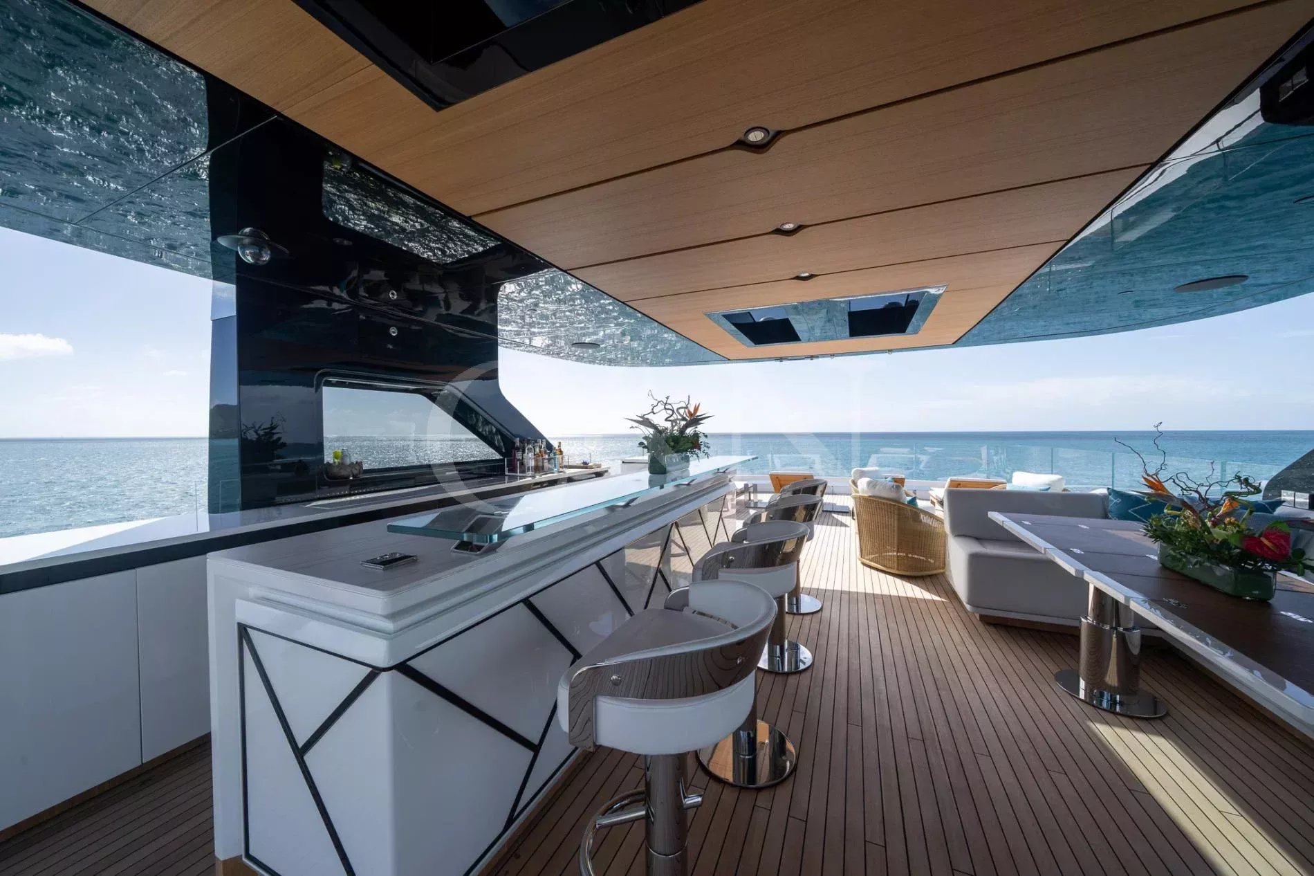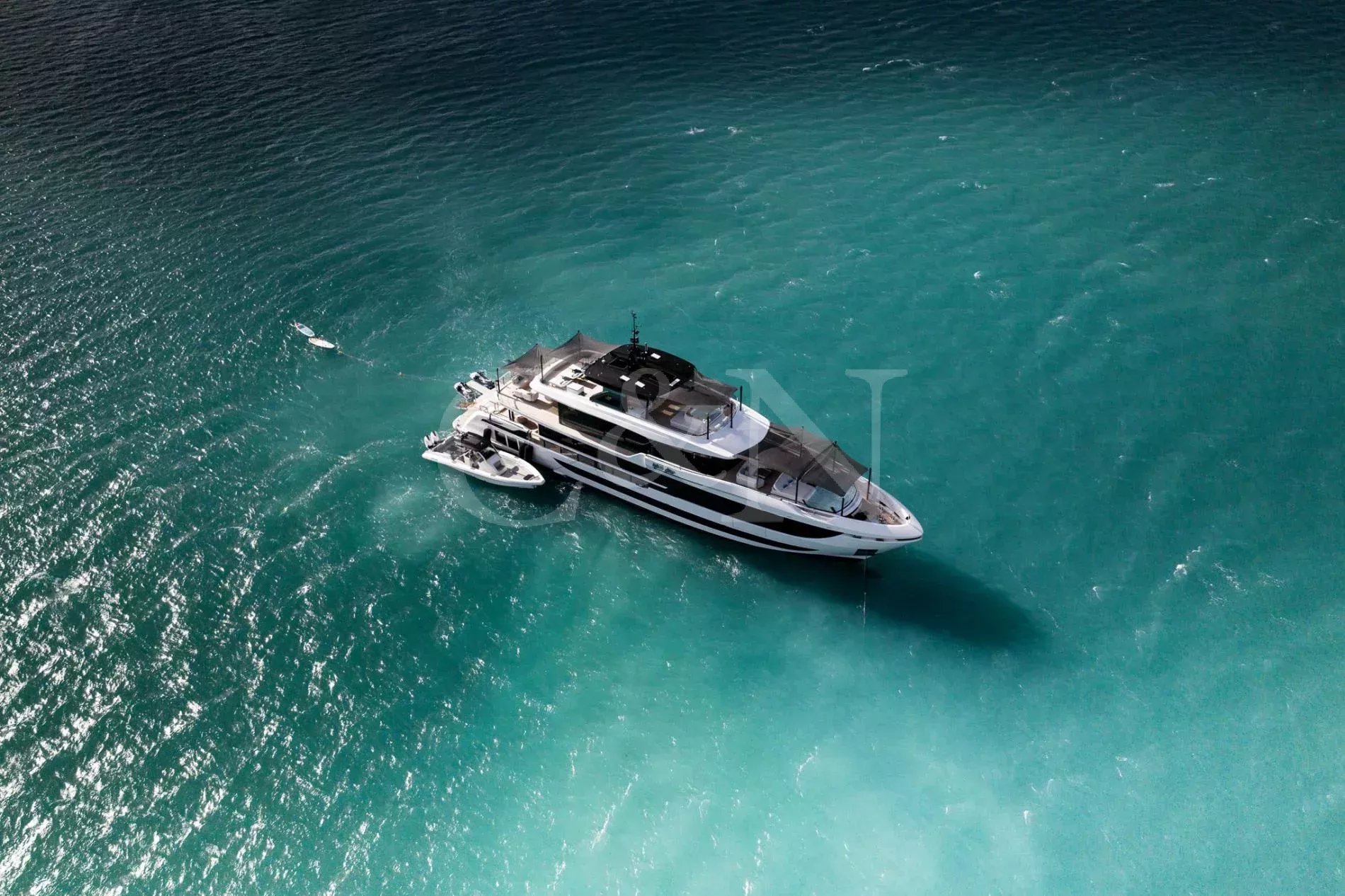 WHITE STAR makes her charter debut this season as one of Mangusta’s newest Oceano 39s. No detail has been spared in her design. A wide beam creates exceptional space across light-filled interiors and expansive decks, complete with a plunge pool, sixperson jacuzzi and flexible spaces designed to make the most of the sunshine year-round. She cruises with a 38ft Skipper tender in tow for days spent island hopping, while a dedicated beach club and a full suite of water toys bring fun on demand at anchor. An exceptional 7-to-10 crew-to-guest ratio ensures tailored service at every turn, whether the day calls for celebration, relaxation, or adventure on the water.The sundeck is home to a six-person Jacuzzi with wraparound seating, served by a full bar. Swivel lounge chairs, a slide-out Yeti cooler, 10-speaker sound system and BBQ make this the ultimate spot for relaxed afternoons or lively evenings. At the bow, a glass-fronted plunge pool with a curved shelf for lounging in the shallows is flanked by sun pads and hi-lo tables that transform from cocktail tables to dining. An awning can be set over the pool for shade. The bridge deck aft is a flexible space with an al fresco dining table that seats 10, which can be removed to make way for dance floor thanks to a custom DJ AV system. Below on the main deck aft, swivel chairs look straight out over the wake.In the main salon, a walkaround Calacatta marble bar with stools takes centre stage as a convivial spot for fresh juices or cocktails. Set on a high–low mechanism, its smart design allows it to transform from a sit-up bar to a formal dining table for ten in seconds. The space also has lounge seating, a concealed 65-inch surround sound TV, and sliding glass doors to the aft deck. On the bridge deck, a sky lounge is wrapped in triple glass sliders, opening on three sides to form a seamless indoor/outdoor space. An 80” surround sound TV, reclining seating, panoramic dining, and a walk-up bar make it as comfortable for movie nights as for afternoon cocktails. Throughout, brushed oak, natural stone, leather panelling, and muted fabrics create a serene atmosphere.The owner’s cabin is a sanctuary: a king-size bed, his-andhers bathrooms split by an oversized shower, ocean-view balcony with a glass floor, a private office, and extensive wardrobe space. Below deck, four guest cabins balance privacy with flexibility. Two VIP suites feature queen-size beds, desks, and rainfall showers. Two convertible cabins can be arranged as twins or queens, each with its own en-suite. Every space is finished to the highest standard, ensuring a restful retreat after days in the sun.For shore runs, a 38ft Skipper tender reaches speeds of up to 65mph, making island-hopping a breeze, whether heading to a favourite beach bar, a secluded sandbar for a picnic, or a snorkelling spot. She also has a custom teak-clad beach club with sofas, an 85-inch TV, day head, bar, and an extensive collection of water toys.