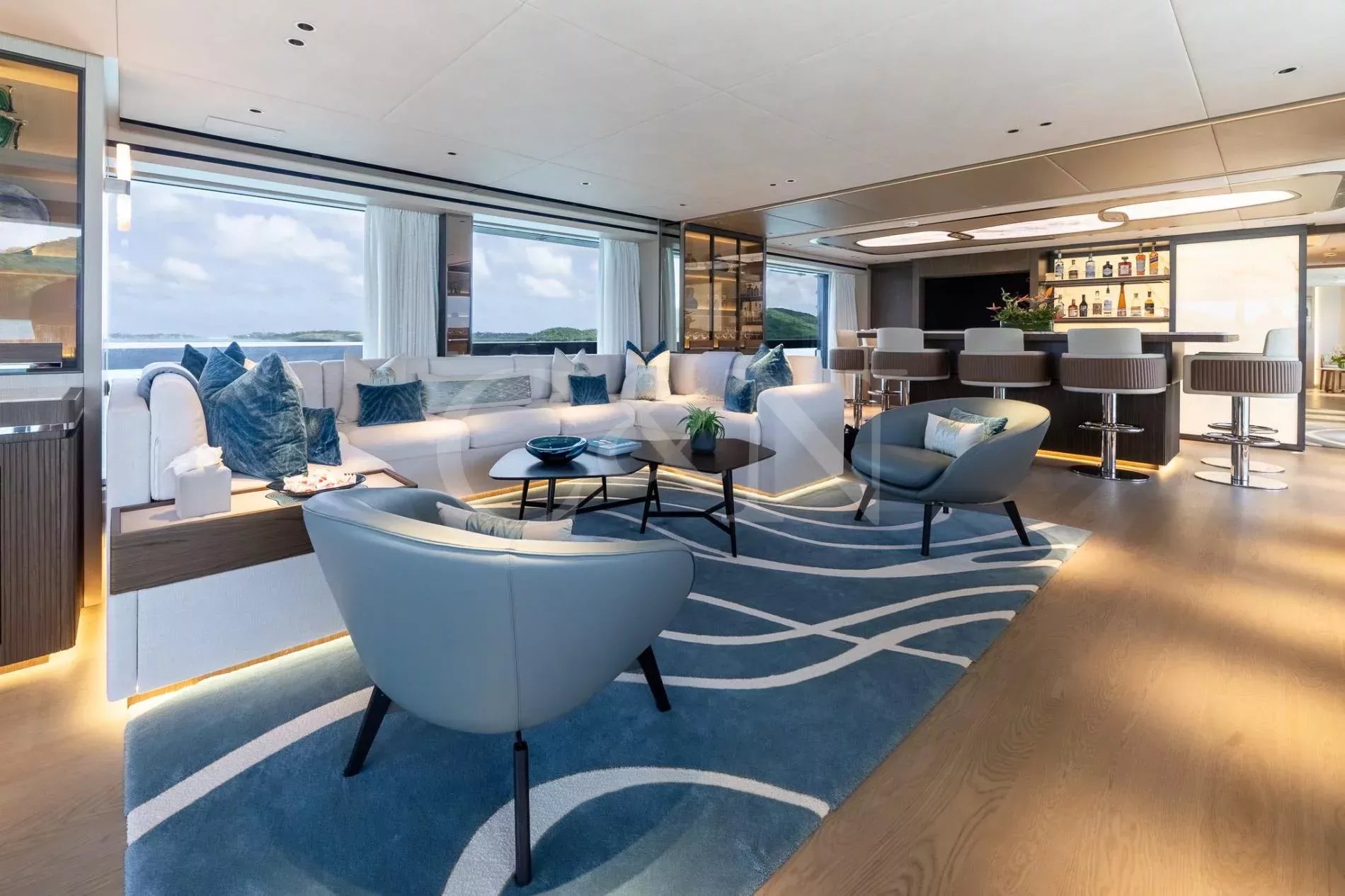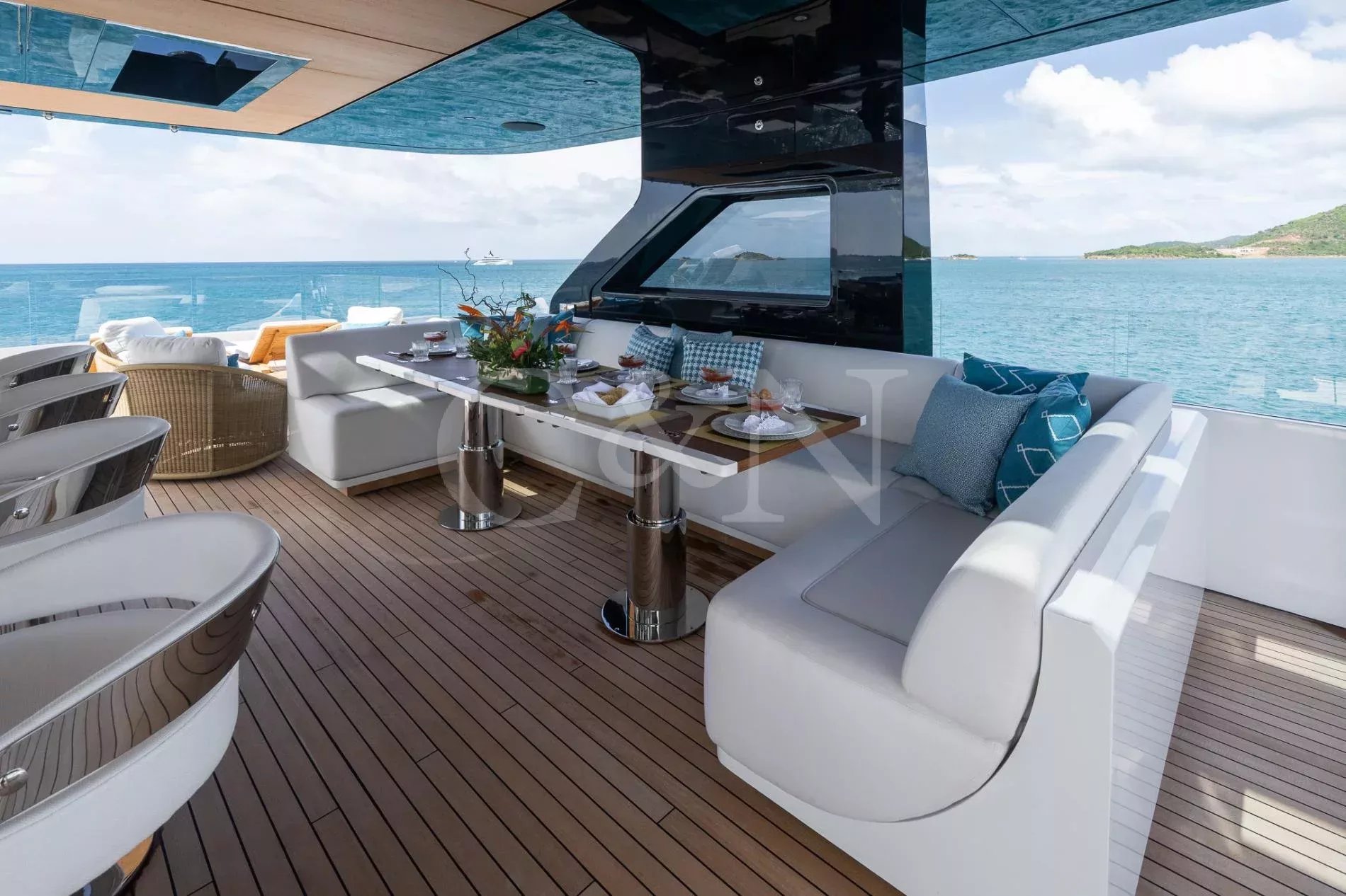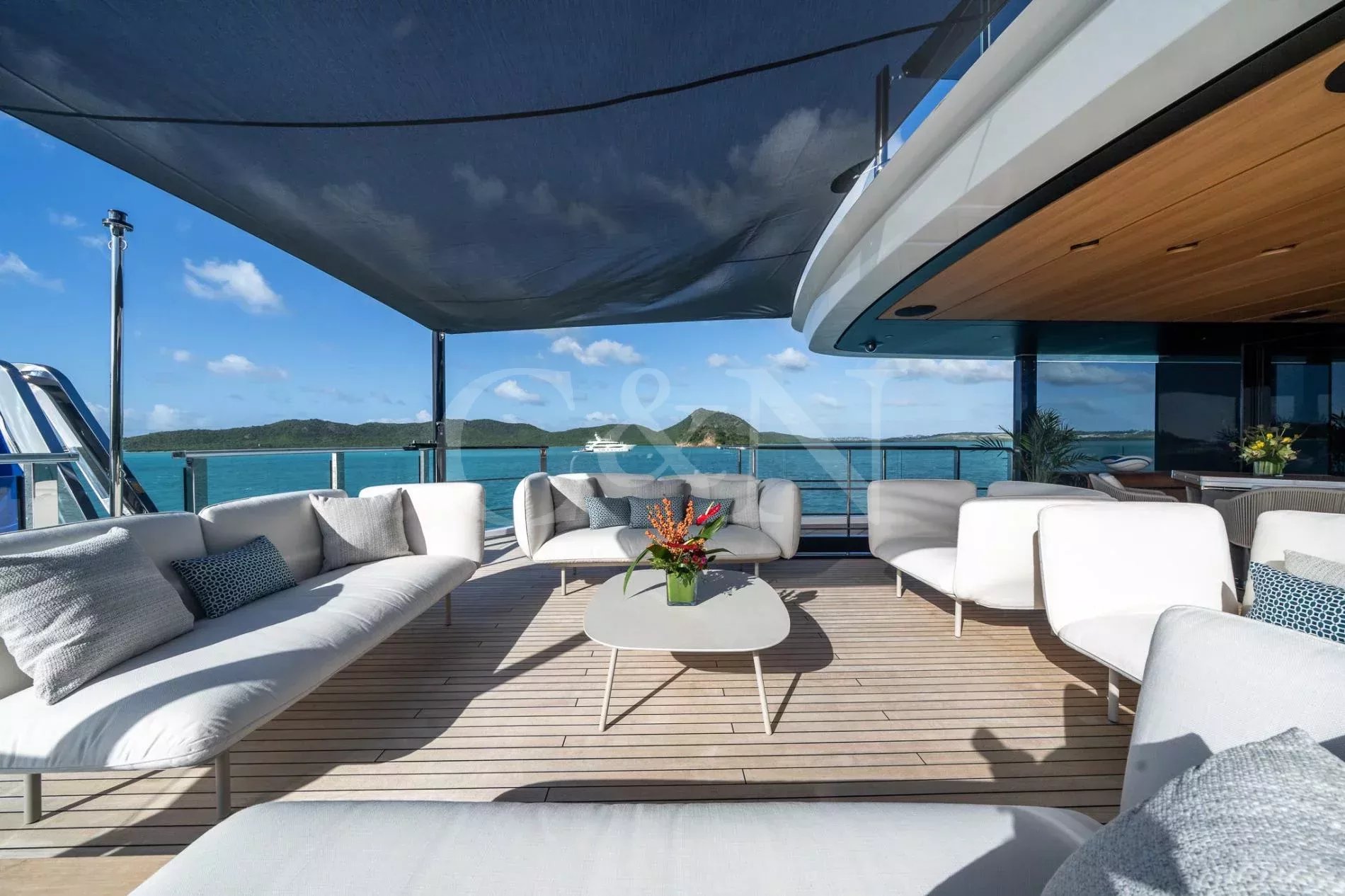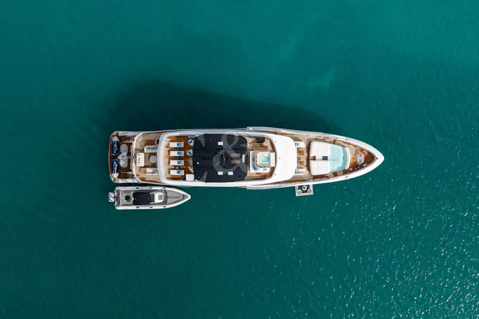 WHITE STAR makes her charter debut this season as one of Mangusta’s newest Oceano 39s. No detail has been spared in her design. A wide beam creates exceptional space across light-filled interiors and expansive decks, complete with a plunge pool, sixperson jacuzzi and flexible spaces designed to make the most of the sunshine year-round. She cruises with a 38ft Skipper tender in tow for days spent island hopping, while a dedicated beach club and a full suite of water toys bring fun on demand at anchor. An exceptional 7-to-10 crew-to-guest ratio ensures tailored service at every turn, whether the day calls for celebration, relaxation, or adventure on the water.The sundeck is home to a six-person Jacuzzi with wraparound seating, served by a full bar. Swivel lounge chairs, a slide-out Yeti cooler, 10-speaker sound system and BBQ make this the ultimate spot for relaxed afternoons or lively evenings. At the bow, a glass-fronted plunge pool with a curved shelf for lounging in the shallows is flanked by sun pads and hi-lo tables that transform from cocktail tables to dining. An awning can be set over the pool for shade. The bridge deck aft is a flexible space with an al fresco dining table that seats 10, which can be removed to make way for dance floor thanks to a custom DJ AV system. Below on the main deck aft, swivel chairs look straight out over the wake.In the main salon, a walkaround Calacatta marble bar with stools takes centre stage as a convivial spot for fresh juices or cocktails. Set on a high–low mechanism, its smart design allows it to transform from a sit-up bar to a formal dining table for ten in seconds. The space also has lounge seating, a concealed 65-inch surround sound TV, and sliding glass doors to the aft deck. On the bridge deck, a sky lounge is wrapped in triple glass sliders, opening on three sides to form a seamless indoor/outdoor space. An 80” surround sound TV, reclining seating, panoramic dining, and a walk-up bar make it as comfortable for movie nights as for afternoon cocktails. Throughout, brushed oak, natural stone, leather panelling, and muted fabrics create a serene atmosphere.The owner’s cabin is a sanctuary: a king-size bed, his-andhers bathrooms split by an oversized shower, ocean-view balcony with a glass floor, a private office, and extensive wardrobe space. Below deck, four guest cabins balance privacy with flexibility. Two VIP suites feature queen-size beds, desks, and rainfall showers. Two convertible cabins can be arranged as twins or queens, each with its own en-suite. Every space is finished to the highest standard, ensuring a restful retreat after days in the sun.For shore runs, a 38ft Skipper tender reaches speeds of up to 65mph, making island-hopping a breeze, whether heading to a favourite beach bar, a secluded sandbar for a picnic, or a snorkelling spot. She also has a custom teak-clad beach club with sofas, an 85-inch TV, day head, bar, and an extensive collection of water toys.