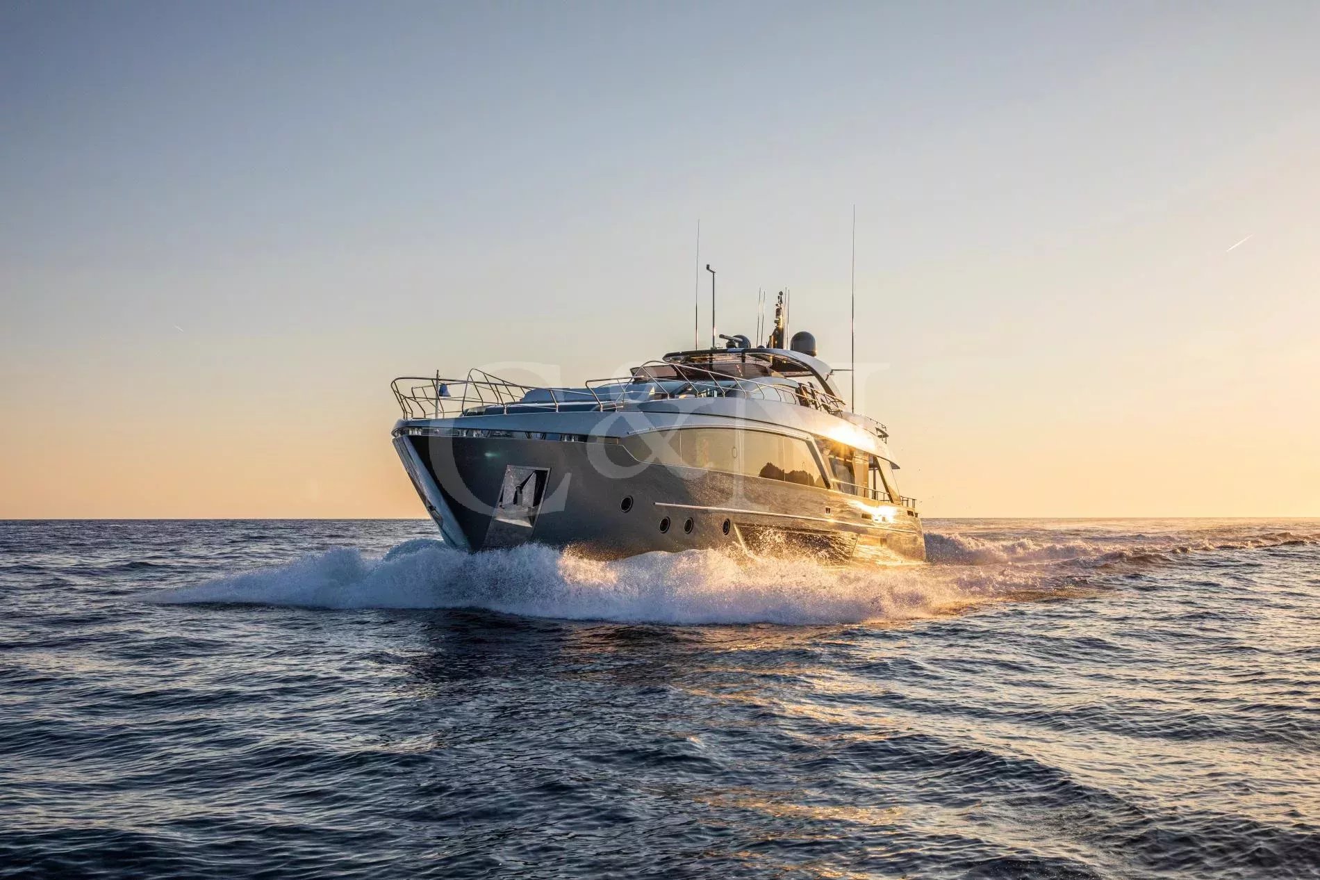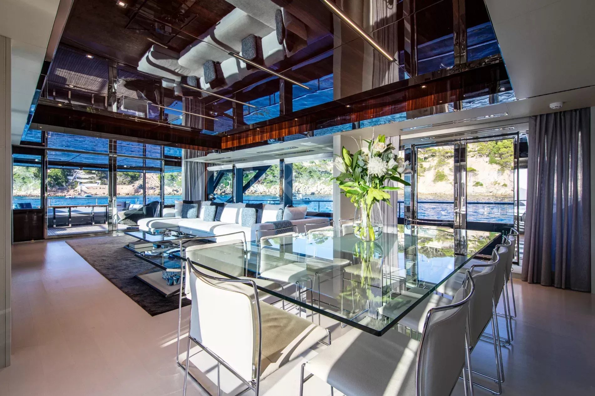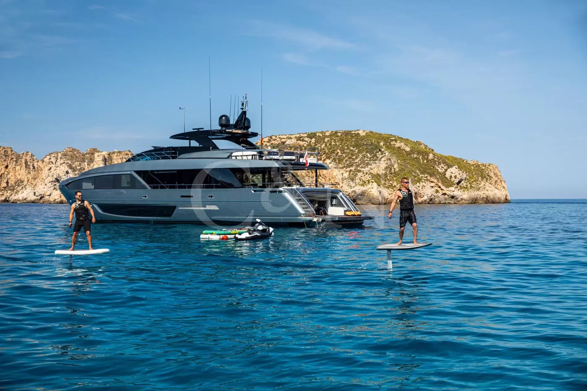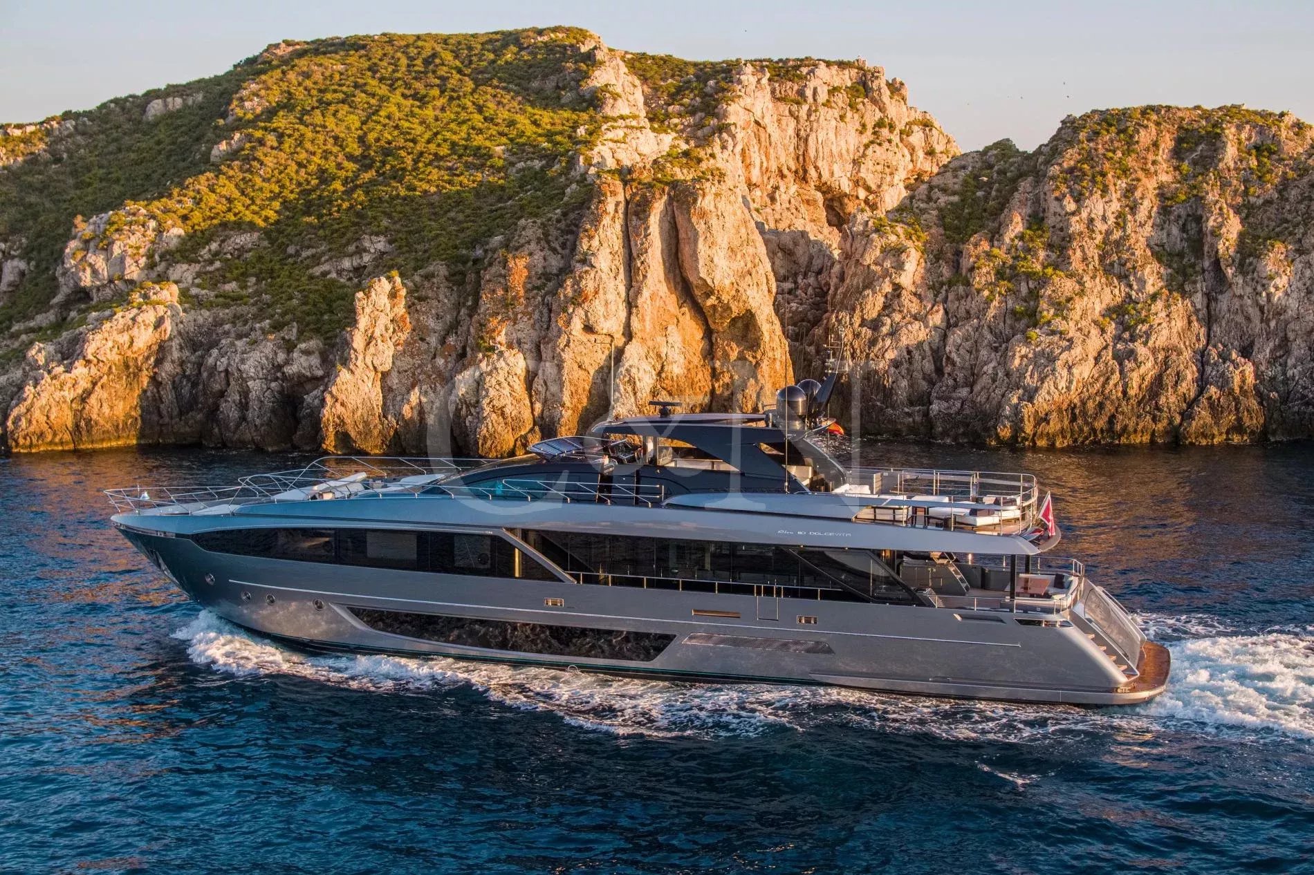 FIGURATI carries the unmistakable DNA of Riva, long hailed as the godfather of Italian design. Styled by Officina Italiana Design, this Dolcevita 110 sits at the top of Riva’s fibreglass fleet and brings a modern edge to one of the most recognisable names in yachting. Finished in Regal Silver and Shark Grey, she pairs elegant lines with a distinctly athletic spirit, and is accompanied by an Axopar 37 Brabus Edition chase boat for fast passages and day trips.The main salon is a calm, light-filled retreat where panoramic windows frame the sea from every angle. Low-profile furnishings maintain uninterrupted views, complemented by a palette of pale fabrics and glossy woods that heighten the sense of openness. The space transitions seamlessly from lounge to dining area, with twin sliding doors leading to the side decks, so guests can enjoy formal dining while the ocean breeze drifts through.FIGURATI accommodates up to eleven guests in five cabins. The full-beam master suite on the main deck features large windows, a king-size bed and double wardrobes to either side. A walk-in dressing area leads to an en suite bathroom finished in Carrara marble with a spacious walk-in shower. For guests working on board, a retractable screen allows the suite to double as a private office. On the lower deck, four guest cabins continue Riva’s palette of polished rosewood and soft fabrics. Three VIP suites each include a queen-size bed and double wardrobe, while the fourth cabin sleeps up to three guests in two single beds and a Pullman, or converts to a large double when required. Each cabin has its own en suite, plasma television, and iPad controls for lighting, climate and entertainment.The aft deck extends directly from the main salon, forming a single, open area that blurs the boundary between inside and out. It is a sociable, shaded space close to the water and a natural setting for breakfast and lunches at anchor. Above, the flybridge stretches the full length of the upper deck, combining dining, lounging and sunbathing into one continuous open space. A hardtop offers a shaded space to enjoy while integrated glass panels scatter sunlight across the deck. A bar occupies the centre of the space, serving both the lounging and dining areas. Modular, moveable furniture can be rearranged for morning workouts or cleared to transform the aft space into an open dance floor. From morning until night, it remains one of the most inviting places on board. Another favourite spot among guests is the foredeck, with a sofa, adjustable loungers and a Jacuzzi set into the deck.FIGURATI carries an impressive selection of toys and tenders, led by an 11.5m Axopar 37 Brabus Edition, a fast and highly capable chase boat. Perfect for day trips, watersports or exploring the coastline, it combines power and comfort to extend the reach of the yacht wherever she anchors.