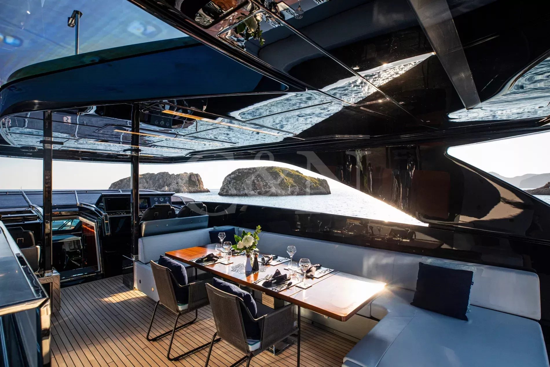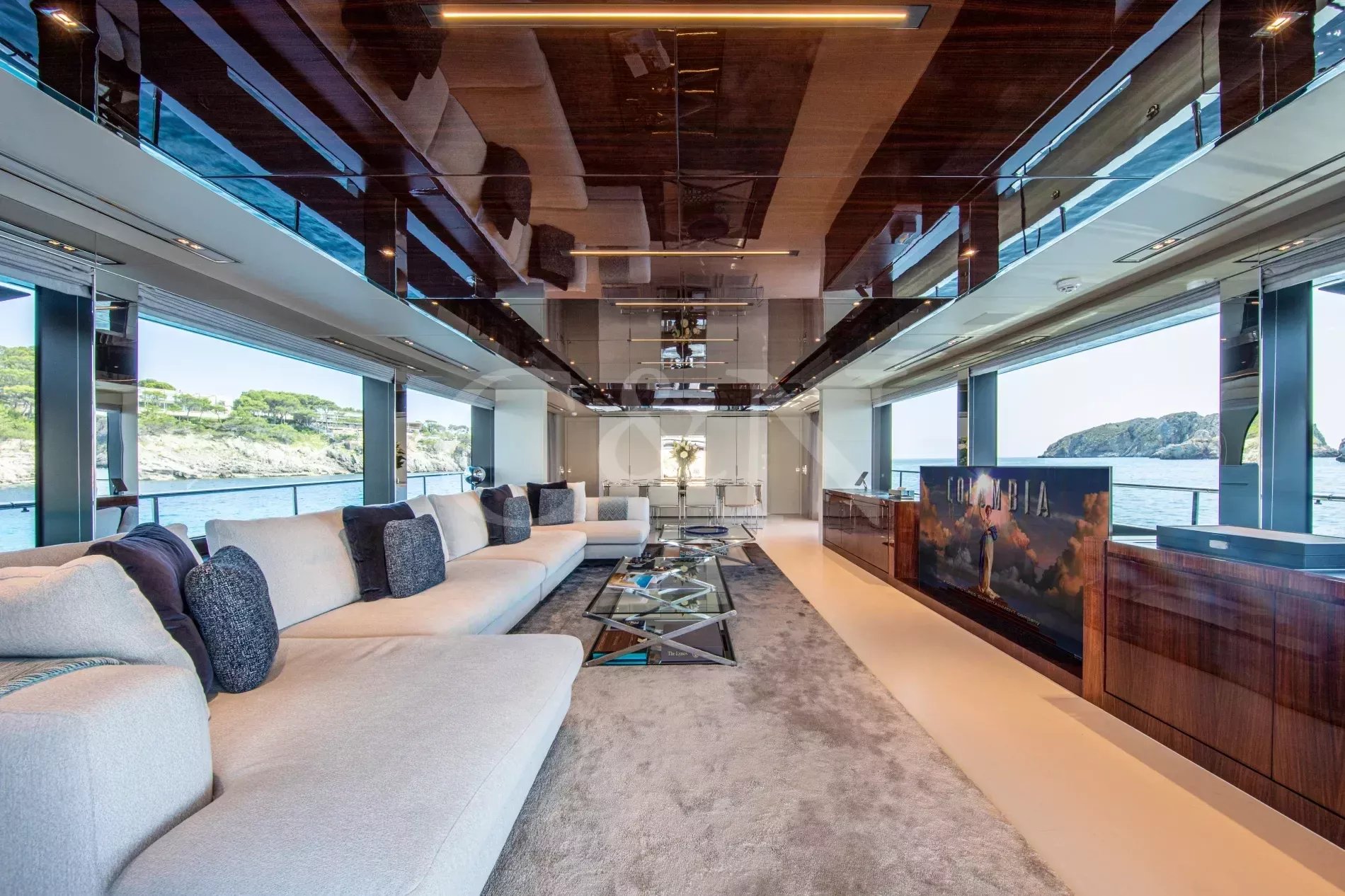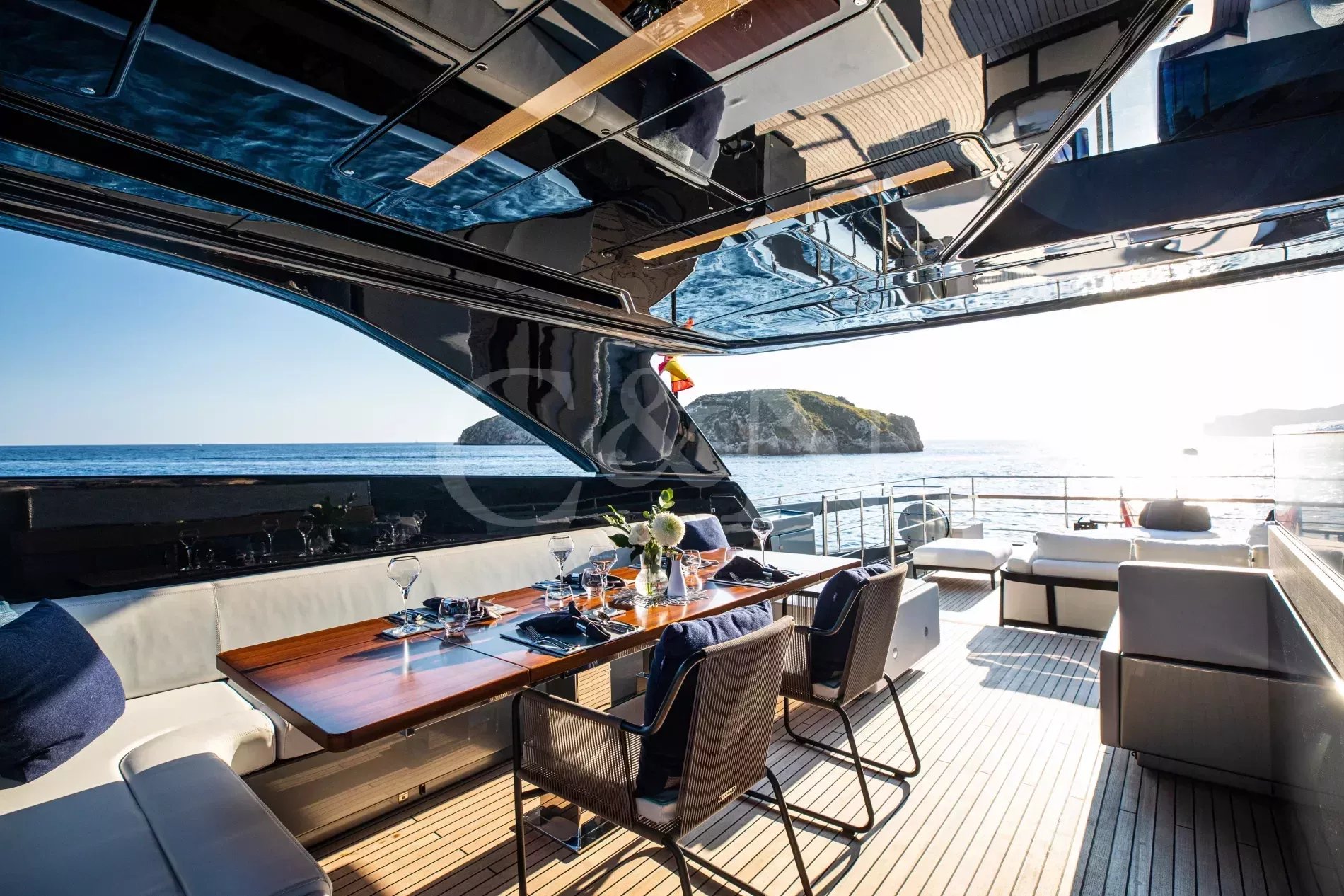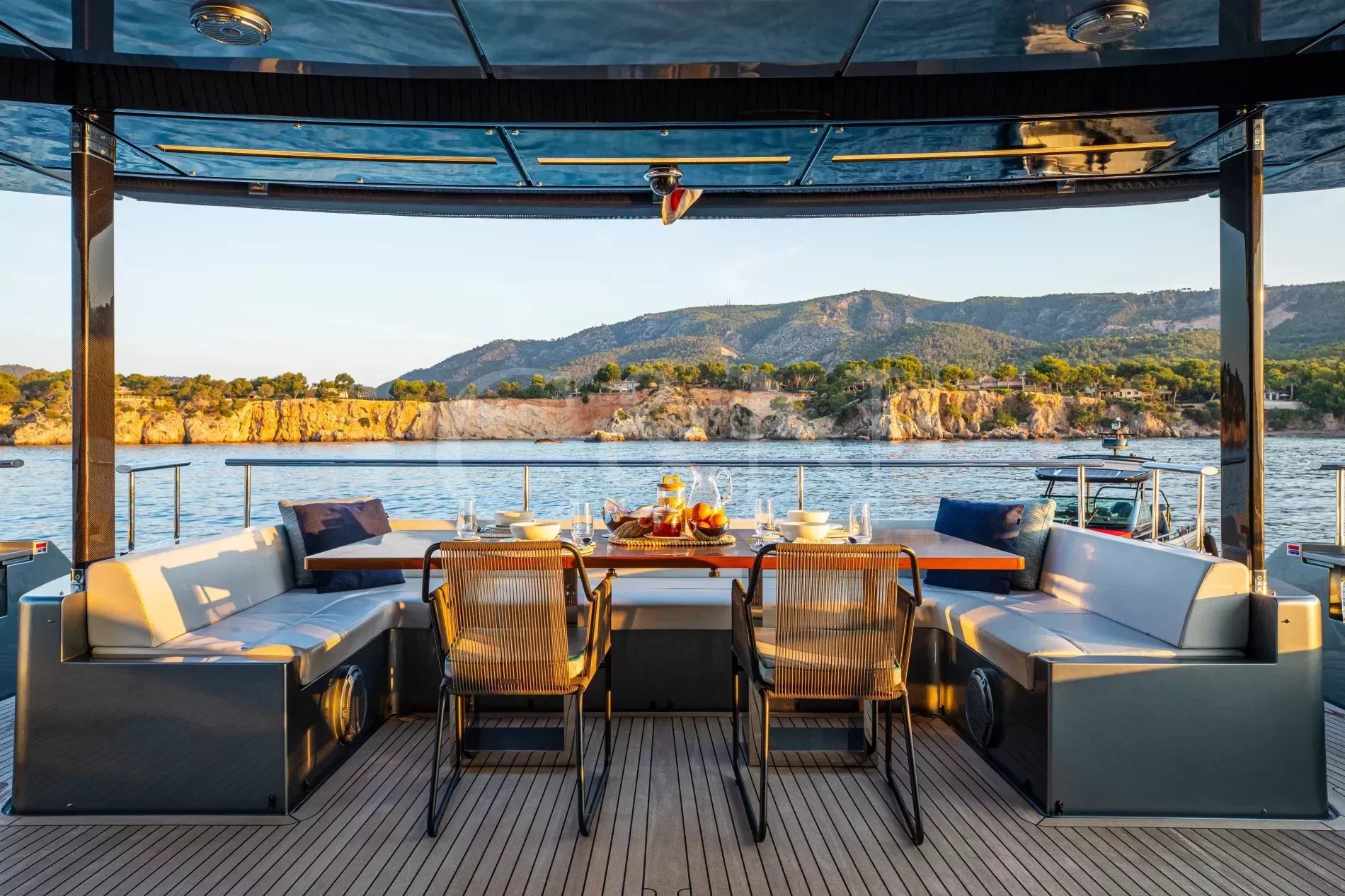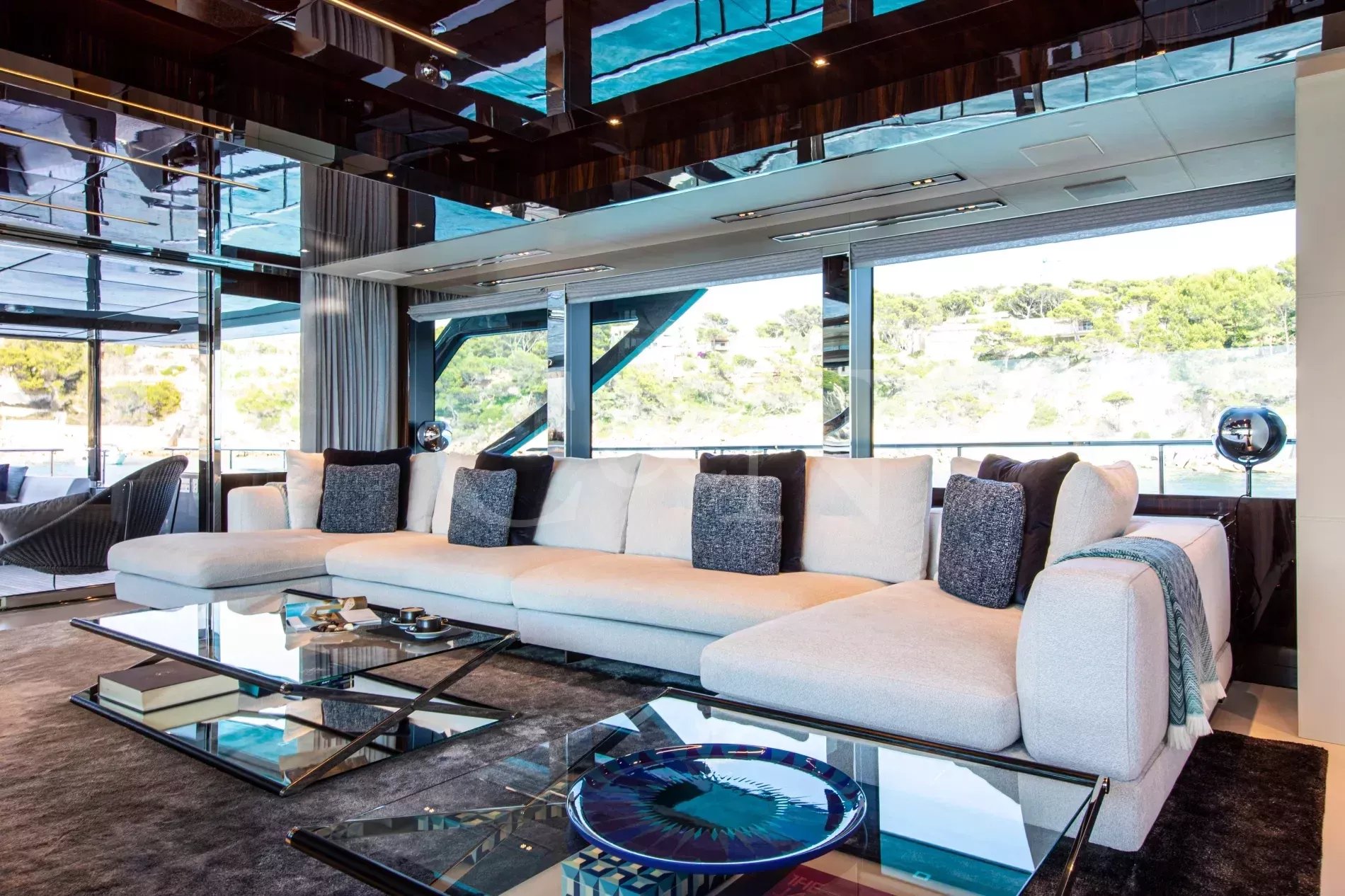 FIGURATI carries the unmistakable DNA of Riva, long hailed as the godfather of Italian design. Styled by Officina Italiana Design, this Dolcevita 110 sits at the top of Riva’s fibreglass fleet and brings a modern edge to one of the most recognisable names in yachting. Finished in Regal Silver and Shark Grey, she pairs elegant lines with a distinctly athletic spirit, and is accompanied by an Axopar 37 Brabus Edition chase boat for fast passages and day trips.The main salon is a calm, light-filled retreat where panoramic windows frame the sea from every angle. Low-profile furnishings maintain uninterrupted views, complemented by a palette of pale fabrics and glossy woods that heighten the sense of openness. The space transitions seamlessly from lounge to dining area, with twin sliding doors leading to the side decks, so guests can enjoy formal dining while the ocean breeze drifts through.FIGURATI accommodates up to eleven guests in five cabins. The full-beam master suite on the main deck features large windows, a king-size bed and double wardrobes to either side. A walk-in dressing area leads to an en suite bathroom finished in Carrara marble with a spacious walk-in shower. For guests working on board, a retractable screen allows the suite to double as a private office. On the lower deck, four guest cabins continue Riva’s palette of polished rosewood and soft fabrics. Three VIP suites each include a queen-size bed and double wardrobe, while the fourth cabin sleeps up to three guests in two single beds and a Pullman, or converts to a large double when required. Each cabin has its own en suite, plasma television, and iPad controls for lighting, climate and entertainment.The aft deck extends directly from the main salon, forming a single, open area that blurs the boundary between inside and out. It is a sociable, shaded space close to the water and a natural setting for breakfast and lunches at anchor. Above, the flybridge stretches the full length of the upper deck, combining dining, lounging and sunbathing into one continuous open space. A hardtop offers a shaded space to enjoy while integrated glass panels scatter sunlight across the deck. A bar occupies the centre of the space, serving both the lounging and dining areas. Modular, moveable furniture can be rearranged for morning workouts or cleared to transform the aft space into an open dance floor. From morning until night, it remains one of the most inviting places on board. Another favourite spot among guests is the foredeck, with a sofa, adjustable loungers and a Jacuzzi set into the deck.FIGURATI carries an impressive selection of toys and tenders, led by an 11.5m Axopar 37 Brabus Edition, a fast and highly capable chase boat. Perfect for day trips, watersports or exploring the coastline, it combines power and comfort to extend the reach of the yacht wherever she anchors.