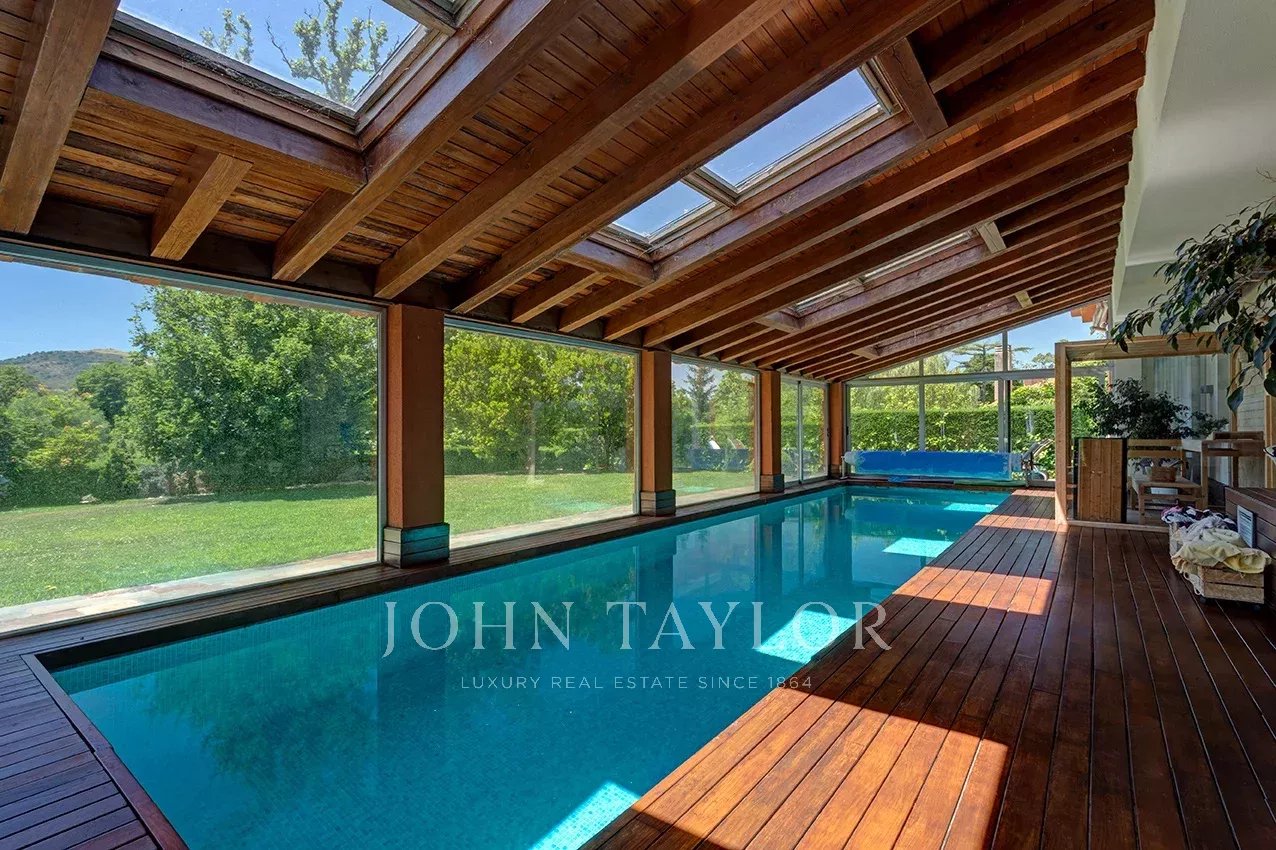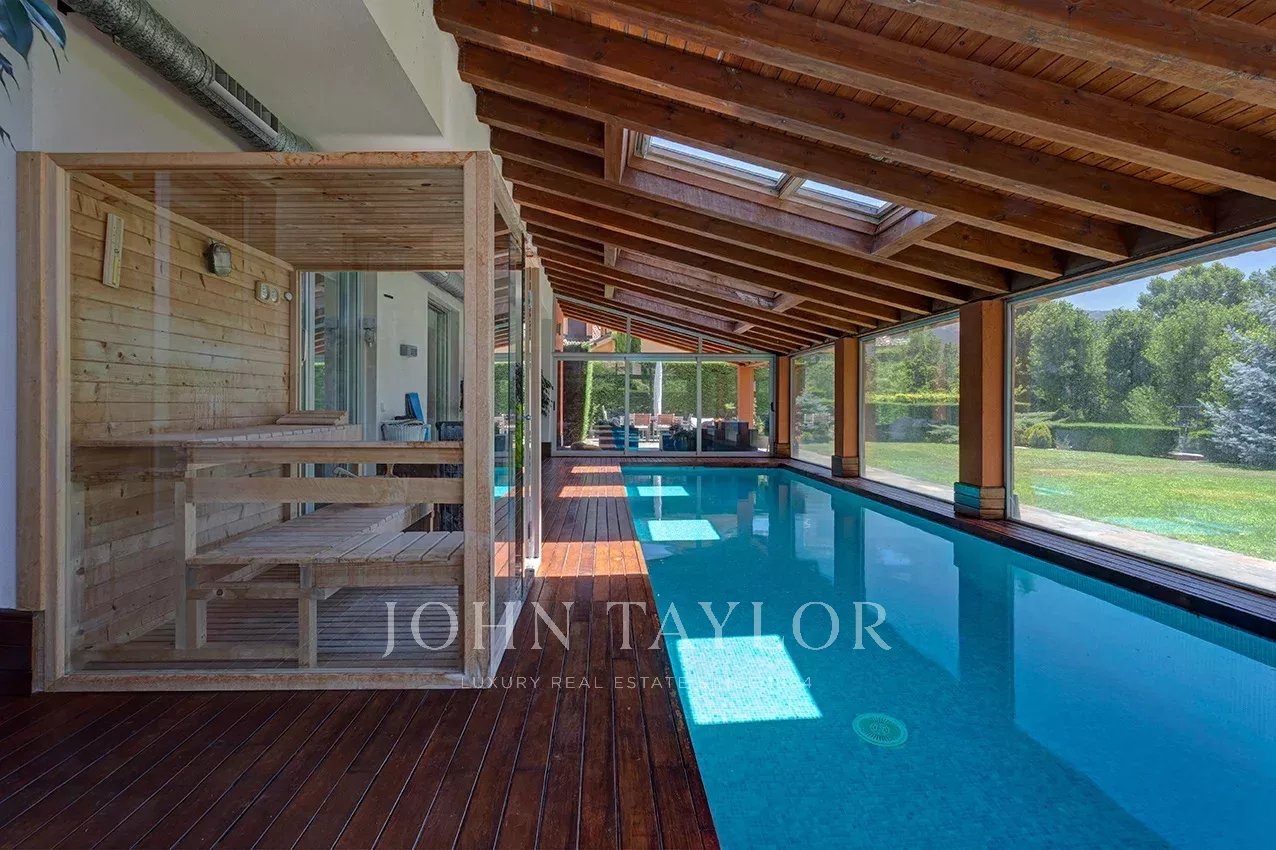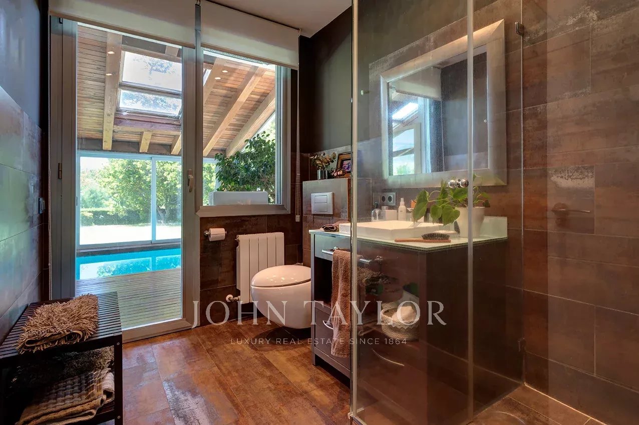 Distributed in three comfortable floors, the main floor consists of a large and bright living room with fireplace and large windows with access to the garden and the magnificent covered and glazed swimming pool, heated, with dehumidification system, which, in summer can be semi exterior to be able to open all the glazed enclosure.