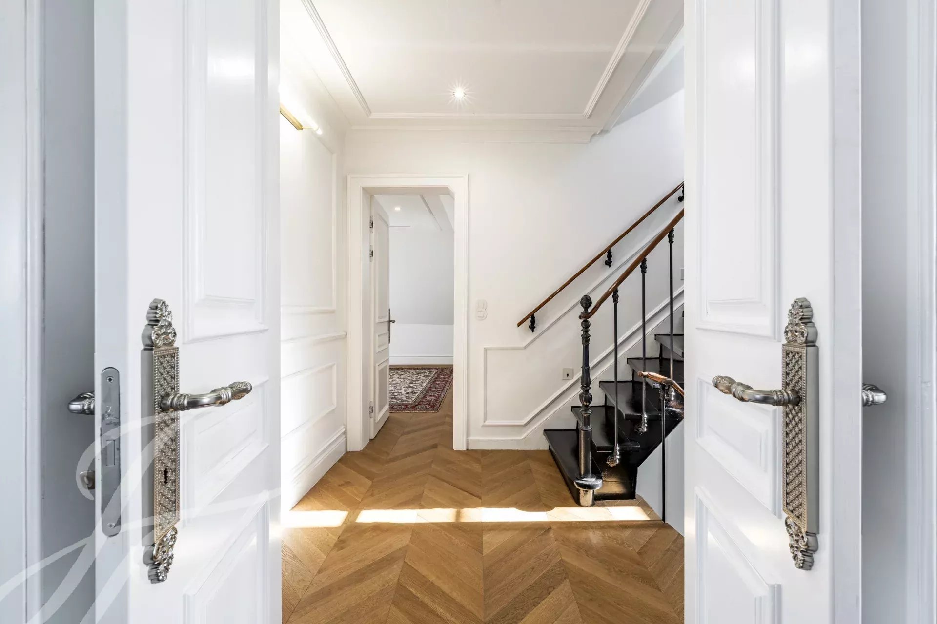 Spread over four floors, the ground floor features a spacious living room that opens to a beautifully landscaped garden, seamlessly connecting indoor and outdoor spaces. A formal dining room and a fully equipped kitchen are perfect for both casual and formal entertaining.