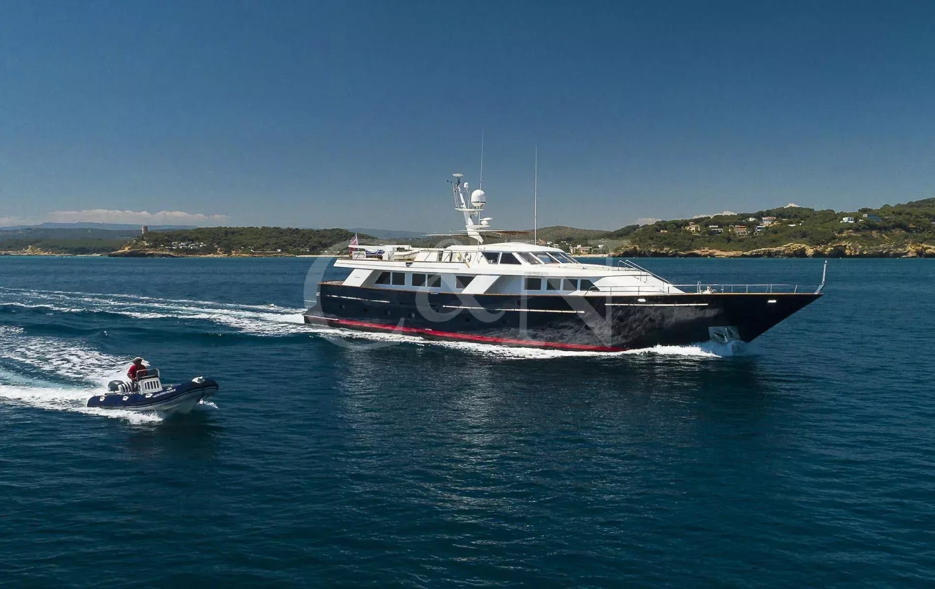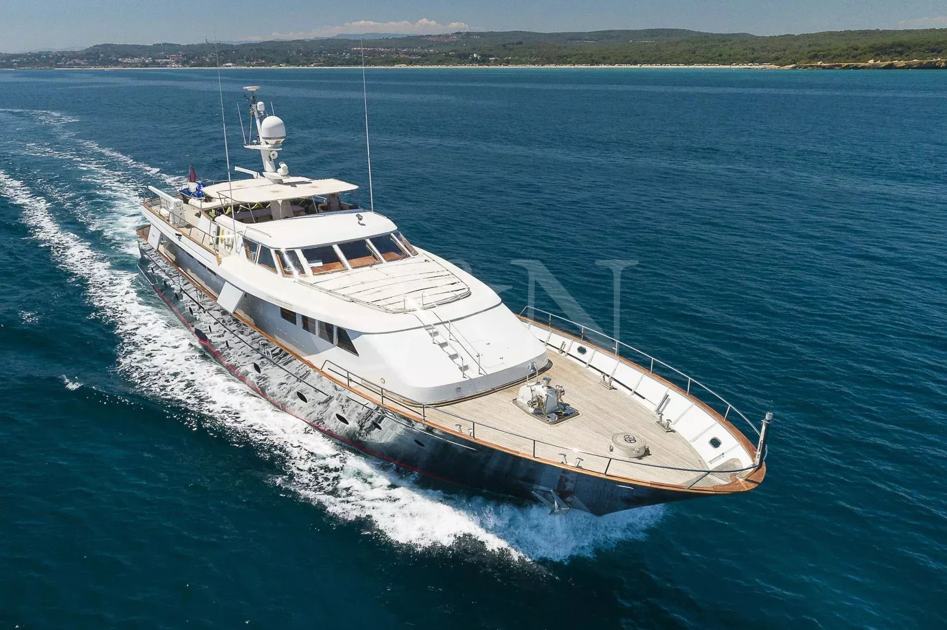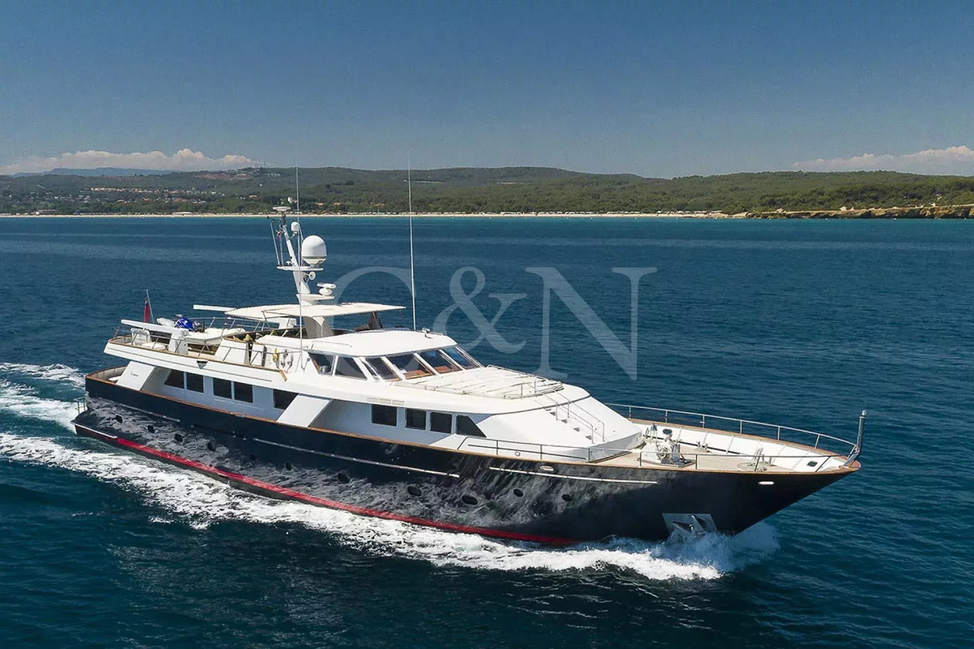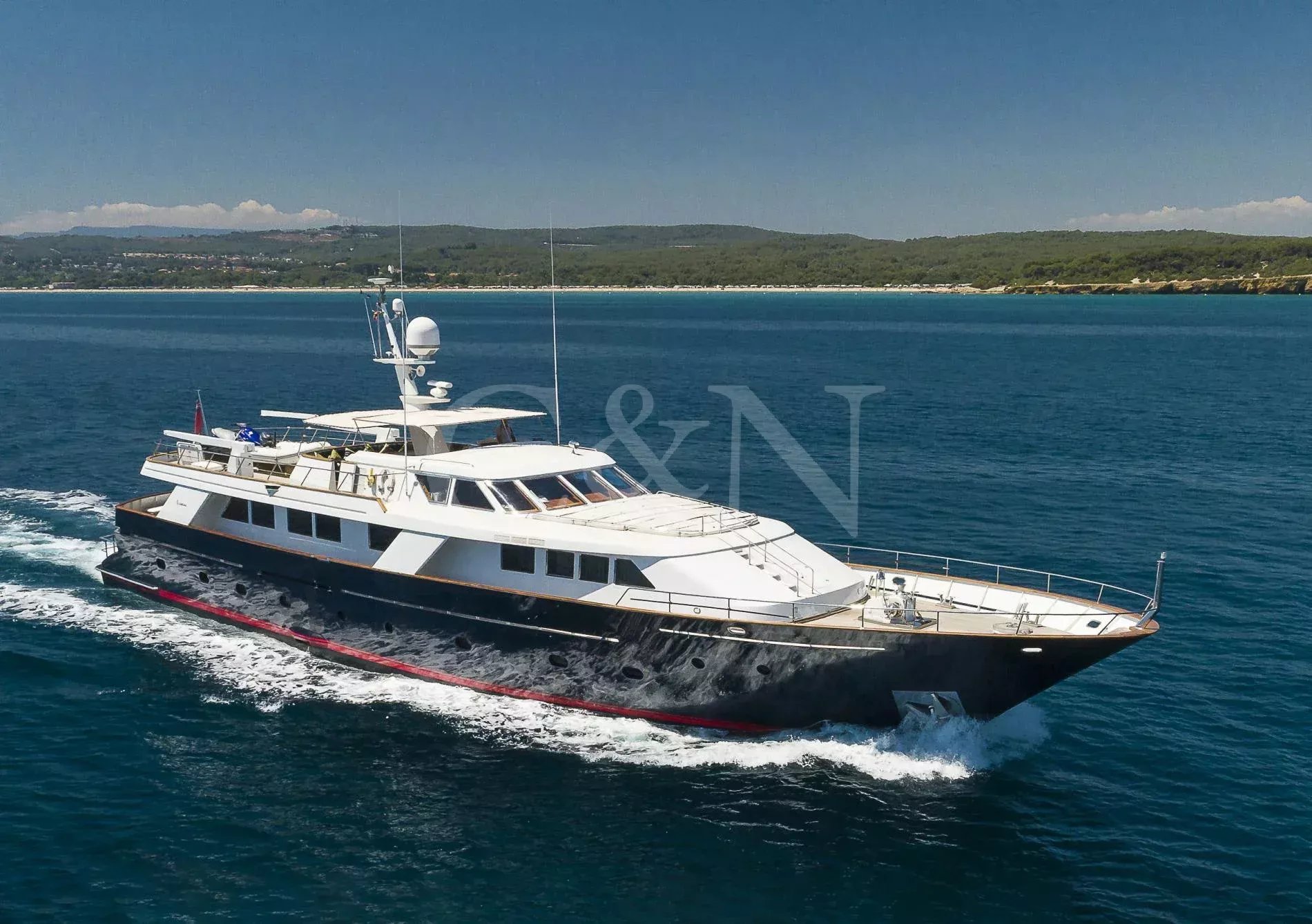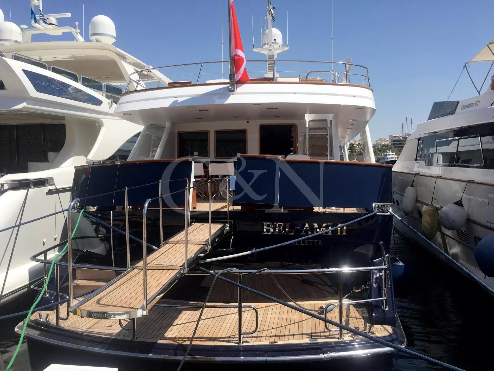 Bel-Ami II, a 34m Codecasa, is a modern classic. Bel-Ami II was originally launched in 1988. She has undergone a major refit with a complete systems upgrade and refurbishment in 2008, then later a more extensive refit in 2019.During Bel-Ami II’s most recent work period, the hull was cleaned, antifouled and checked for weakness with ultrasound. A full inspection of the yacht’s systems was carried out, with generator and fuel pump parts repaired and replaced as necessary. Completed with freshly varnished woodwork, a new nameplate and a polished hull, she is now in turnkey condition for a new owner to enjoy.Bel-Ami II’s understated style, seaworthiness and simple-yet-sophisticated interior with a semi-raised bridge and classical comforts, make her a real gentlemen’s yacht. Her interior décor features the original panelling, complemented by soft fabrics and a spacious and inviting layout. Bel-Ami II can accommodate ten guests in total with the master or VIP suite located on the main deck. There is separate accommodation for a complement of six crew.On-deck facilities include a diving and bathing platform that is also large enough for a couple of sun loungers. There is a large dining table on the main deck aft and a smaller breakfast table nestled against the shelter of the saloon bulwark. Bel-Ami II also has an exterior bar with comfortable sitting and dining area on the bimini-covered flybridge.Bel-Ami II carries her tender on the top deck, positioned aft, and is deployed and recovered by crane.