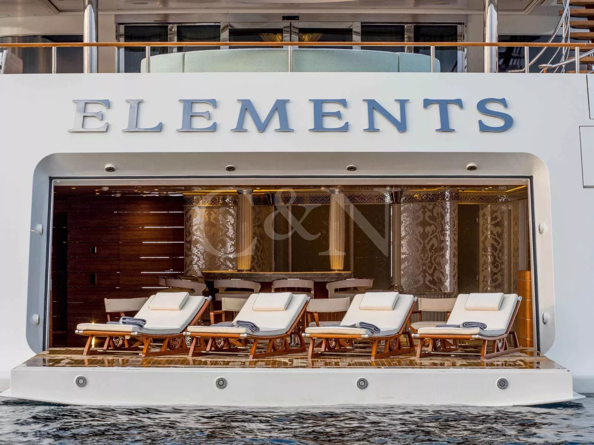 Elements has been custom-built to Lloyd’s classification, with unrestricted SOLAS navigation, and is also compliant with commercial operation. The yacht has two pairs of stabilisers for comfort. She is able to take a helicopter and has a 7,000nm range at a cruising speed of 13.5 knots.