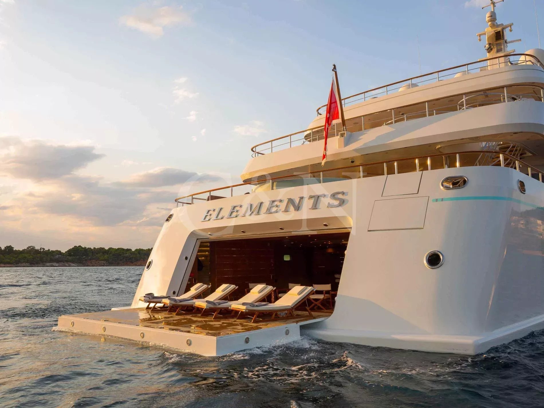 Boarding Elements via the transom or large side platform, guests are welcomed into a 140 square metre beach club with chaise-lounges and a white and gold mosaic-finish bar. Also located on this deck is the wellness centre with a gym, hammam spa with traditional goebetkas and a massage room.