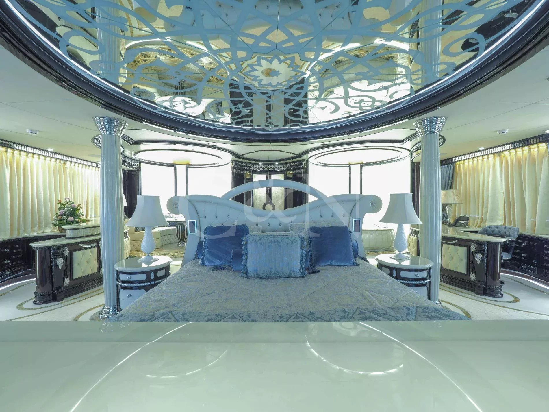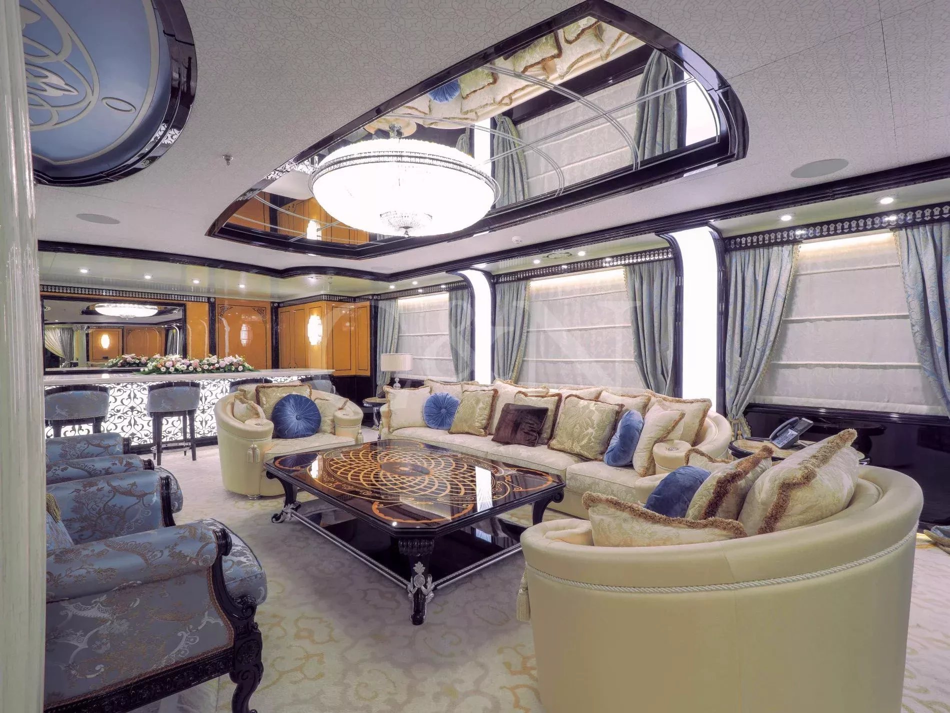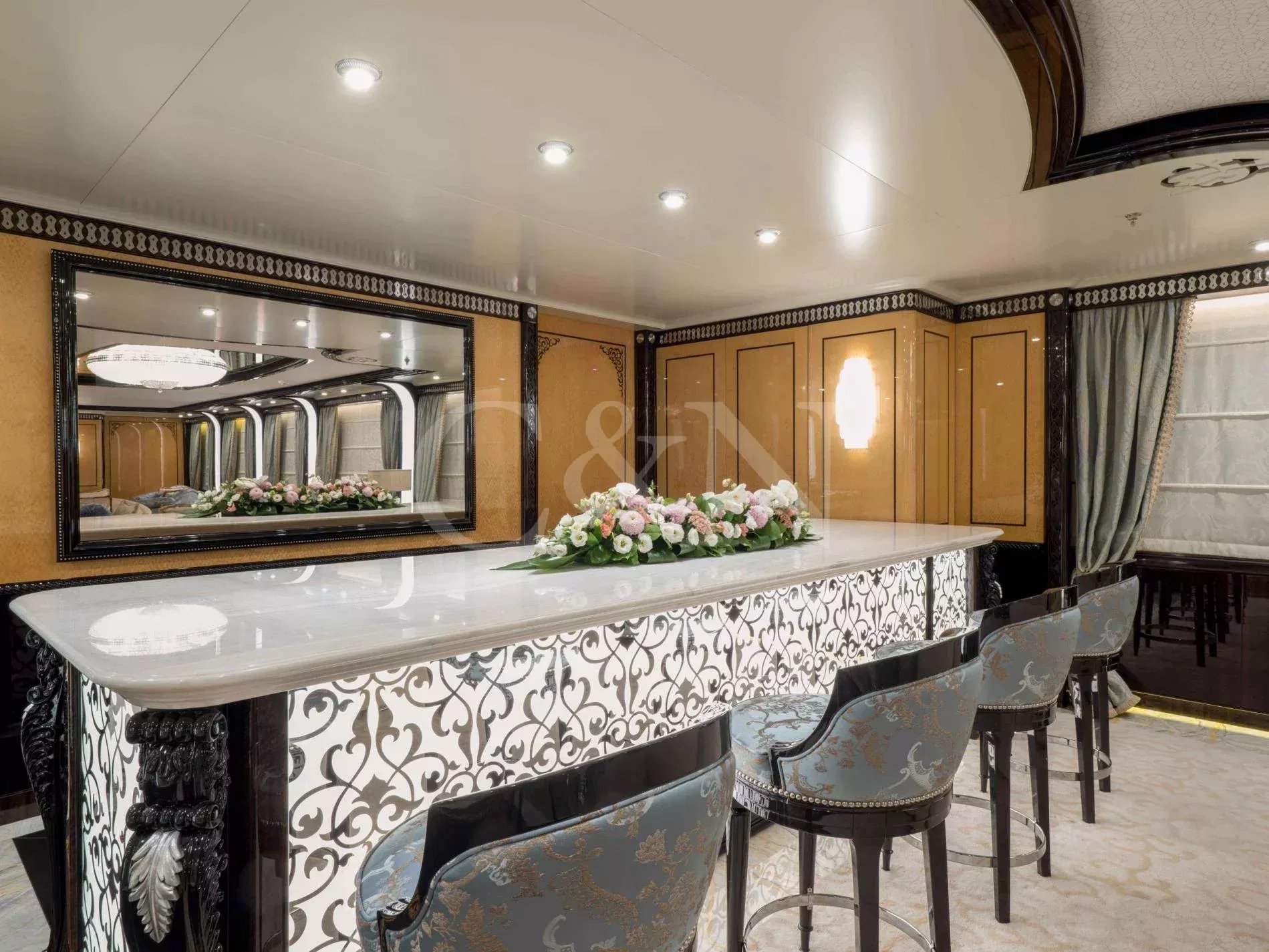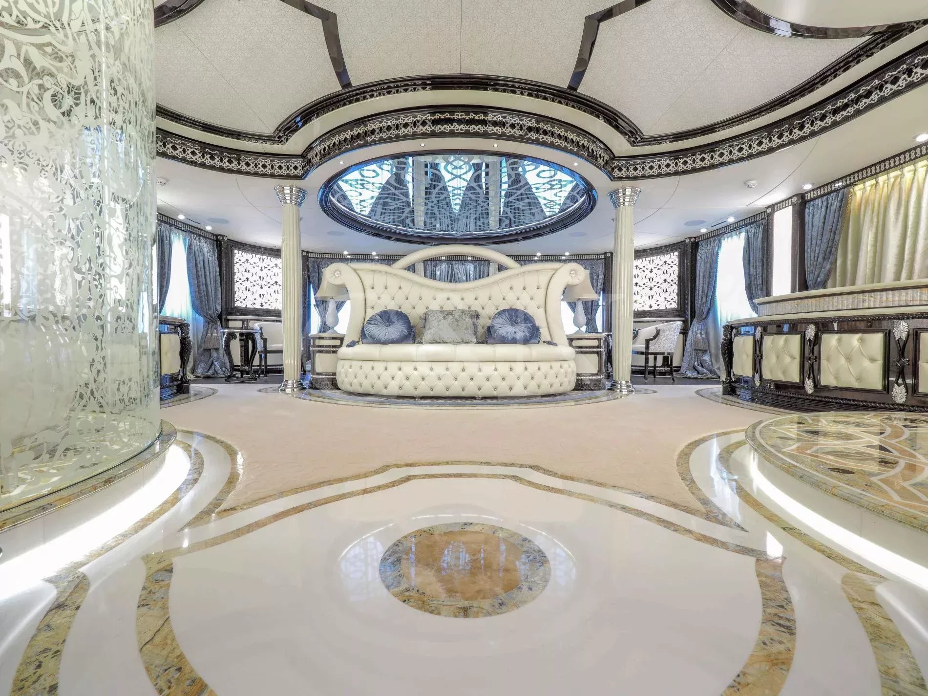 Unique design features are found on every deck, including elegant Grecian-style pillars in the main saloon and the master suite, etched-mirrored glass detailing and chandeliers in fine-cut crystal.
