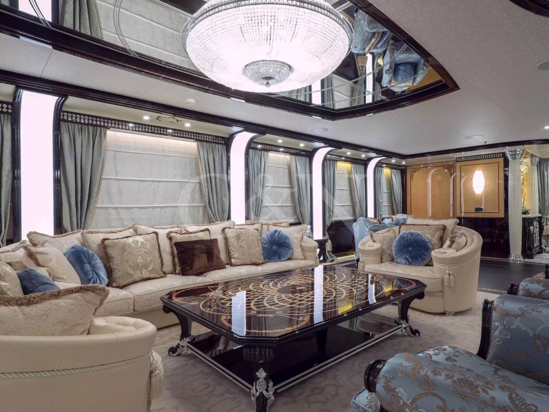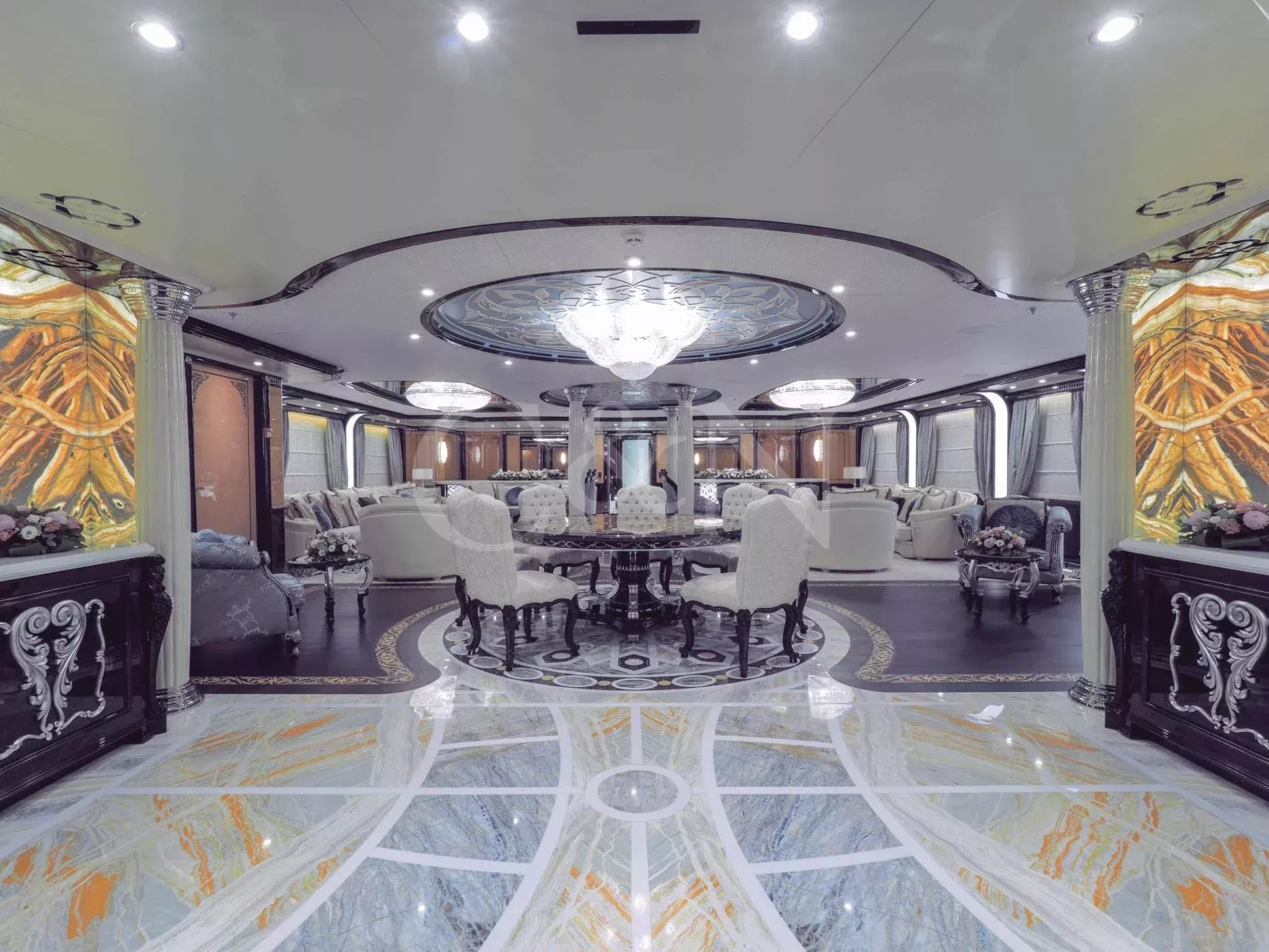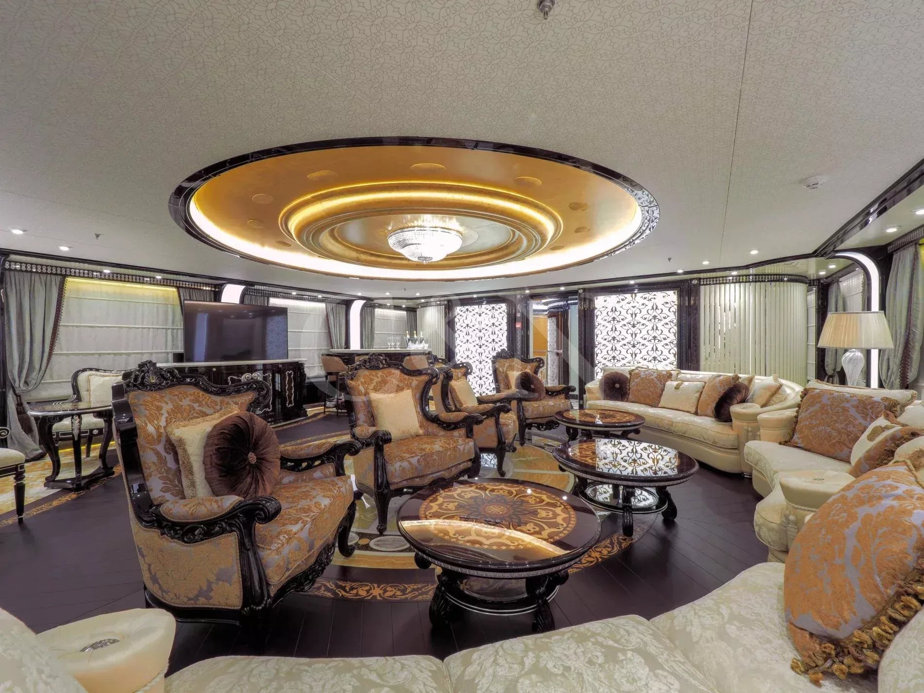 Unique design features are found on every deck, including elegant Grecian-style pillars in the main saloon and the master suite, etched-mirrored glass detailing and chandeliers in fine-cut crystal.