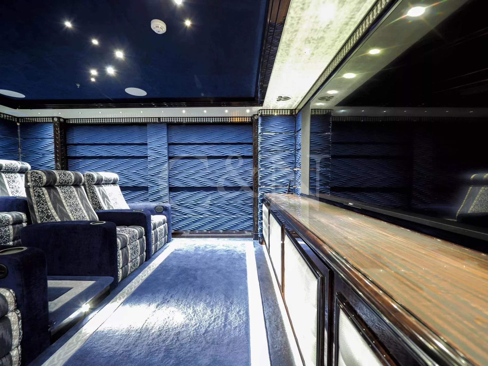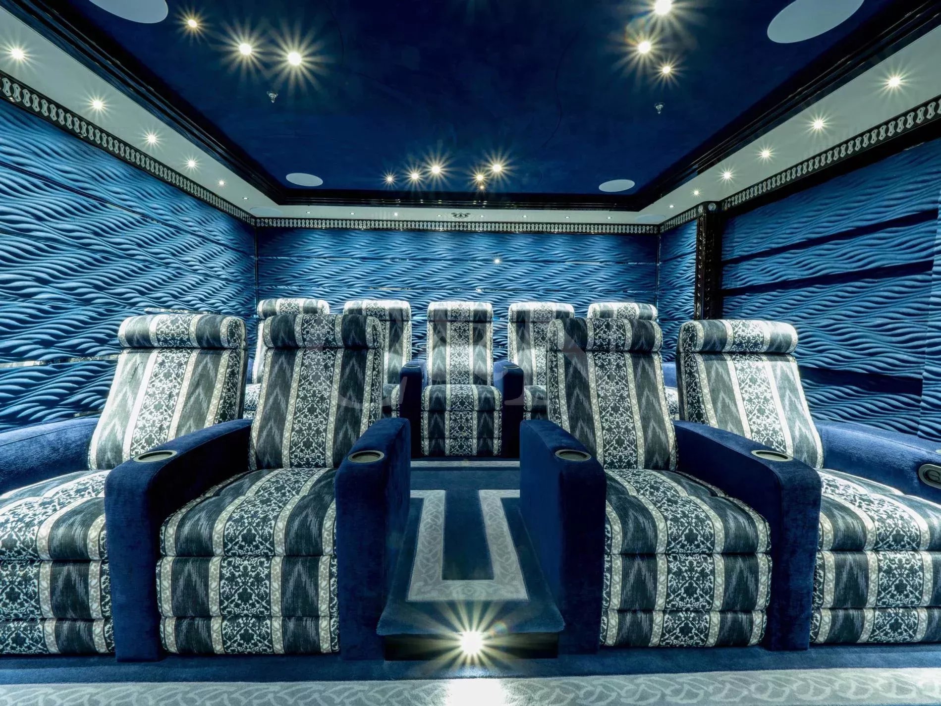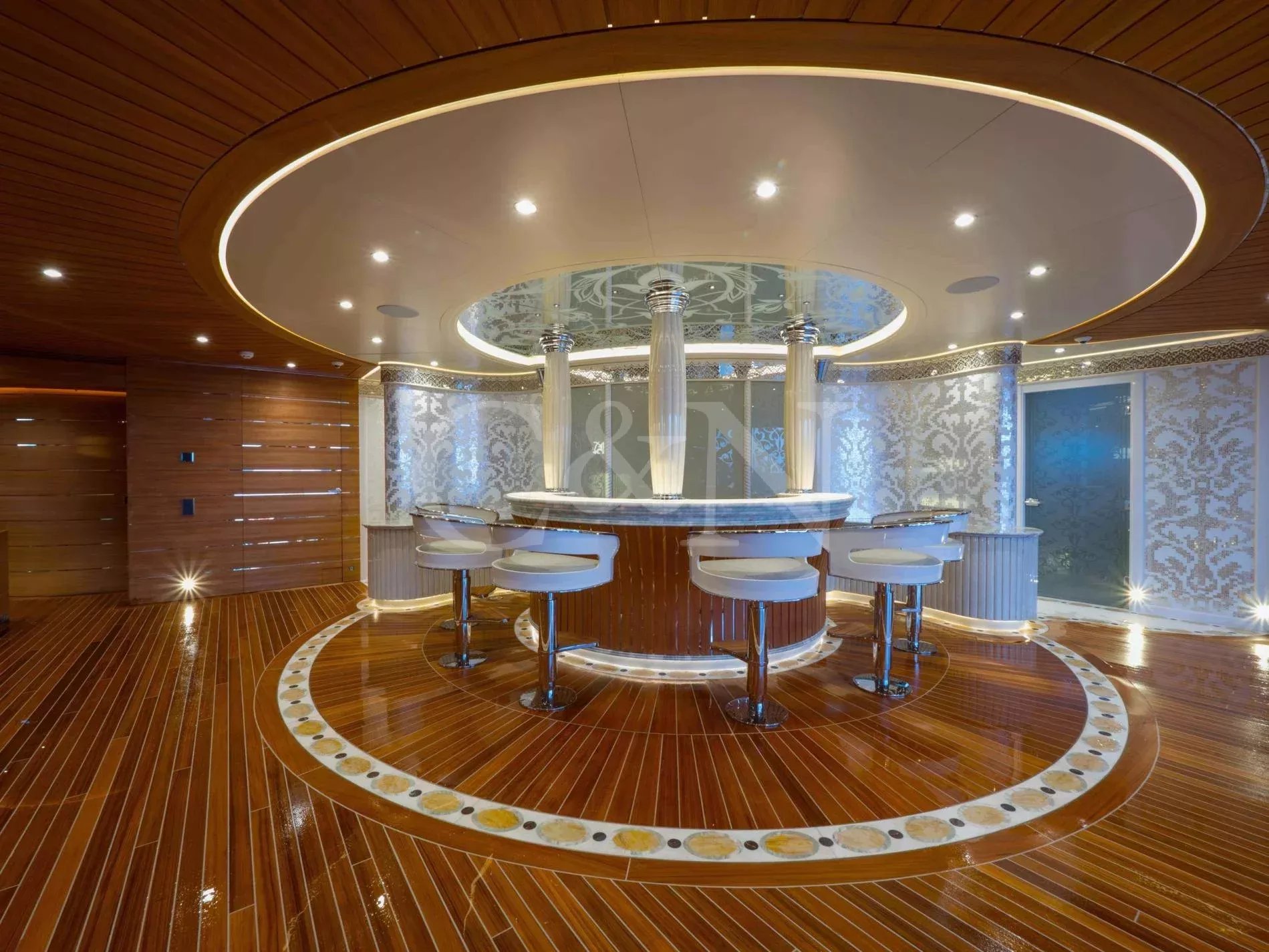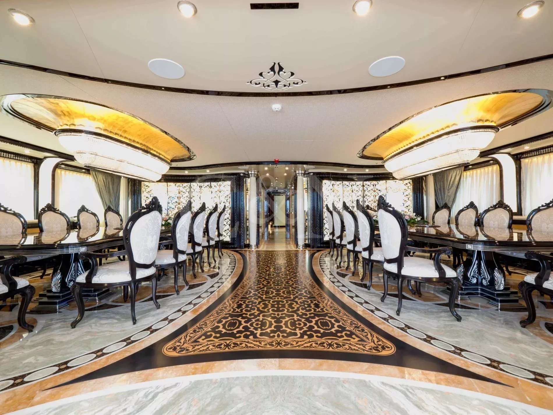 Unique design features are found on every deck, including elegant Grecian-style pillars in the main saloon and the master suite, etched-mirrored glass detailing and chandeliers in fine-cut crystal.