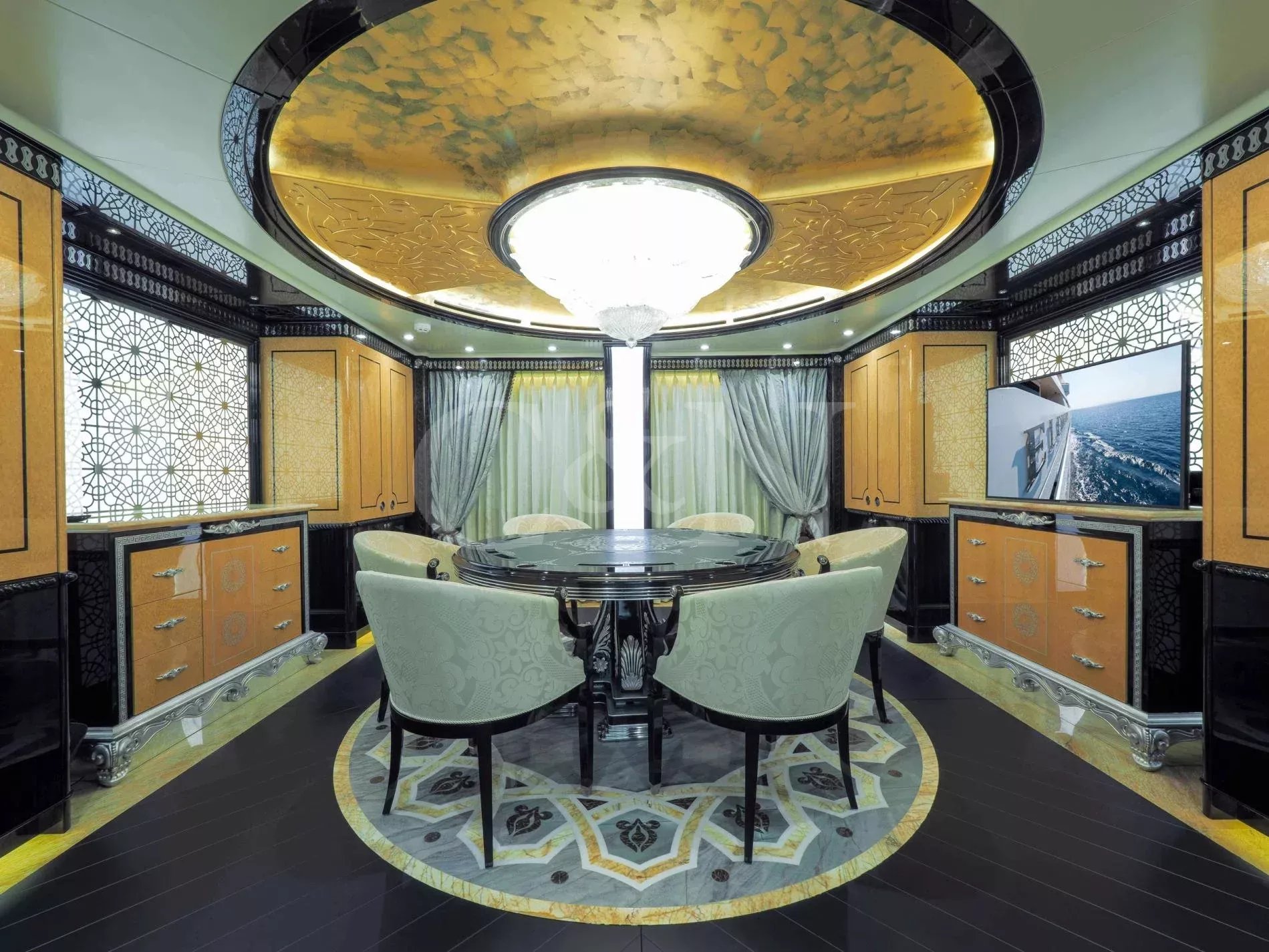 On the main deck, the saloon is the heart of the yacht and is the natural place for guests to gather. Entering from the aft deck, one is immediately struck by the backlit onyx wall panels and the intricate marble flooring. Rather than one single lounging area, the saloon offers a variety of sitting areas conducive to smaller groups pursuing different activities at once.