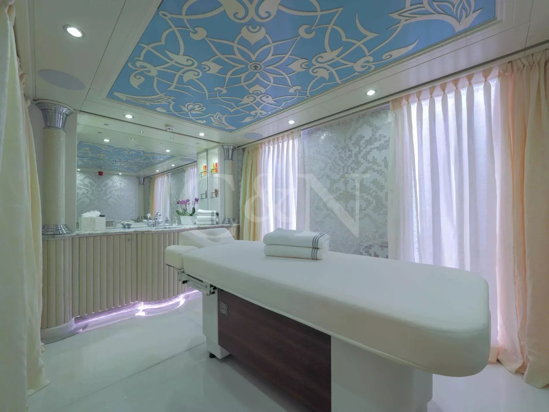 Moving forward through the main lobby, there is a glass lift and one enters the main guest area which houses nine of Elements’ 12 suites. One level above, the owner's deck is laid out as a private apartment with two large VIP suites each with luxury bathrooms, an office and a cinema room, as well as an astonishingly luxurious owner's stateroom. The owner’s suite opens to a panoramic foredeck with a Jacuzzi pool and the helipad is on the bow, where a private helicopter can land in utmost privacy.