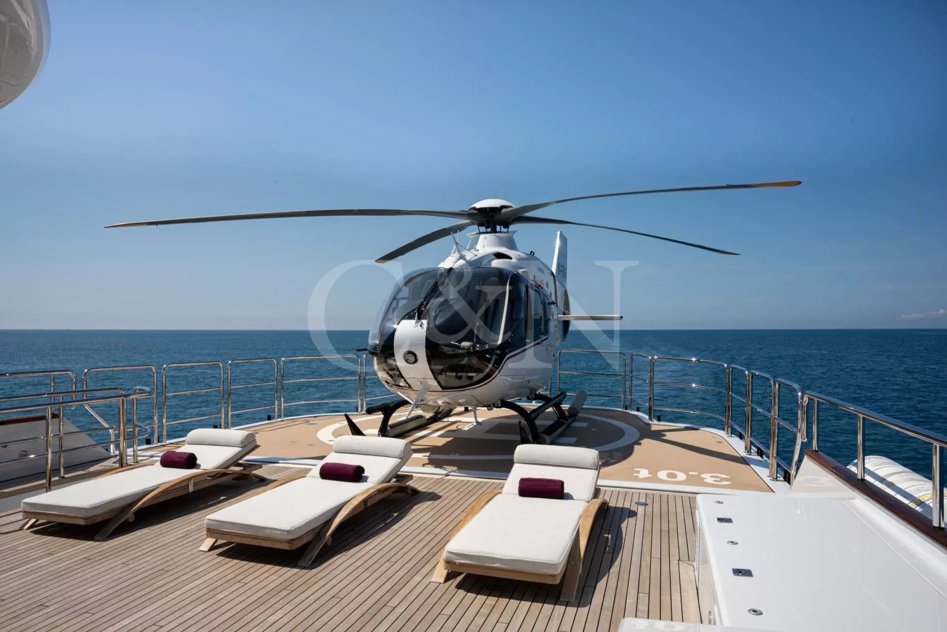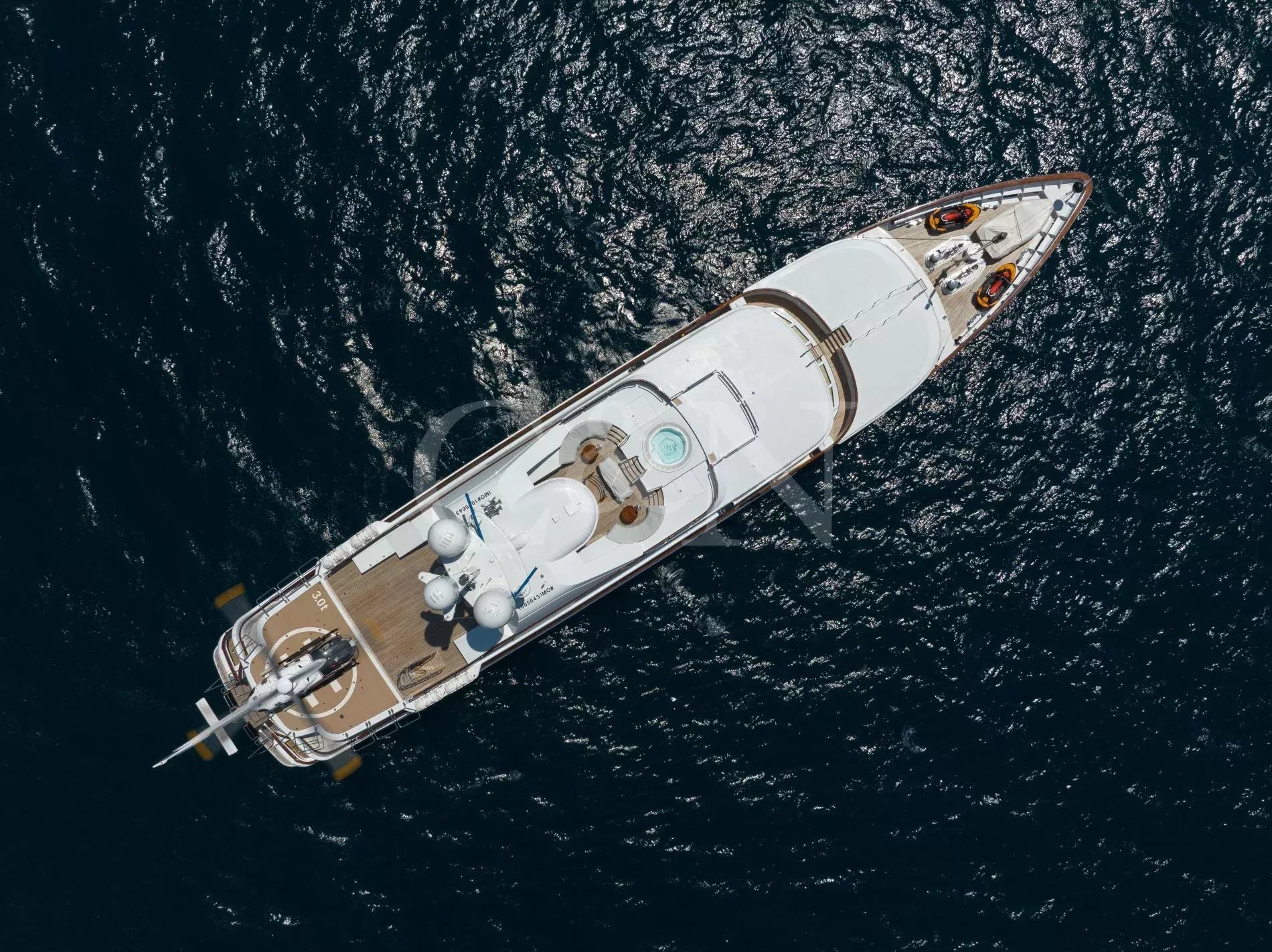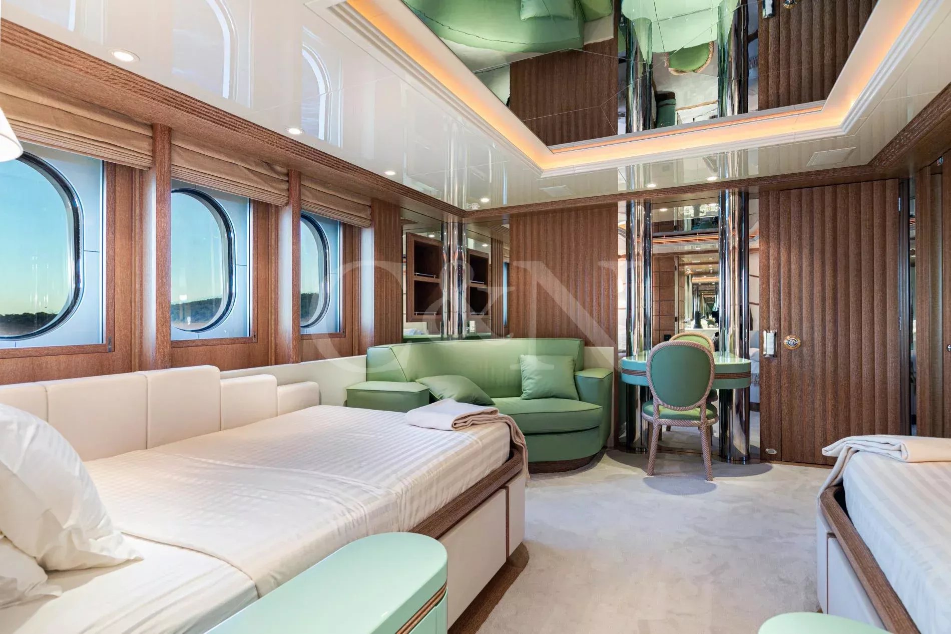 Her ingenious and unique design - the work of the world renowned Terence Disdale - is the result of his many years of experience and clear understanding of what the owner required. With accommodation for 14 guests in six en suite cabins, catered for by up to 14 crew, she has all the amenities that one would find on a much larger yacht, including a touch-and-go helipad, two large custom tenders of 9m and 6m respectively, a full-width owner’s stateroom with an en suite observation lounge and office with daybed, offering panoramic views forward. Four most generous guest cabins aft and a smaller fifth twin cabin forward, ideal for children or staff and could also be used as a gym.