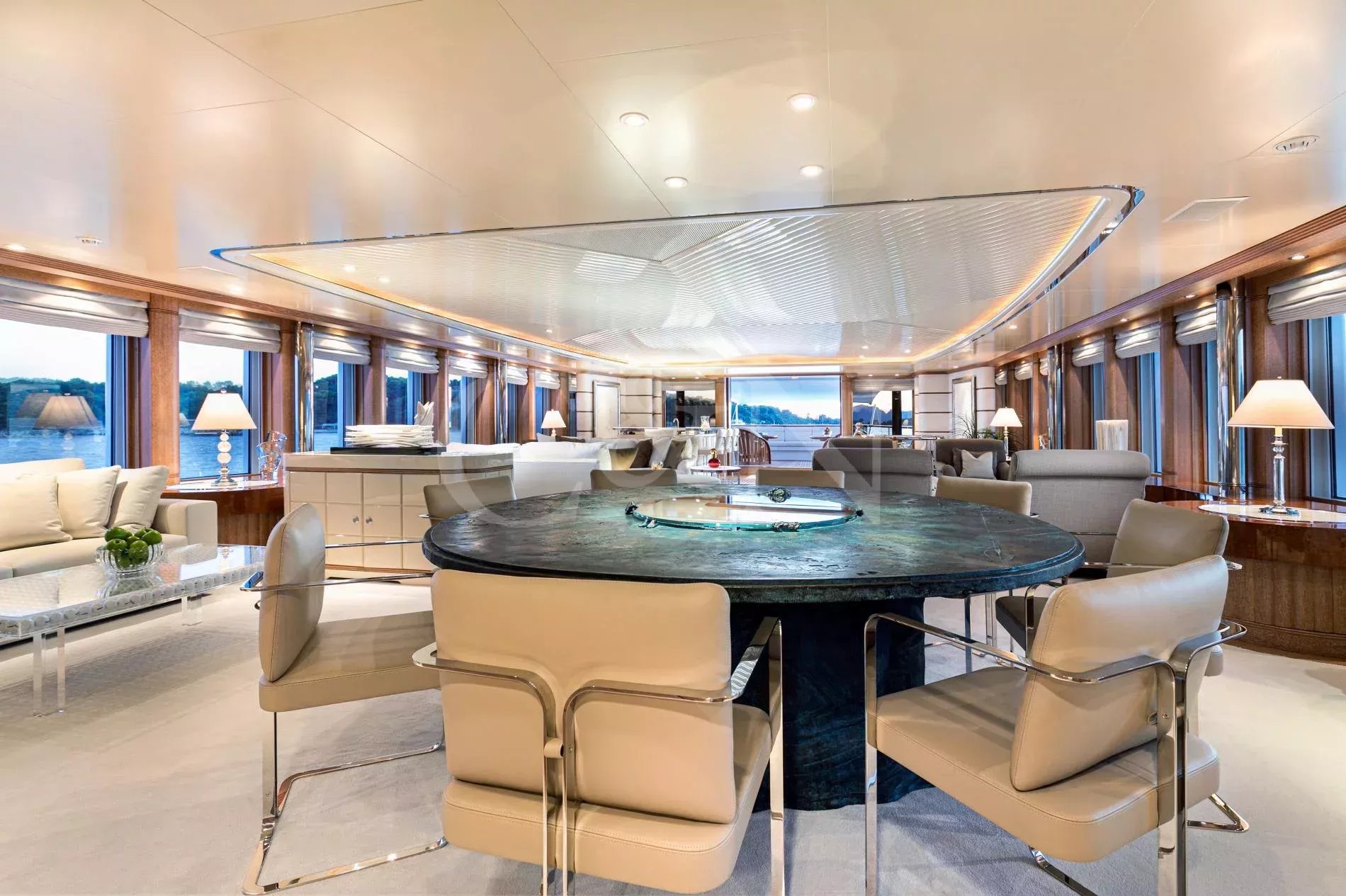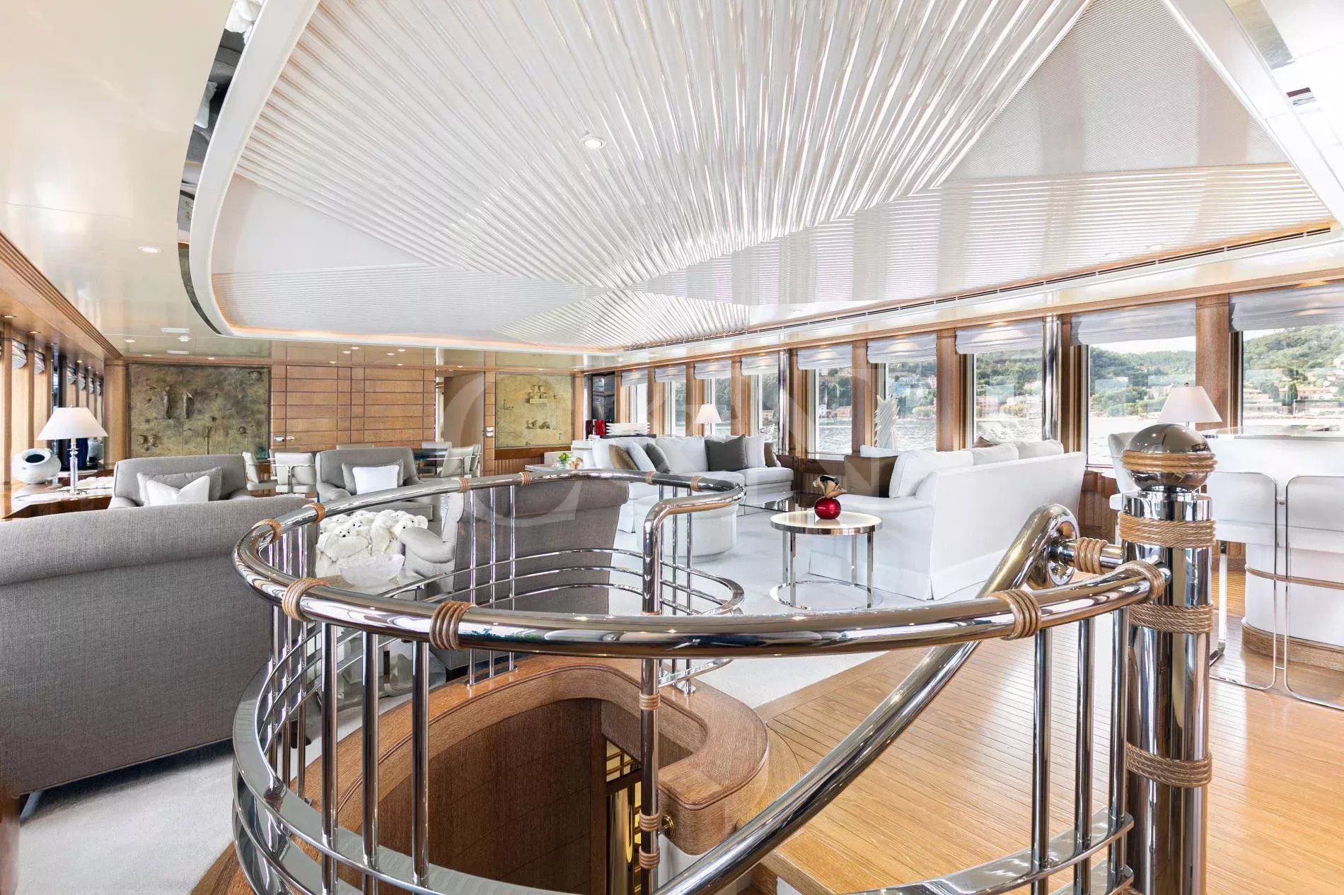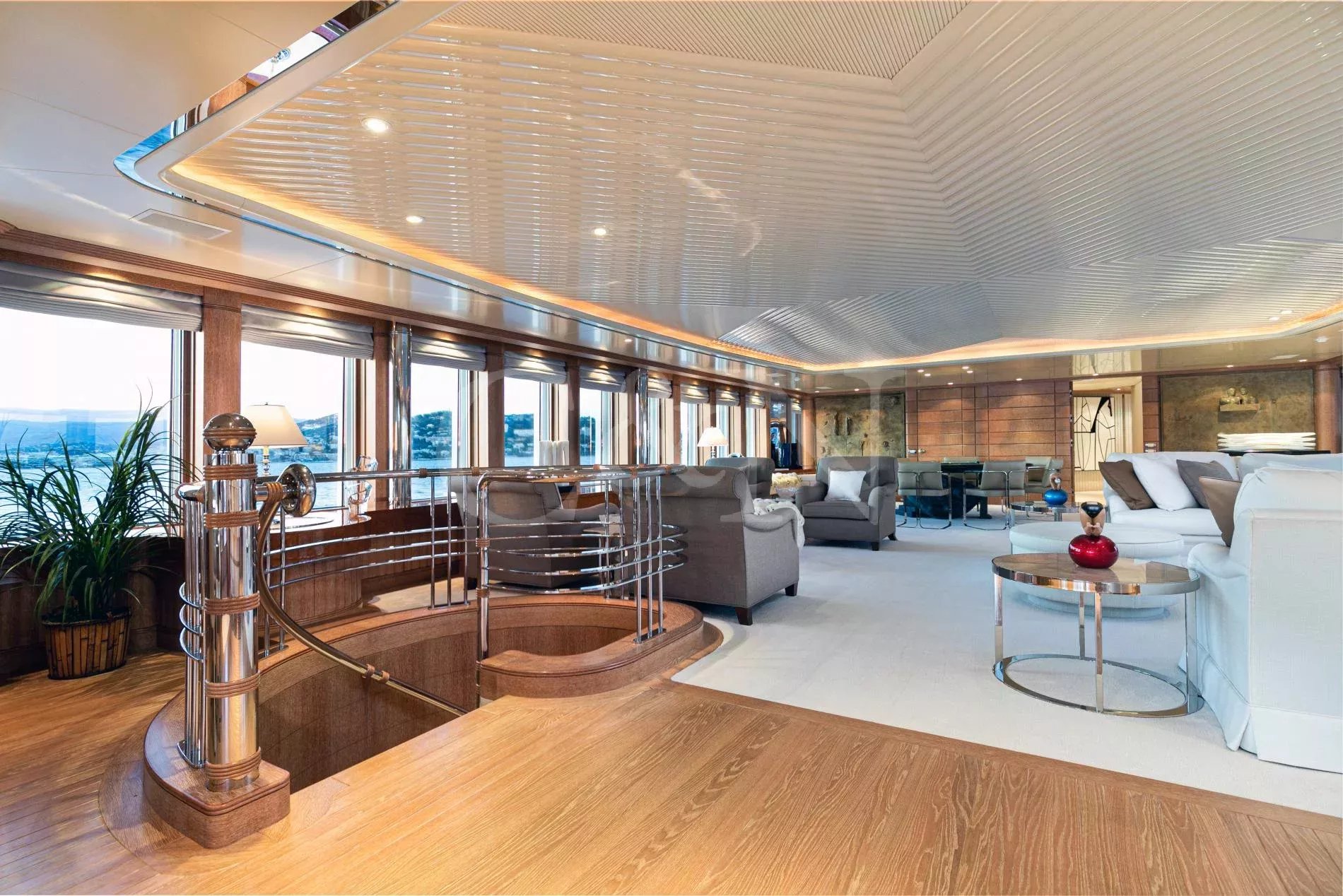The sundeck offers ample lounging, sauna, Jacuzzi, bar, dayhead and shower. She also boasts the largest main deck saloon on a yacht of her size, which is full width and offers spectacular views through the oversized windows extending over the entire length.
