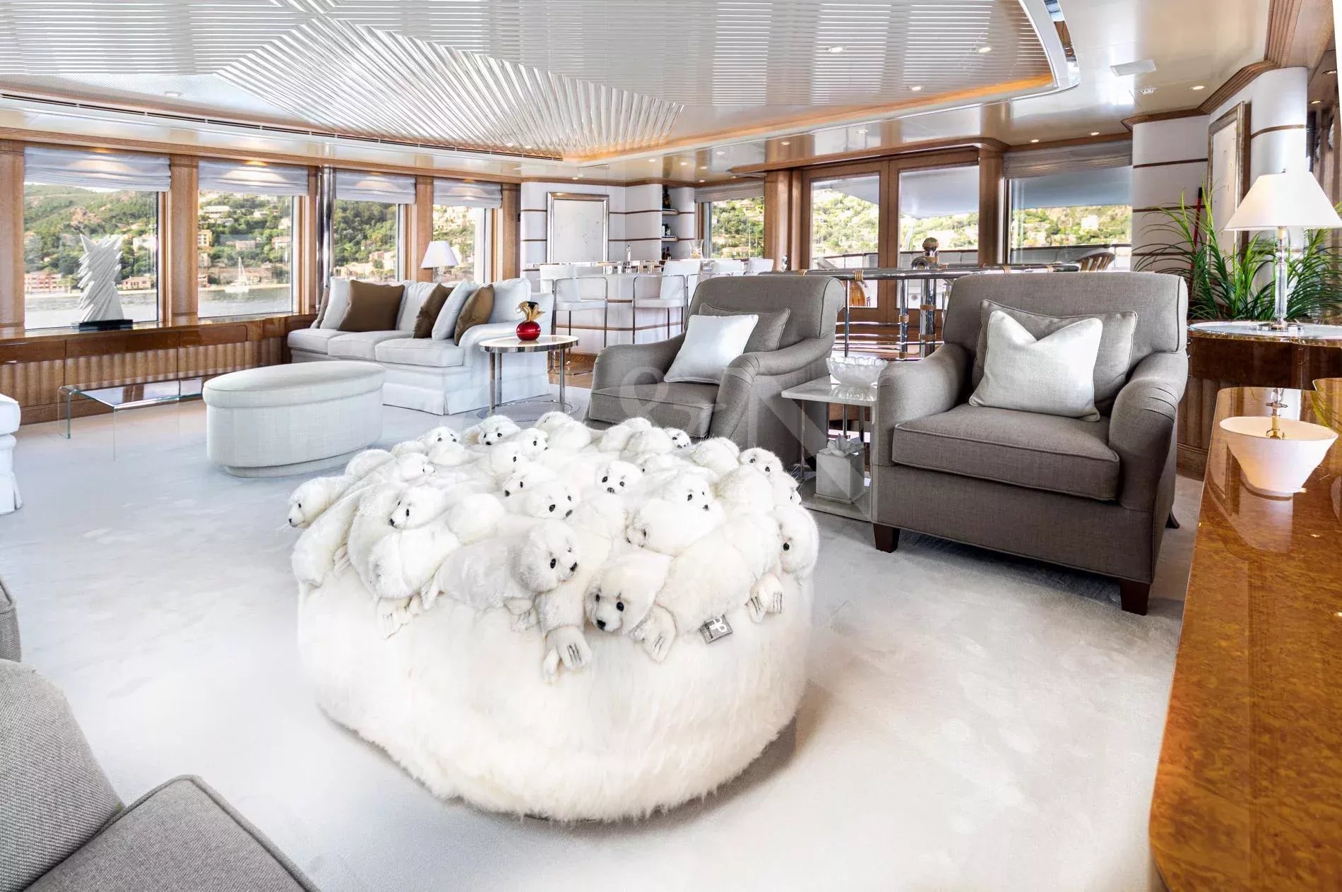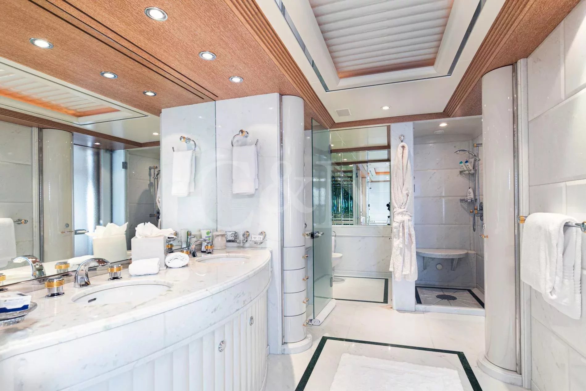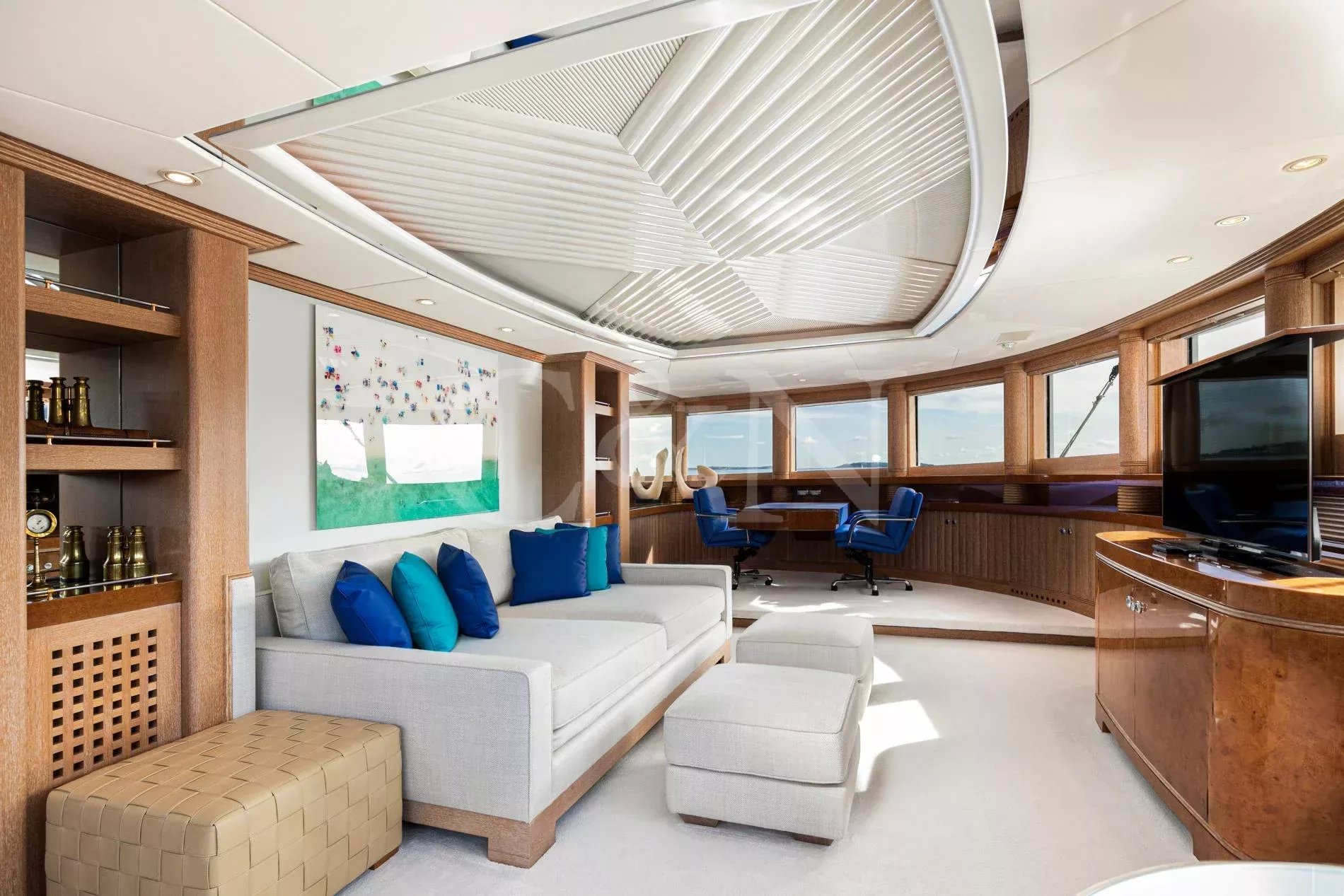 The sundeck offers ample lounging, sauna, Jacuzzi, bar, dayhead and shower. She also boasts the largest main deck saloon on a yacht of her size, which is full width and offers spectacular views through the oversized windows extending over the entire length.