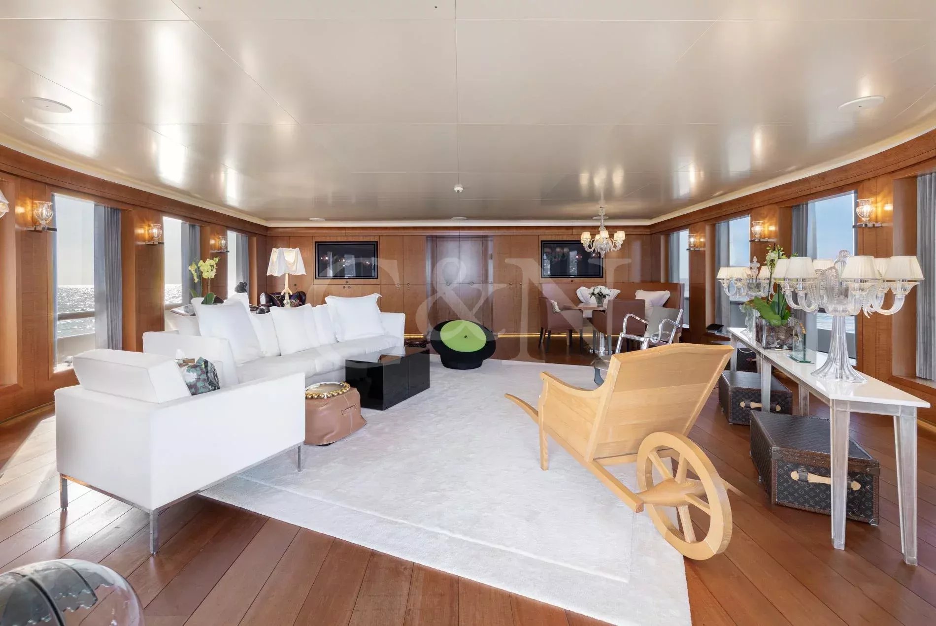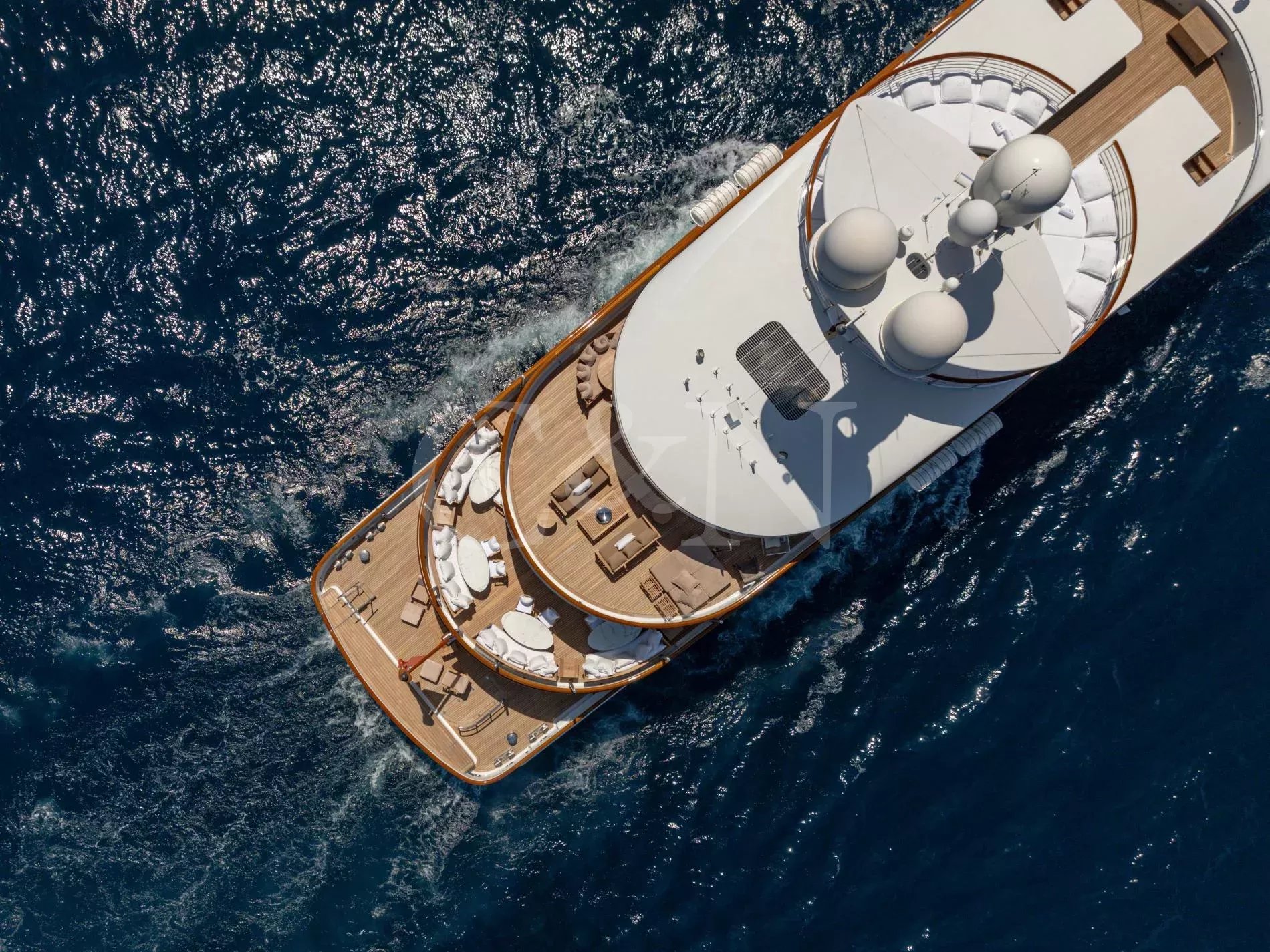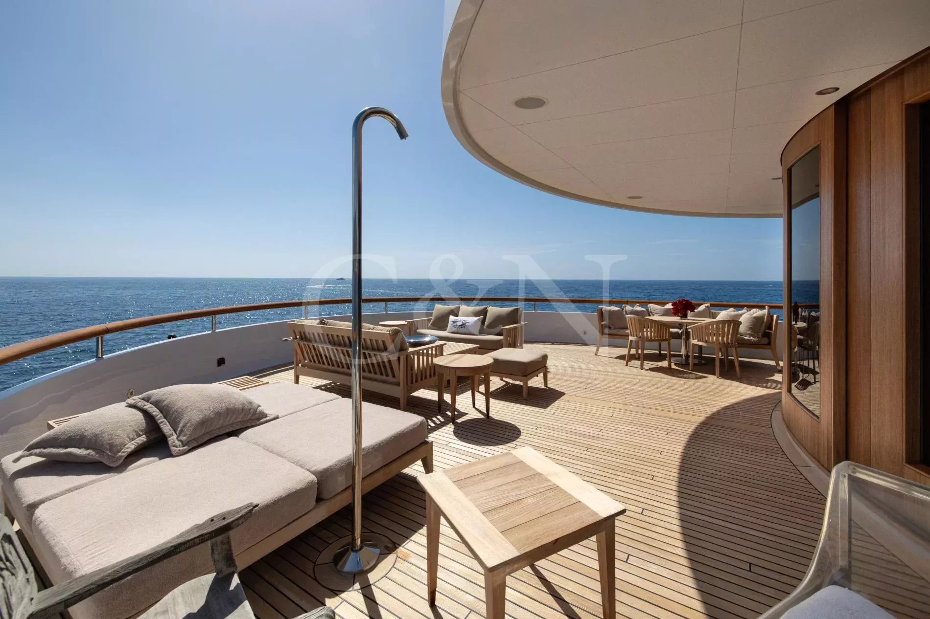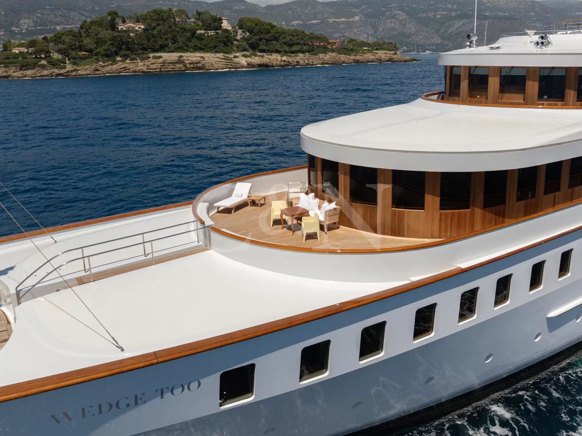 At 65m Wedge Too was a fully custom project designed by the renowned French designer Philippe Starck. She was built at the original DeVries Feadship facility in Alsmeer, Holland to the highest standards and to ABS class. Wedge Too has never chartered and has been kept purely private with little use, totalling a mere 4500 hrs on her main engines.She offers accommodation for up to 18 guests in 9 cabins and 21 crew.The Owner's deck situated above the main deck, offers a full Owner’s suite forward with two double bed cabins, three bathrooms, extensive walk-in wardrobes, a pantry, guest powder room and an elevator to all decks. A fully private forward veranda with direct access from the Owner's main cabin and an Owner's saloon aft leading to the spacious Owner's aft deck.The Wheelhouse deck above has a spacious wheelhouse with office, a large ensuite captain’s cabin, a guest pantry, a guest powder room, and a spacious guest saloon with open aft deck and full walk arounds decks.The sun deck is totally private, offering an oval pool surrounded by sunbathing pads for 20 people in comfort and a 360° view.The main deck forward boast’s three ensuite VIP cabins, one of which is full width. All are totally private with large windows in the ship’s side. The main dining room, with seating in comfort for 16 guests at the large centrally located square table, with adjacent tables for 2 for a further 20 people, is full width featuring an adjacent pantry, main galley and two guest powder rooms. Fully aft on this deck is the main guest saloon which offers spectacular views through full height windows throughout. The main deck aft is spacious and offers direct access to the covered aft peak and swimming platform.The lower deck offers another 4 ensuite guest cabins, aft peak with guest powder room and direct access to the swimming platform as well as a large tender garage.Forward of the mid-ships engine room are the crew cabins, spacious crew mess and small crew galley.The main ship's laundry, cool room and freezer room are all below forward on the Tank Deck.