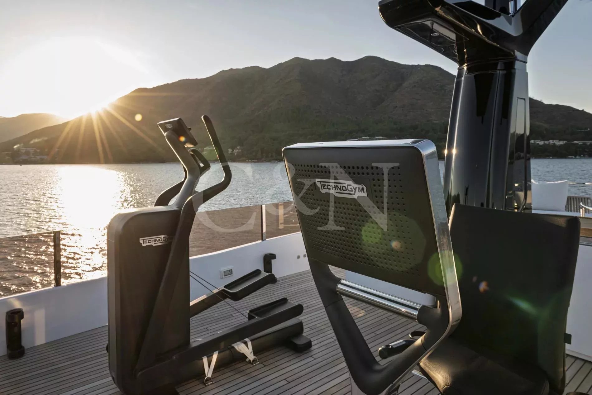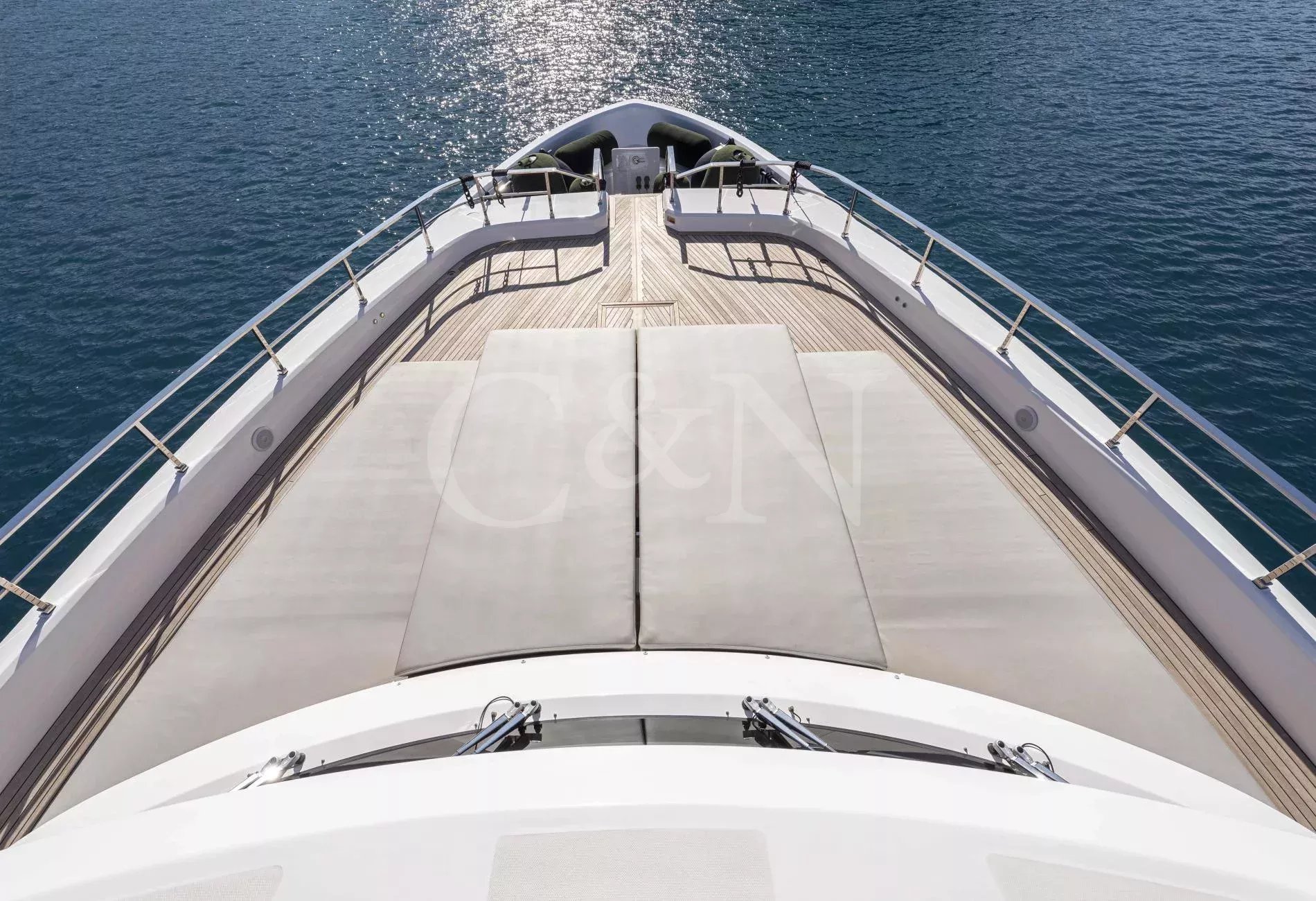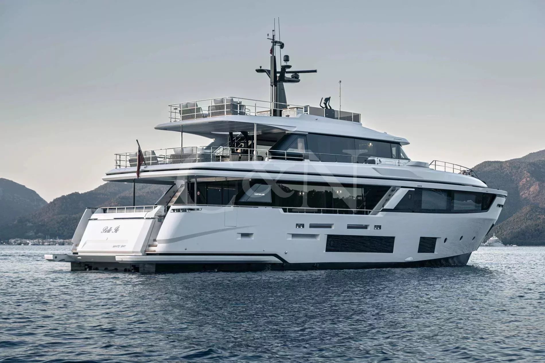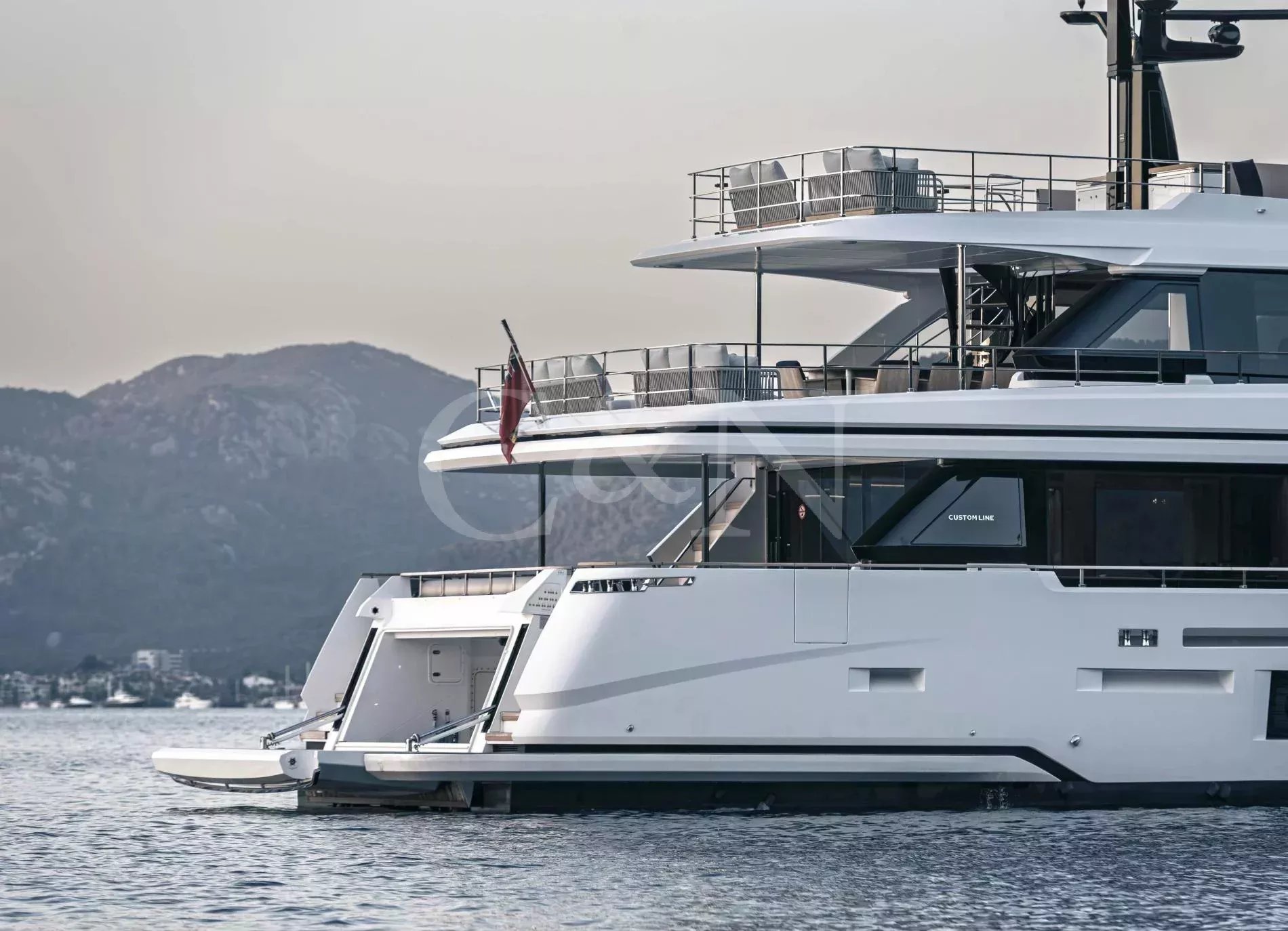 Belle Ile is a 28.43-metre semi-custom motor yacht, and the twelfth hull of the Custom Line Navetta 30 series. Belle Ile is offered for sale in pristine condition. She is one of the most attractive yachts in her series, equipped with all of the top options and boasting a very impressive interior volume for a 90-foot yacht.This tri-deck was built for an experienced Owner, with many typical large-yacht features such as a full study, an on-deck Jacuzzi, brand new techno gym equipment on the sundeck, and an advanced entertainment system.Belle Ile is decorated with a modern and stylish interior, featuring a calming, neutral colour palette, wooden accents and pops of blue.The spacious main deck features a capacious main salon with spacious sofa seating and a formal interior dining setup. Her Owner’s suite is situated forward on the main deck. On the upper deck, the beautiful upper salon offers guests elevated ocean views and a relaxing place to unwind and entertain.Belle Ile can currently accommodate eight guests across her Owner's cabin and three lower-deck guest cabins. She boasts a full-beam Owner’s suite on the main deck, complete with large windows and a his and hers bathroom. Belle Ile has a customised layout on the lower deck, currently configured as two double cabins, one twin cabin and a separate study room, all with their own en suite bathrooms. The study room could easily be converted back to the fifth guest cabin under her new Ownership.Belle Ile is a trideck motor yacht, boasting a main deck, upper deck and a sundeck. On the main deck, a comfortable sofa seating area situated aft provides the perfect space to enjoy a morning coffee or an afternoon drink in the shade. Her upper deck features a formal outdoor dining setup, ideal for al fresco dining with a view, as well as her forward on-deck Jacuzzi, perfectly situated for soaking up beautiful views.A standout feature of Belle Ile’s exterior is the brand-new techno gym equipment situated on her beautiful sundeck, as well as a barbeque and sofa seating with panoramic ocean views. Her exterior is well-covered, with a partially shaded main deck and upper deck a removable Bimini shade on her sundeck.Belle Ile features an aft tender garage to house her 460 Williams tender. She also boasts many advanced options such as a high-quality entertainment system, at-anchor stabilisers, and air conditioning throughout.Belle Ile is one of the most attractive 30-metre yachts available on the market, with an attractive price, great volume and in turnkey condition.