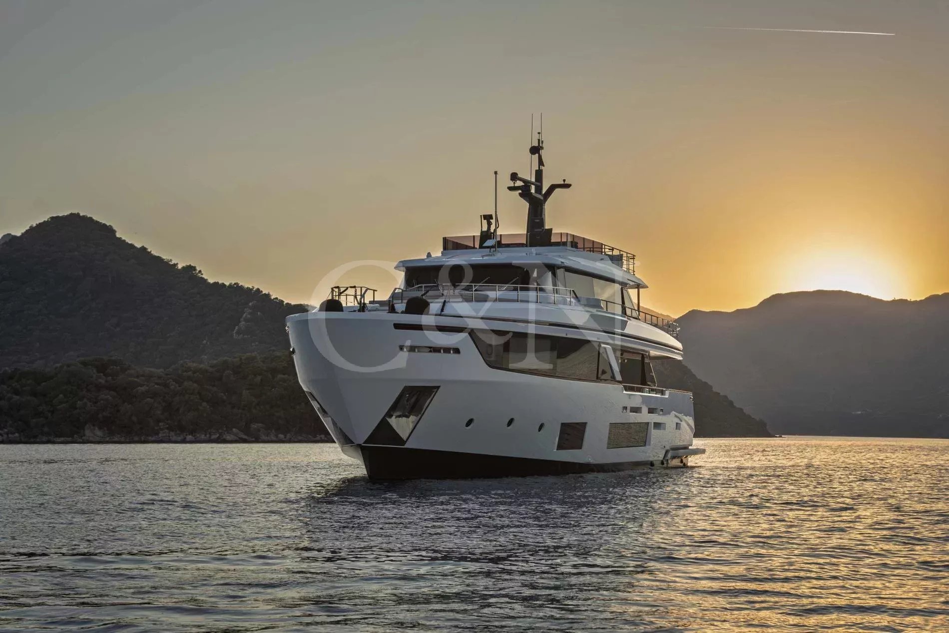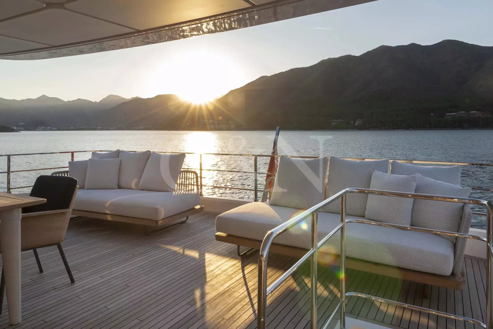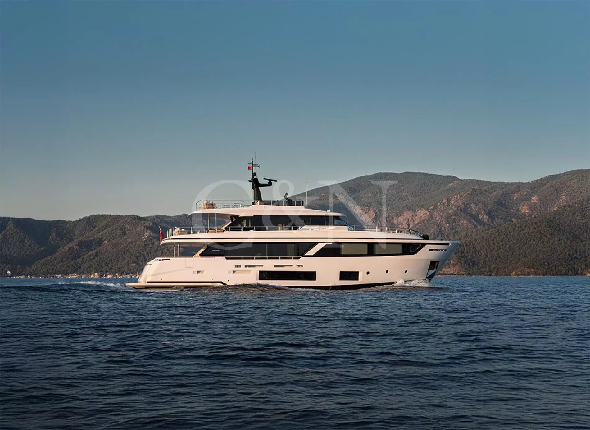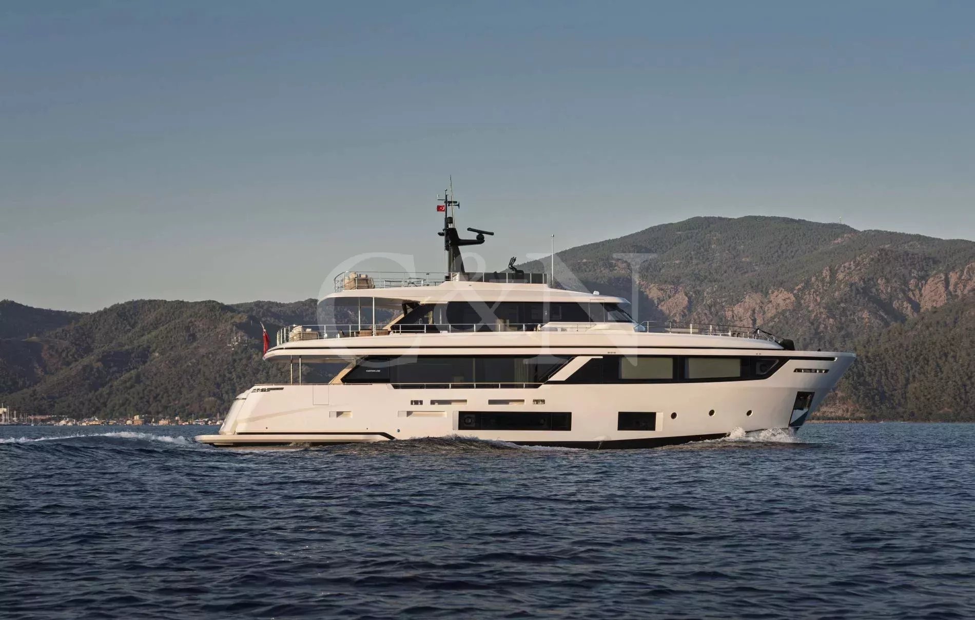 Belle Ile is a 28.43-metre semi-custom motor yacht, and the twelfth hull of the Custom Line Navetta 30 series. Belle Ile is offered for sale in pristine condition. She is one of the most attractive yachts in her series, equipped with all of the top options and boasting a very impressive interior volume for a 90-foot yacht.This tri-deck was built for an experienced Owner, with many typical large-yacht features such as a full study, an on-deck Jacuzzi, brand new techno gym equipment on the sundeck, and an advanced entertainment system.Belle Ile is decorated with a modern and stylish interior, featuring a calming, neutral colour palette, wooden accents and pops of blue.The spacious main deck features a capacious main salon with spacious sofa seating and a formal interior dining setup. Her Owner’s suite is situated forward on the main deck. On the upper deck, the beautiful upper salon offers guests elevated ocean views and a relaxing place to unwind and entertain.Belle Ile can currently accommodate eight guests across her Owner's cabin and three lower-deck guest cabins. She boasts a full-beam Owner’s suite on the main deck, complete with large windows and a his and hers bathroom. Belle Ile has a customised layout on the lower deck, currently configured as two double cabins, one twin cabin and a separate study room, all with their own en suite bathrooms. The study room could easily be converted back to the fifth guest cabin under her new Ownership.Belle Ile is a trideck motor yacht, boasting a main deck, upper deck and a sundeck. On the main deck, a comfortable sofa seating area situated aft provides the perfect space to enjoy a morning coffee or an afternoon drink in the shade. Her upper deck features a formal outdoor dining setup, ideal for al fresco dining with a view, as well as her forward on-deck Jacuzzi, perfectly situated for soaking up beautiful views.A standout feature of Belle Ile’s exterior is the brand-new techno gym equipment situated on her beautiful sundeck, as well as a barbeque and sofa seating with panoramic ocean views. Her exterior is well-covered, with a partially shaded main deck and upper deck a removable Bimini shade on her sundeck.Belle Ile features an aft tender garage to house her 460 Williams tender. She also boasts many advanced options such as a high-quality entertainment system, at-anchor stabilisers, and air conditioning throughout.Belle Ile is one of the most attractive 30-metre yachts available on the market, with an attractive price, great volume and in turnkey condition.