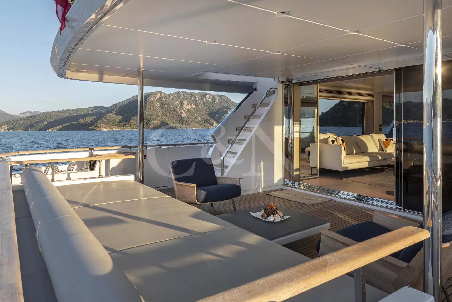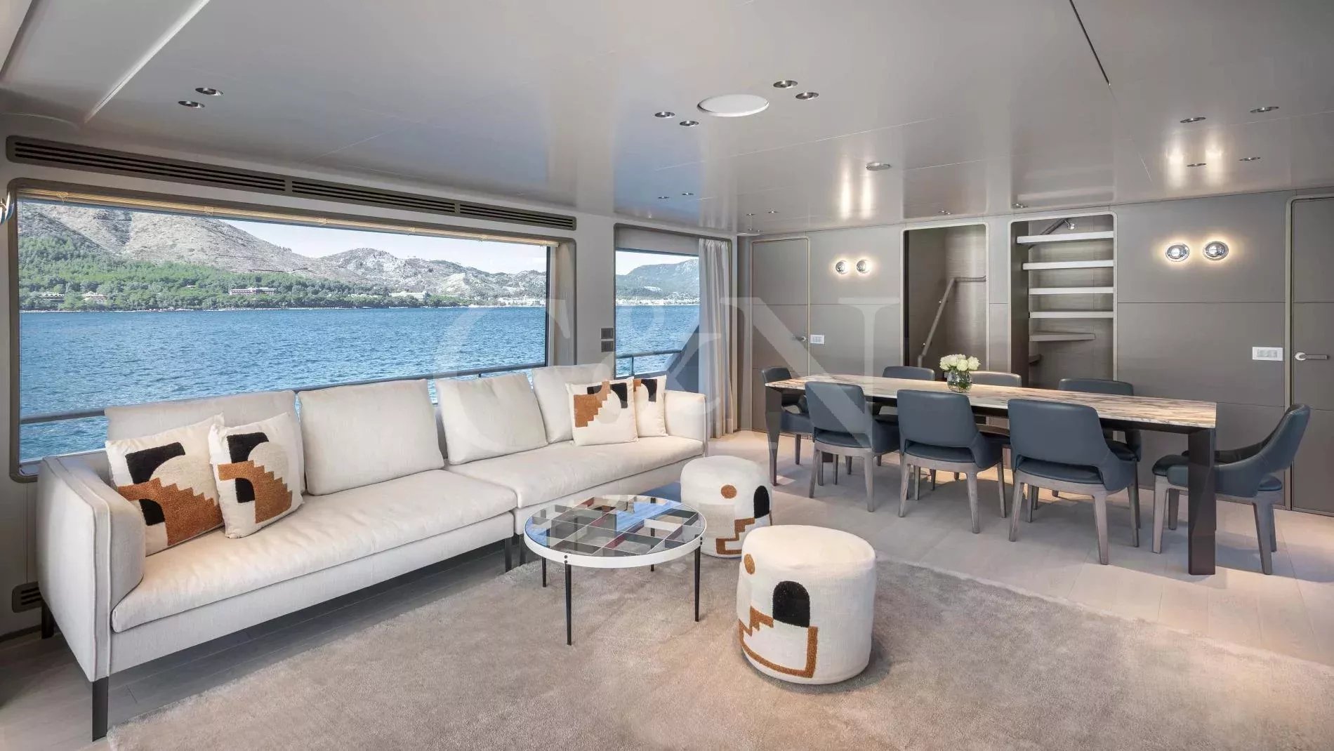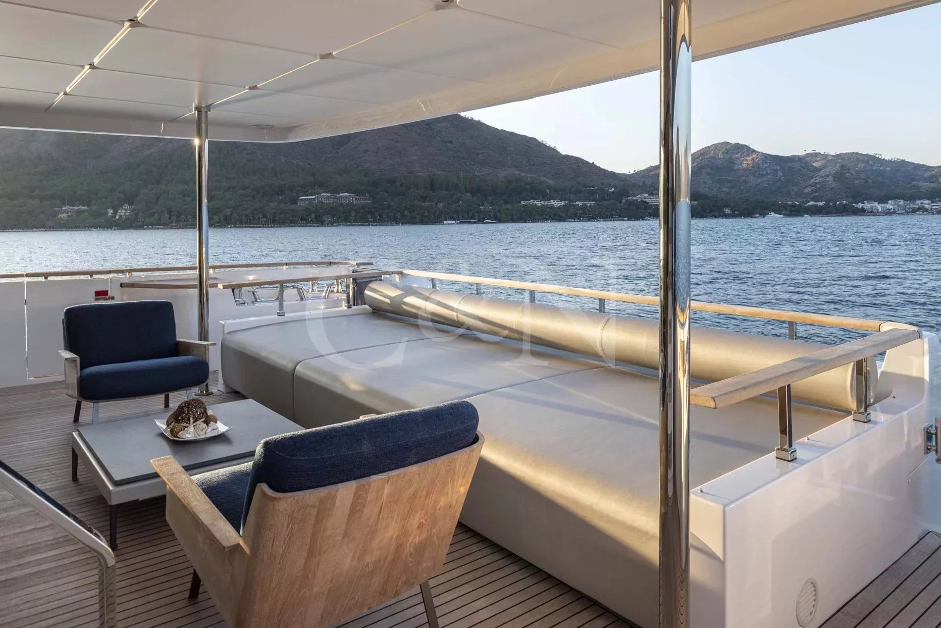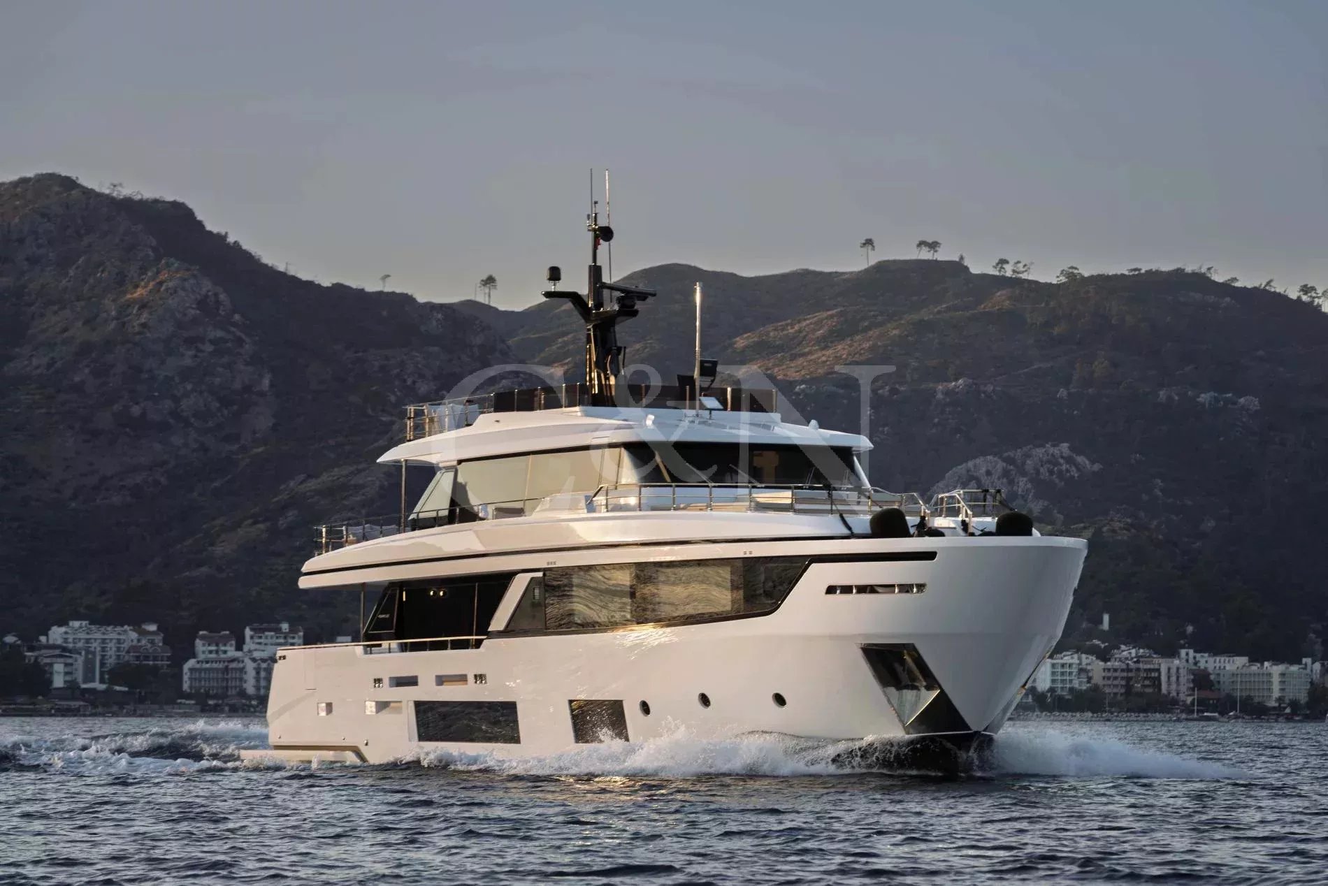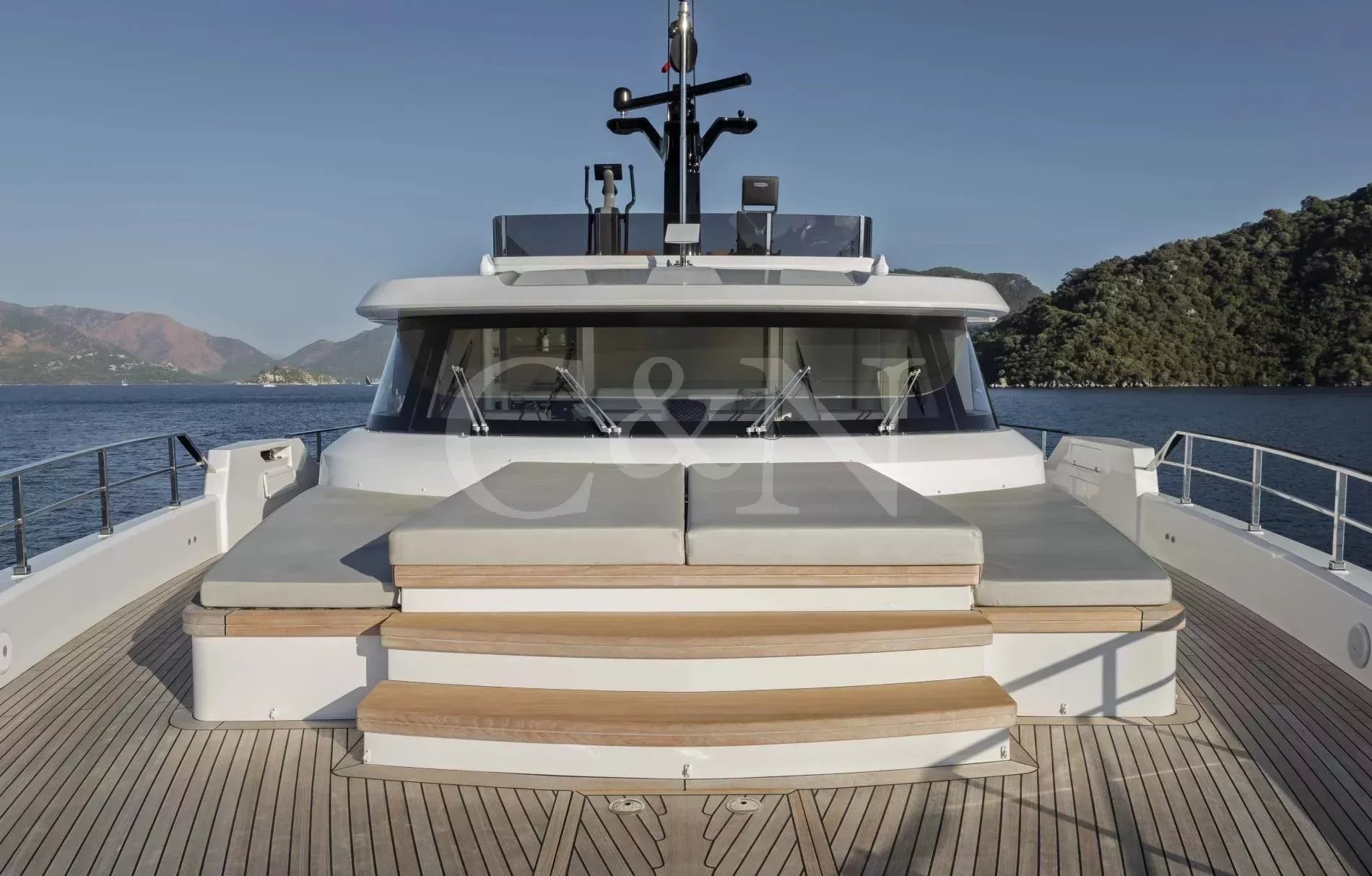Belle Ile is a 28.43-metre semi-custom motor yacht, and the twelfth hull of the Custom Line Navetta 30 series. Belle Ile is offered for sale in pristine condition. She is one of the most attractive yachts in her series, equipped with all of the top options and boasting a very impressive interior volume for a 90-foot yacht.This tri-deck was built for an experienced Owner, with many typical large-yacht features such as a full study, an on-deck Jacuzzi, brand new techno gym equipment on the sundeck, and an advanced entertainment system.Belle Ile is decorated with a modern and stylish interior, featuring a calming, neutral colour palette, wooden accents and pops of blue.The spacious main deck features a capacious main salon with spacious sofa seating and a formal interior dining setup. Her Owner’s suite is situated forward on the main deck. On the upper deck, the beautiful upper salon offers guests elevated ocean views and a relaxing place to unwind and entertain.Belle Ile can currently accommodate eight guests across her Owner's cabin and three lower-deck guest cabins. She boasts a full-beam Owner’s suite on the main deck, complete with large windows and a his and hers bathroom. Belle Ile has a customised layout on the lower deck, currently configured as two double cabins, one twin cabin and a separate study room, all with their own en suite bathrooms. The study room could easily be converted back to the fifth guest cabin under her new Ownership.Belle Ile is a trideck motor yacht, boasting a main deck, upper deck and a sundeck. On the main deck, a comfortable sofa seating area situated aft provides the perfect space to enjoy a morning coffee or an afternoon drink in the shade. Her upper deck features a formal outdoor dining setup, ideal for al fresco dining with a view, as well as her forward on-deck Jacuzzi, perfectly situated for soaking up beautiful views.A standout feature of Belle Ile’s exterior is the brand-new techno gym equipment situated on her beautiful sundeck, as well as a barbeque and sofa seating with panoramic ocean views. Her exterior is well-covered, with a partially shaded main deck and upper deck a removable Bimini shade on her sundeck.Belle Ile features an aft tender garage to house her 460 Williams tender. She also boasts many advanced options such as a high-quality entertainment system, at-anchor stabilisers, and air conditioning throughout.Belle Ile is one of the most attractive 30-metre yachts available on the market, with an attractive price, great volume and in turnkey condition.