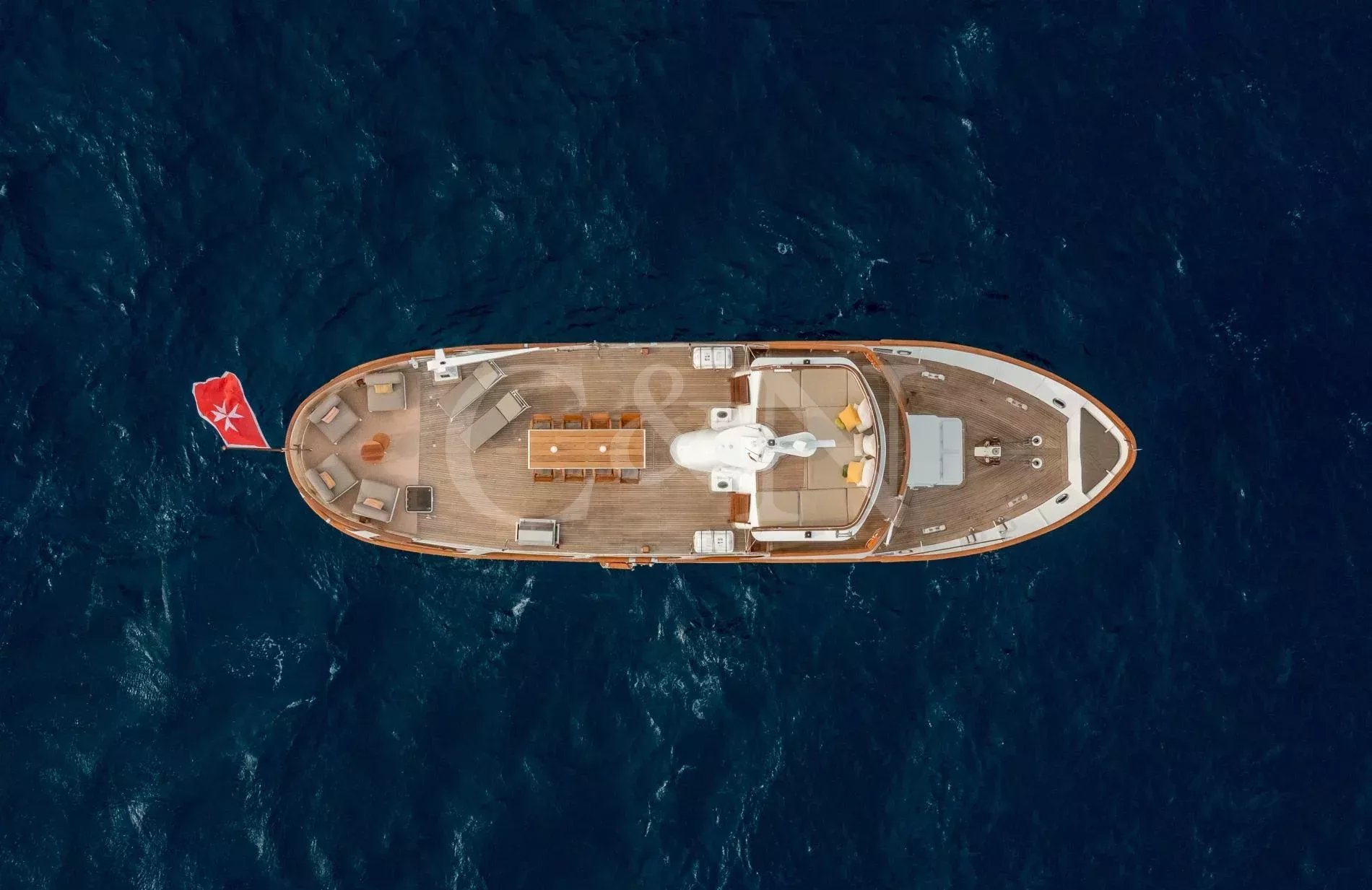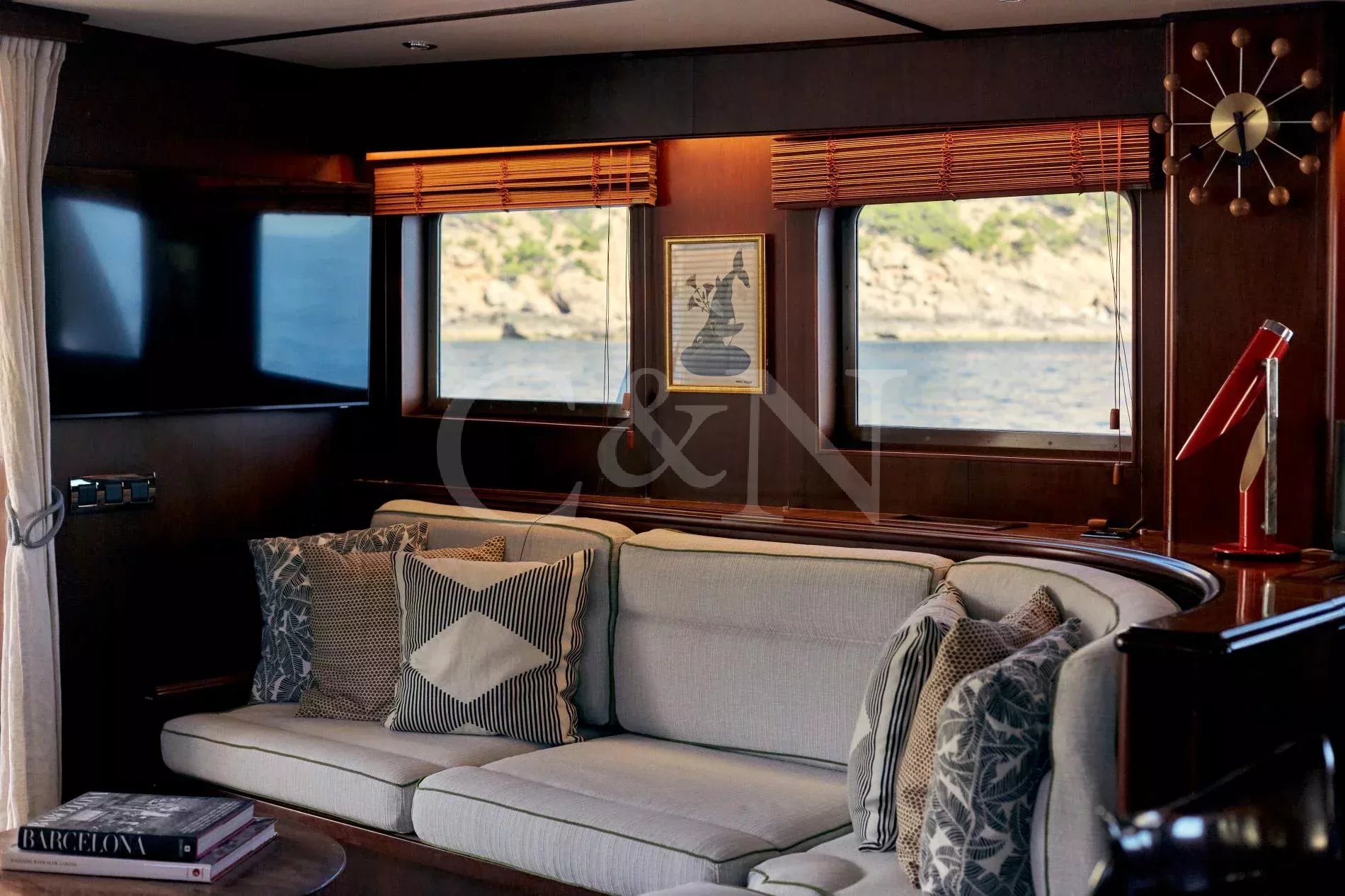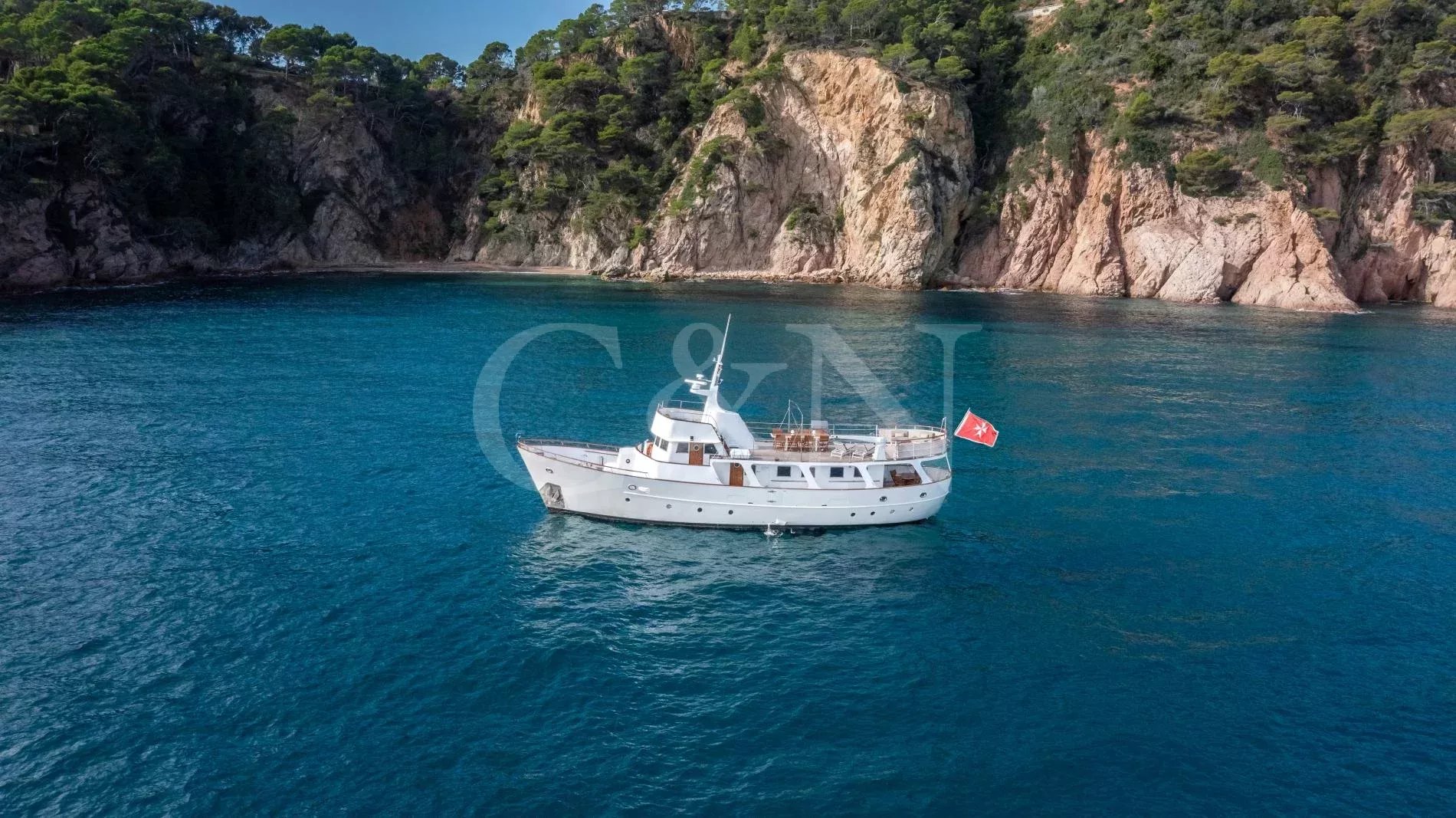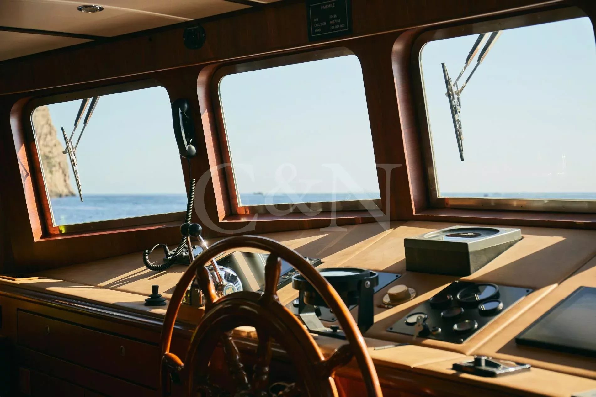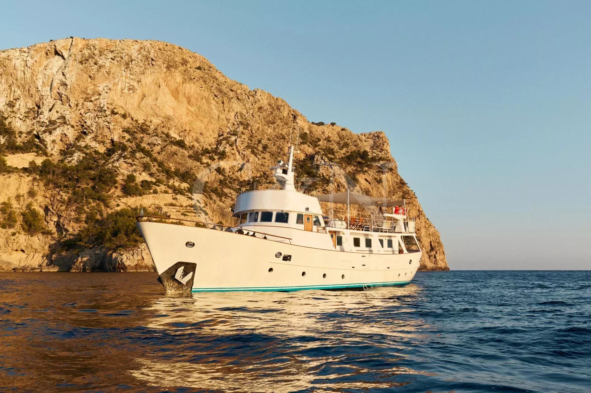 Originally built in 1962 as a fishing vessel and reborn as a luxury yacht, Fairmile seamlessly marries heritage with contemporary style. Her extensive 2.5-year refit transformed both her mechanics and interior, offering a refined experience for those seeking understated charm and comfort at sea.Fairmile offers a surprising amount of space for a yacht in her class. The expansive fly deck is a highlight, featuring a barbacoa, lounge area, and a dining table that accommodates up to ten guests. Additional seating can be found on the lower aft deck and at the forward bow, offering guests the flexibility to enjoy the outdoors from various perspectives.Her contemporary interior redesign features clean lines and welcoming textures. The main saloon includes a sofa with modern fabrics, a bar area, and an array of premium features: a Climadiff wine fridge, Samsung Q60AA 43” TV, Nespresso Delonghi machine, and an ice maker. A pair of large Sonos speakers ensure atmosphere is easily set, whether for quiet evenings or lively gatherings.Fairmile accommodates six guests across three cabins: The master cabin offers a double bed, en-suite bathroom, and a Samsung 7 Series 43” TV.The starboard guest cabin includes a double bed, en-suite, and Samsung 7 Series 40” TV.The portside guest cabin features two single beds convertible into one large bed, an ensuite, and a Samsung 5 Series 32” TV. Each cabin is appointed with understated comfort, making Fairmile ideal for families or small charter groups.Fairmile’s Gardner engines, meticulously rebuilt during the refit, have just 600 hours of use and are known for their robust reliability and efficiency. She boasts an impressive 2,500 nautical mile range, and her fuel consumption is notably low, making her highly economical to operate. A BRIG F500 tender with a 75hp outboard complements her capabilities.