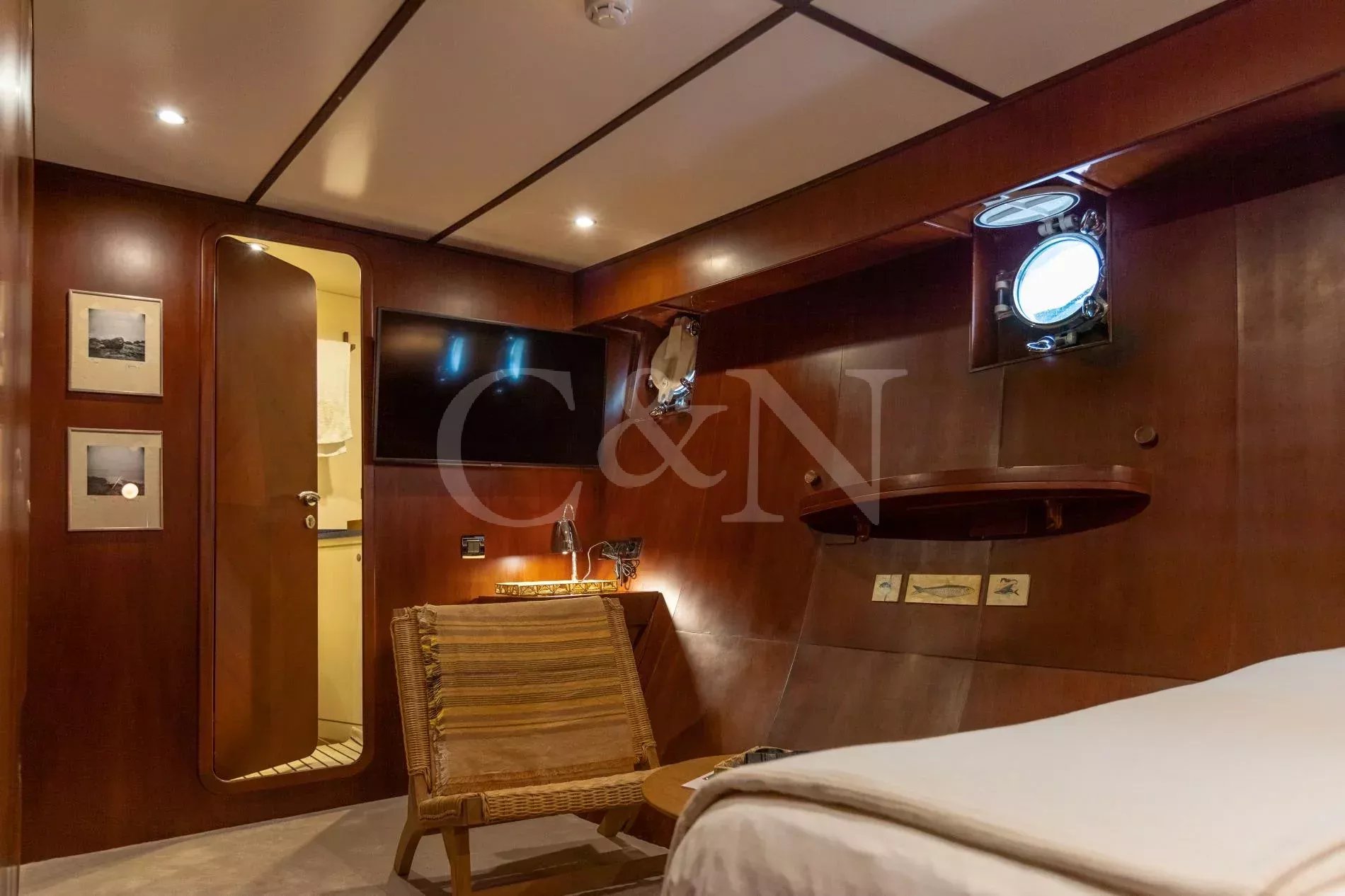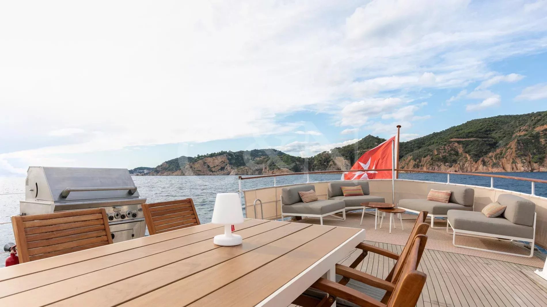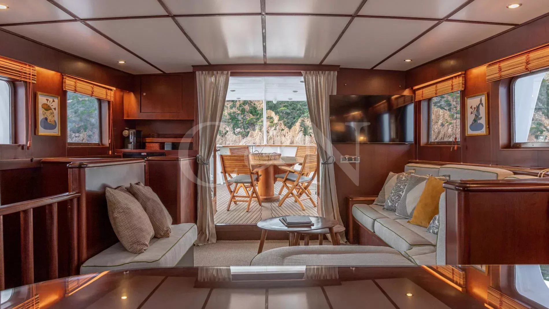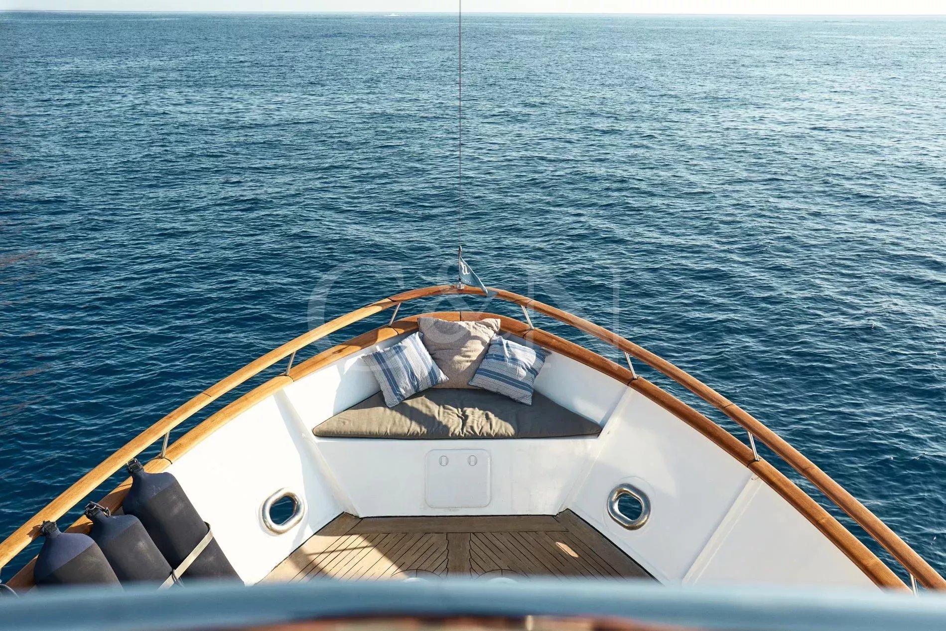 Originally built in 1962 as a fishing vessel and reborn as a luxury yacht, Fairmile seamlessly marries heritage with contemporary style. Her extensive 2.5-year refit transformed both her mechanics and interior, offering a refined experience for those seeking understated charm and comfort at sea.Fairmile offers a surprising amount of space for a yacht in her class. The expansive fly deck is a highlight, featuring a barbacoa, lounge area, and a dining table that accommodates up to ten guests. Additional seating can be found on the lower aft deck and at the forward bow, offering guests the flexibility to enjoy the outdoors from various perspectives.Her contemporary interior redesign features clean lines and welcoming textures. The main saloon includes a sofa with modern fabrics, a bar area, and an array of premium features: a Climadiff wine fridge, Samsung Q60AA 43” TV, Nespresso Delonghi machine, and an ice maker. A pair of large Sonos speakers ensure atmosphere is easily set, whether for quiet evenings or lively gatherings.Fairmile accommodates six guests across three cabins: The master cabin offers a double bed, en-suite bathroom, and a Samsung 7 Series 43” TV.The starboard guest cabin includes a double bed, en-suite, and Samsung 7 Series 40” TV.The portside guest cabin features two single beds convertible into one large bed, an ensuite, and a Samsung 5 Series 32” TV. Each cabin is appointed with understated comfort, making Fairmile ideal for families or small charter groups.Fairmile’s Gardner engines, meticulously rebuilt during the refit, have just 600 hours of use and are known for their robust reliability and efficiency. She boasts an impressive 2,500 nautical mile range, and her fuel consumption is notably low, making her highly economical to operate. A BRIG F500 tender with a 75hp outboard complements her capabilities.