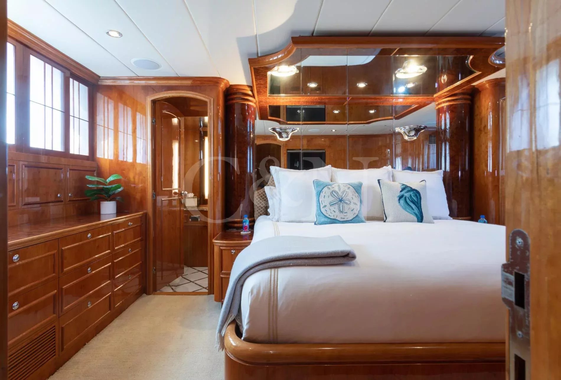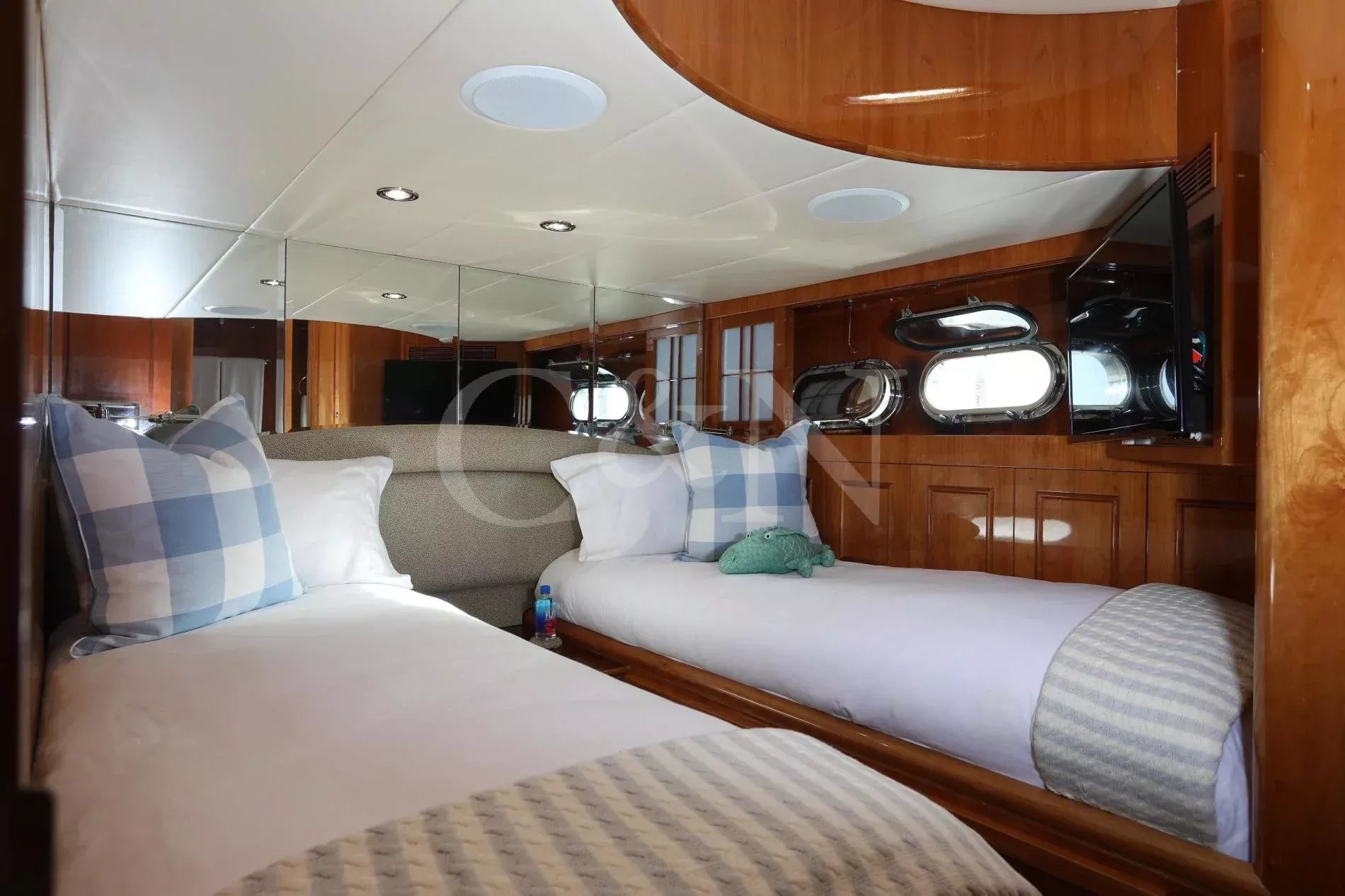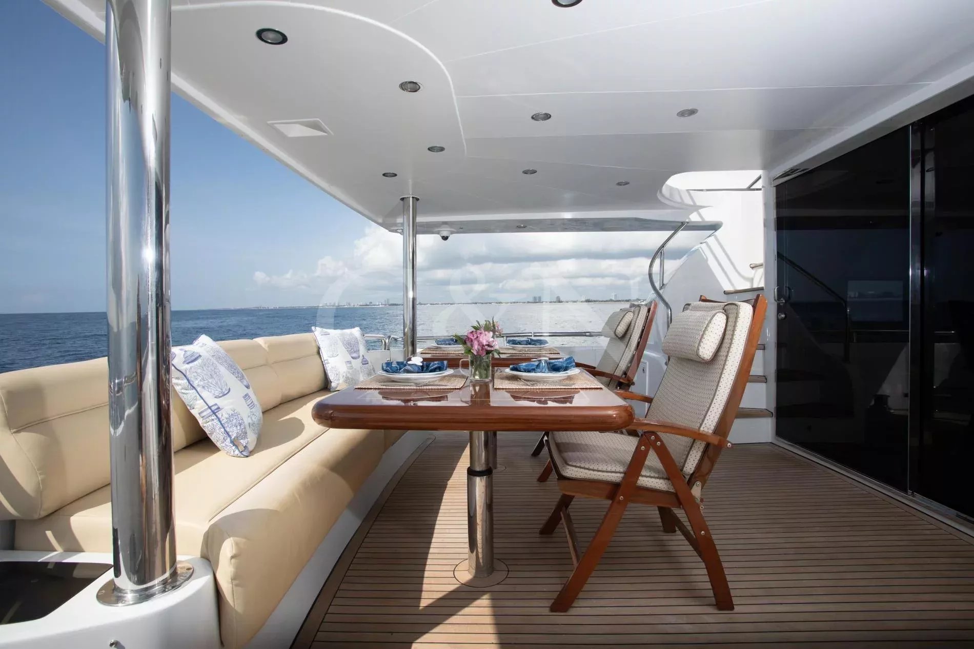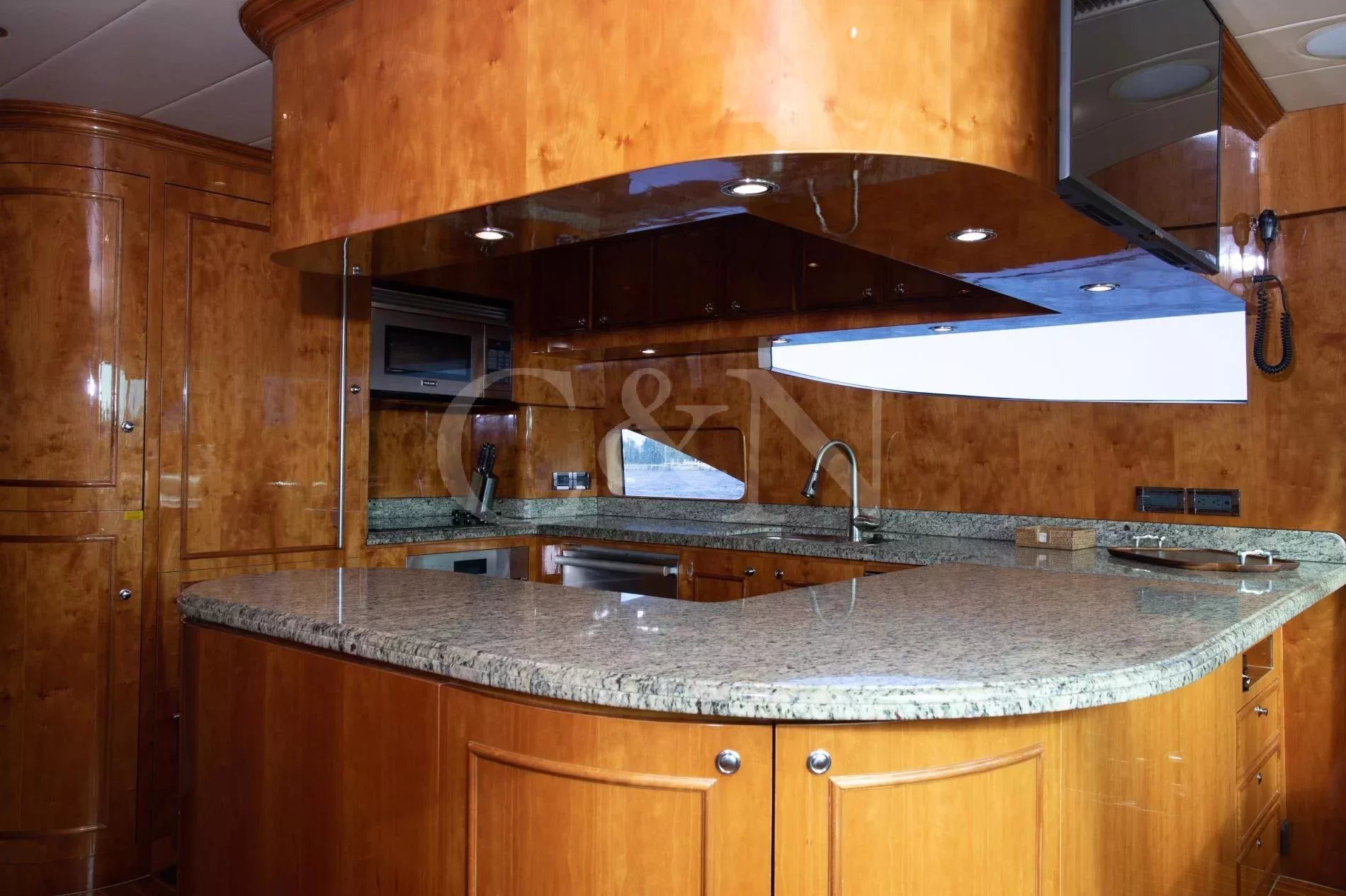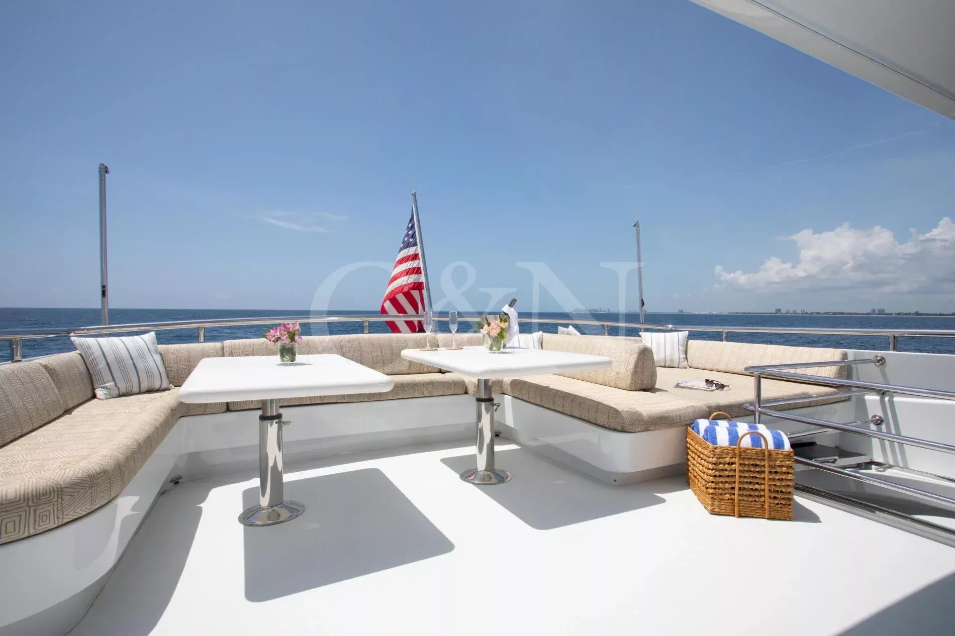 Rays is a rare example of a Horizon Elegance 82 with an enclosed, fully air-conditioned flybridge, offering all-weather comfort and long-range capability. Privately owned and well maintained, she joins the market fresh from a 2025 repaint and a suite of winter upgrades.A large sky lounge is a standout feature, fully enclosed and air-conditioned for year-round enjoyment. Sliding glass doors lead to an open aft deck complete with a BBQ, wet bar, and al fresco dining area. A second al fresco dining space is found below, while walkaround decks lead forward to a sun pad on the bow. A large extended swim platform offers easy water access and discreet entry to crew areas.High-gloss cherry cabinetry runs throughout a lightfilled interior. The main salon offers wraparound seating, panoramic windows, a 50” TV, and a full wet bar. A country-style galley features granite countertops, Sub-Zero appliances, and a cosy dinette for six.Rays sleeps six guests across three en suite cabins: a full-beam master with king bed, walk-in wardrobe, and his-and-hers bathroom separated by a marble shower; a VIP cabin with queen bed; and a convertible twin. All bathrooms are finished in travertine marble, Head Hunter heads, and Grohe fixtures.Twin 1,550hp CAT C-30 engines provide robust, reliable performance with a top speed of 22 knots and an economical 10-knot speed that burns just 10 gallons per hour. She’s equipped with ABT Trac stabilisers, hydraulic bow and stern thrusters, and has undergone significant upgrades across her mechanical, electrical, A/C, and watermaker systems. Her most recent yard period included a full repaint and a new Kohler generator.