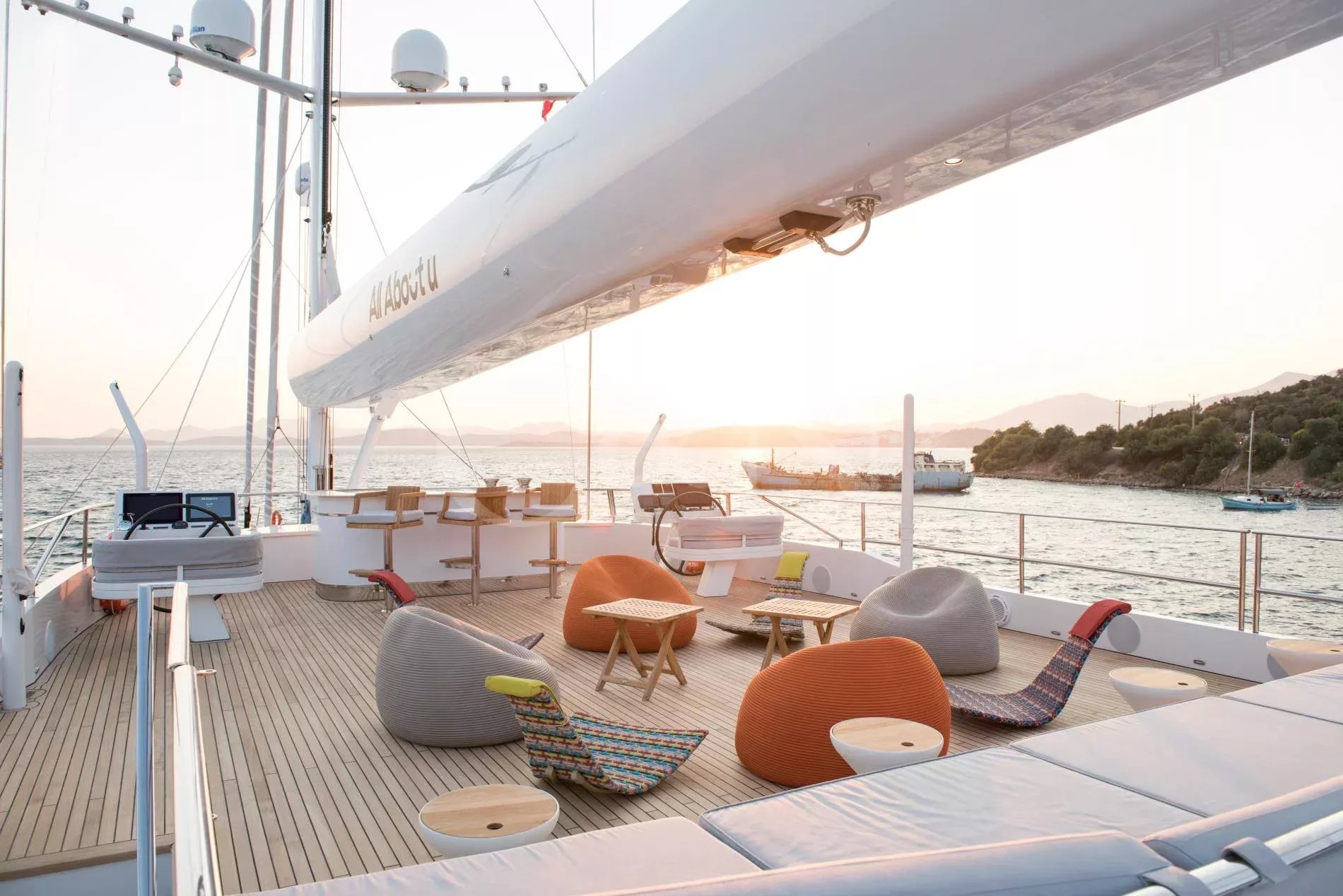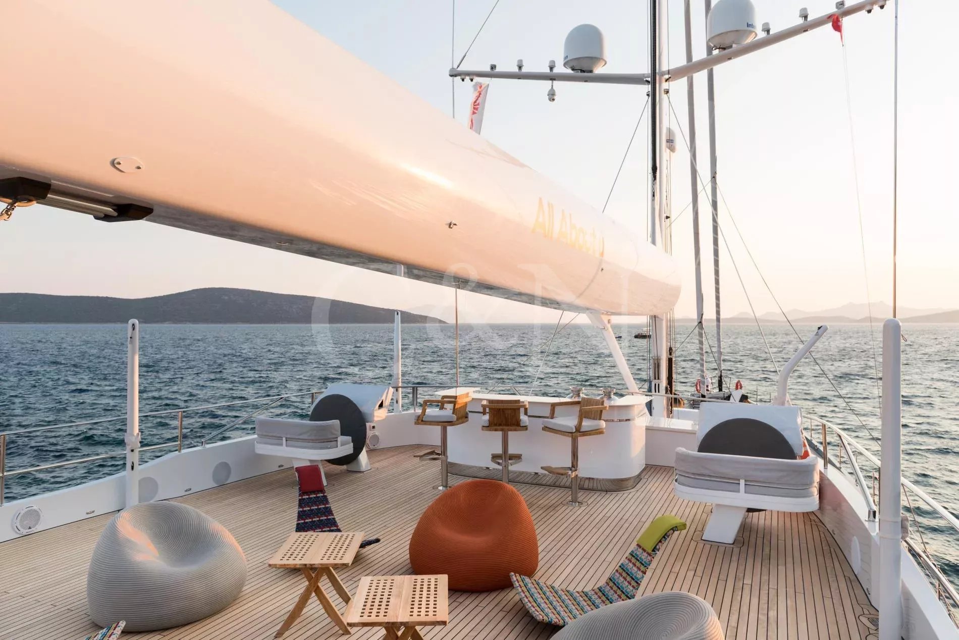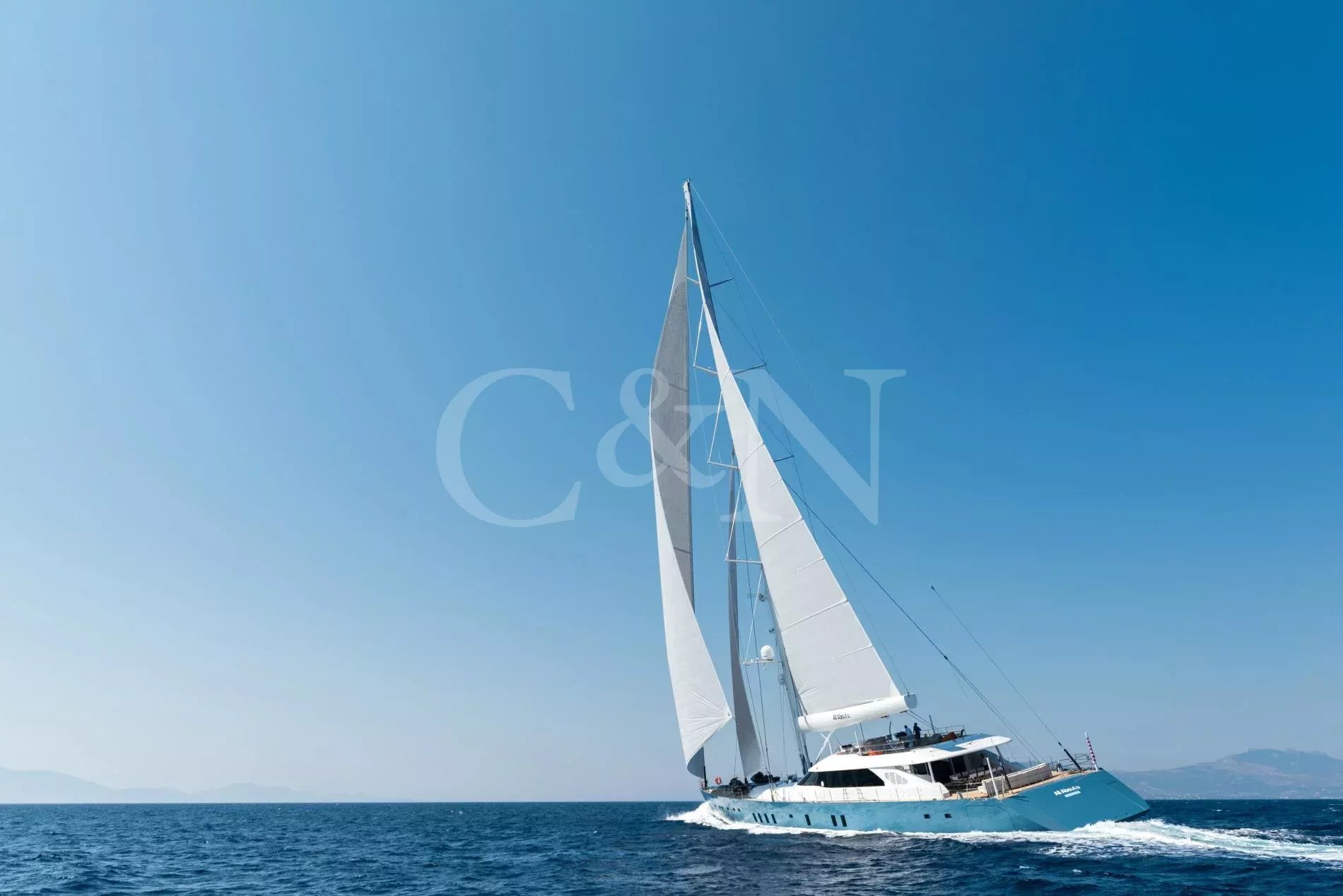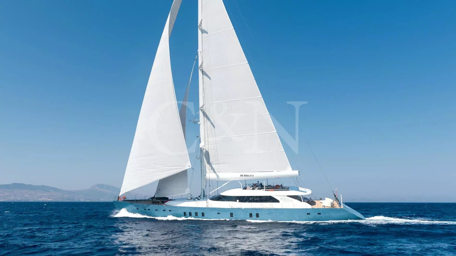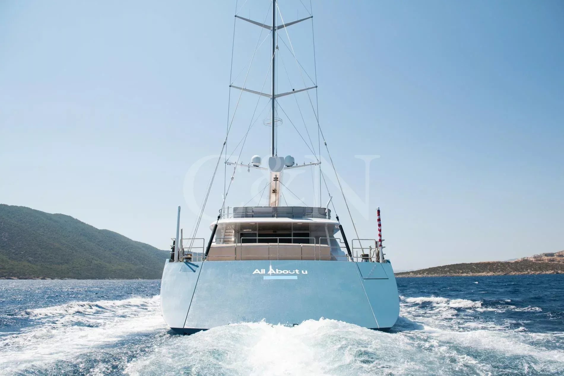 Built by Ada Yacht Works and designed by Ginton Naval Architects, All About U blends the grace of a sailing yacht with the power, and comfort of a motor yacht. Delivered in 2018 and presented in immaculate condition, she offers modern interiors by CT Mimarlik, expansive decks and a high-spec sail plan featuring Lewmar captive winches and Doyle sails. With a steel hull, commercial compliance and generous guest capacity, All About U is equally suited for private use or charter operation.With expansive open-plan decks, All About U is built for life outdoors. A vast 65-square-metre flybridge is made for entertaining, complete with 360-degree views, a sit-up bar, sunpads, lounge seating, twin helm stations, fridge, and ice maker. Below, the main deck aft features a fan of sunpads alongside a dining table shaded by the flybridge overhang. At the stern, the transom door folds down to reveal a 26-square-metre beach club with pop-up parasols and a swim ladder for easy access to the sea.Inside, All About U is bright, modern, and pared-back with wood flooring throughout. Wraparound windows bathe the main salon in natural light, offering panoramic views and a sense of openness. The lounge, dining area, and wheelhouse are arranged as a single, continuous space, with optional partitions to separate bridge operations from the guest areas. The main salon is also home to a built-in wine cooler and large flatscreen TV, while a spacious galley with central island and adjacent crew pantry ensures smooth, efficient service even when hosting larger groups.All About U accommodates 12 guests in a well-balanced layout. A full-beam master suite features a large walk-in wardrobe with a central island for jewellery and watch storage. A full-beam VIP cabin and four large double guest cabins complete the arrangement, each with an en suite. Additional cabins sleep a crew of 10.All About U is powered by twin CAT C18 engines, delivering a cruising speed of 12 knots and a top speed of 14.8 knots. With a range of 3,000 nautical miles at 10 knots, she offers reliable cruising performance. Classified by RINA, she is fully commercially compliant and charter ready.